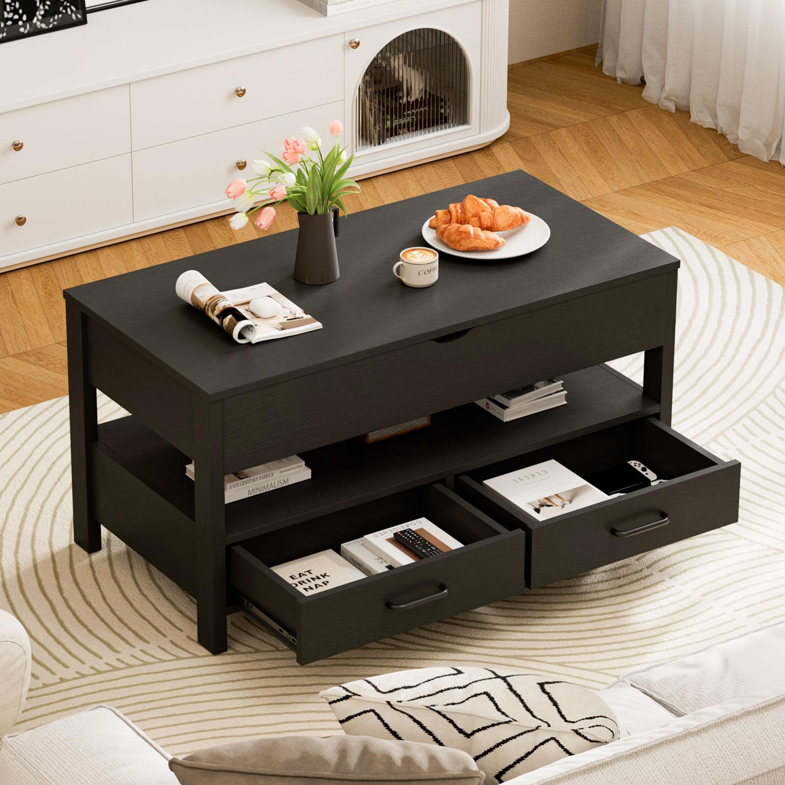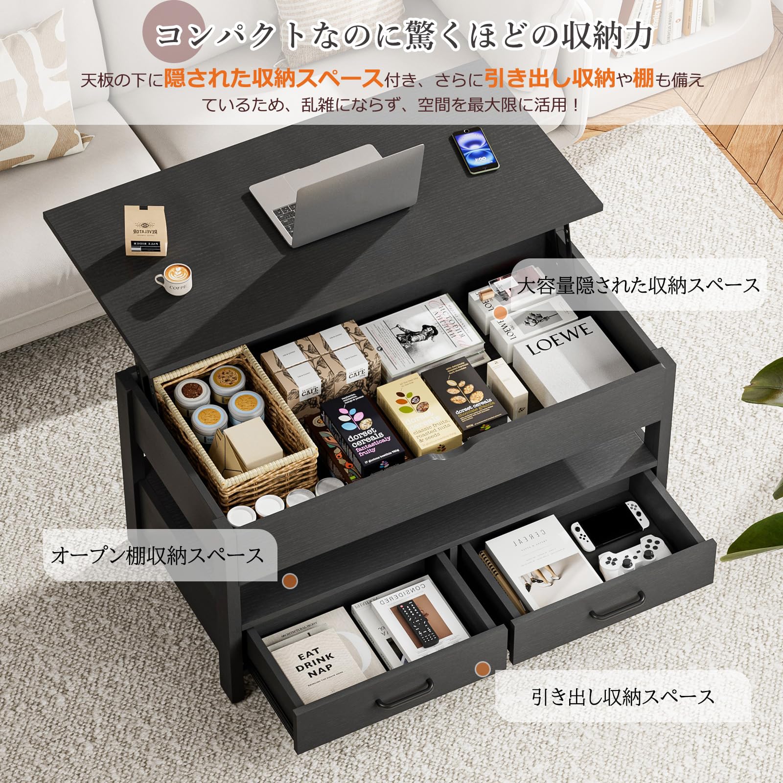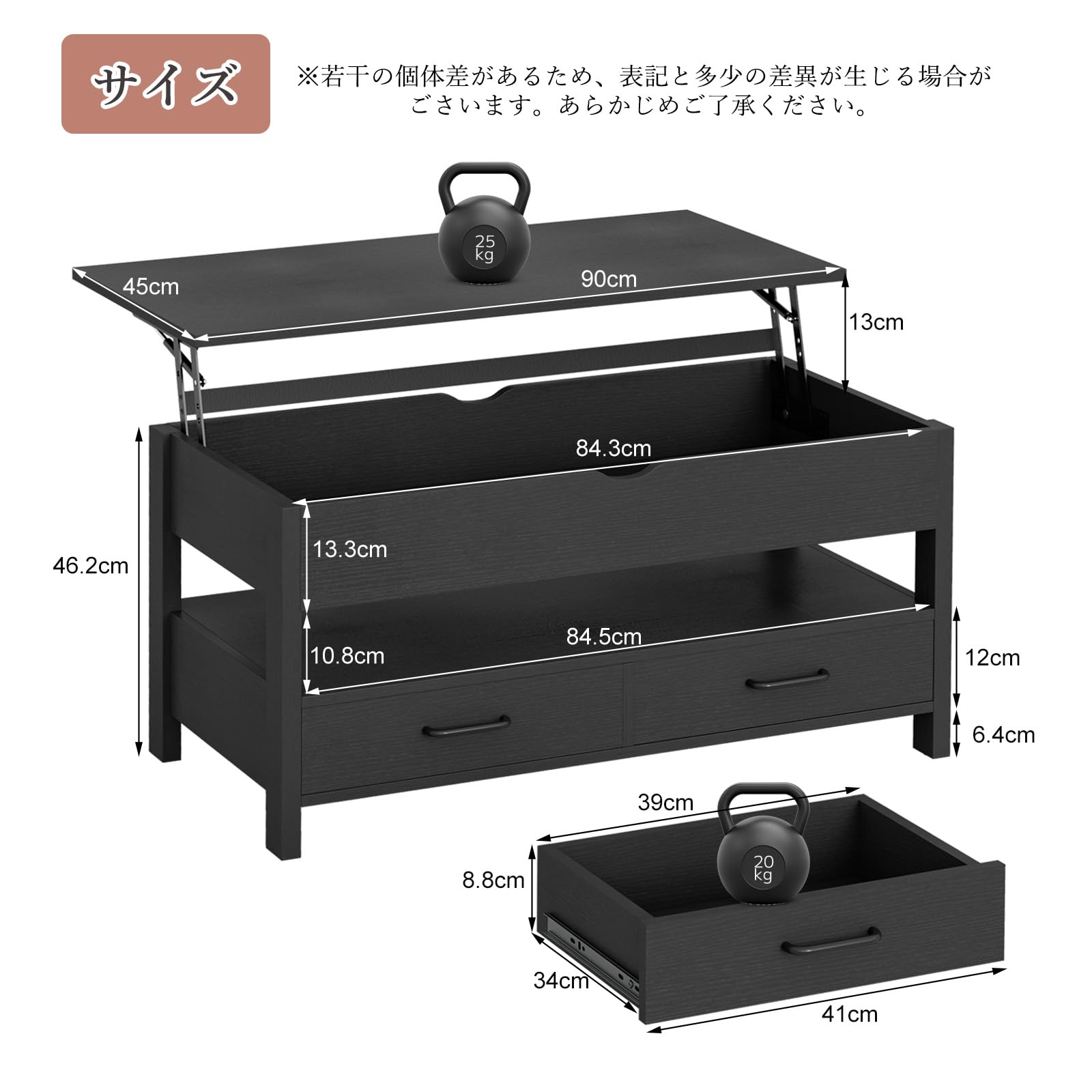 IKIFLY ローテーブル 昇降式 木製 センターテーブル 引き出し収納付き コーヒーテーブル 大容量収納リビングテーブル 高さ調整リフティングローテーブル 簡単開閉 リビングルーム オフィス用 ホンムオフィステーブル 在宅勤務 食事一人暮らし 幅90×奥行45×高さ46-59cm (ブラック)