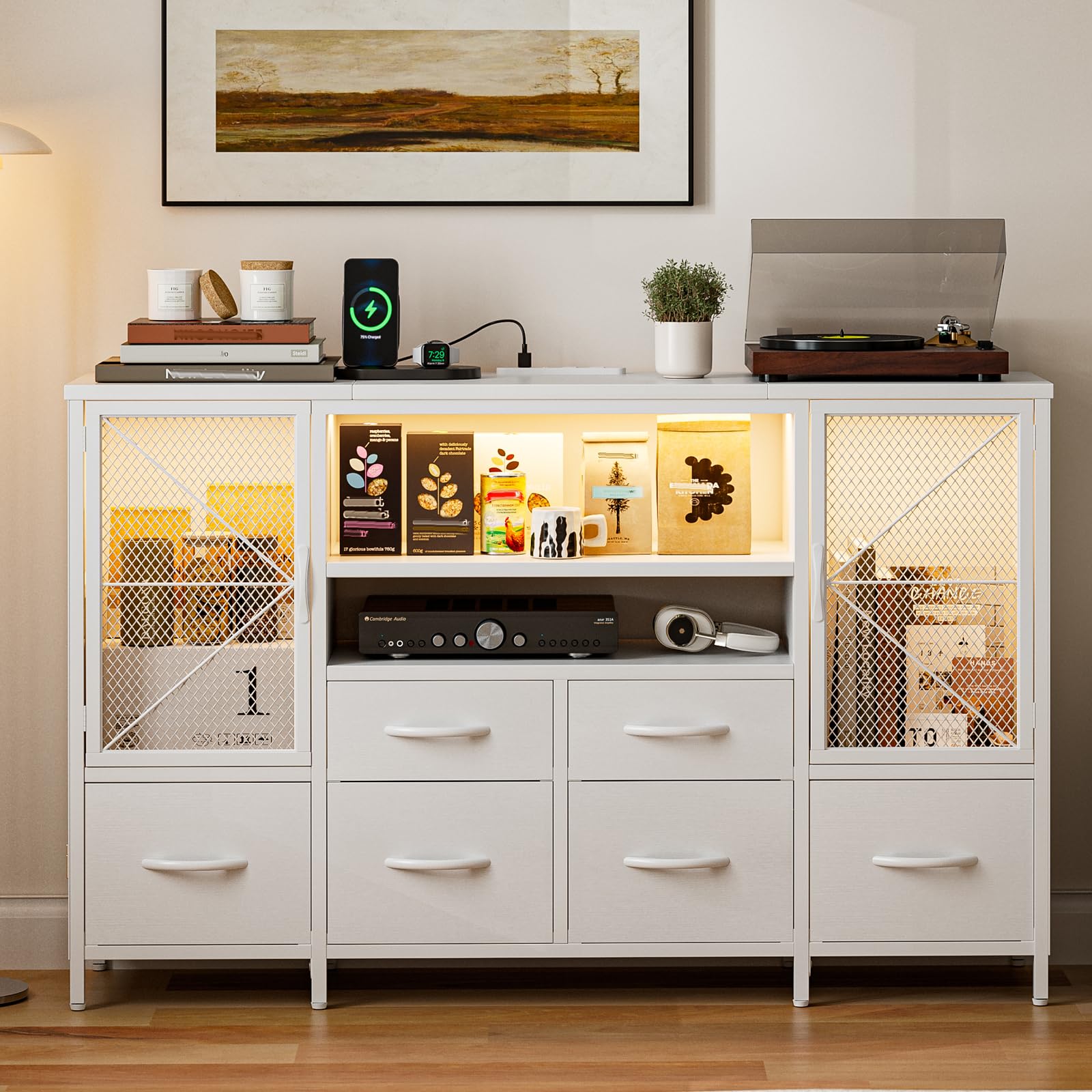 IKIFLY チェスト収納 タンス 棚付き 箪笥リビング収納チェスト LEDライト付き テレビボード おしゃれ 収納ケース 引き出し 大容量 USBポート付き洋服タンス 布製 玄関キャビネット 収納ボックス マルチチェス 整理タンス 寝室収納 一人暮らし【幅140×奥行30×高さ82cm】ホワイト