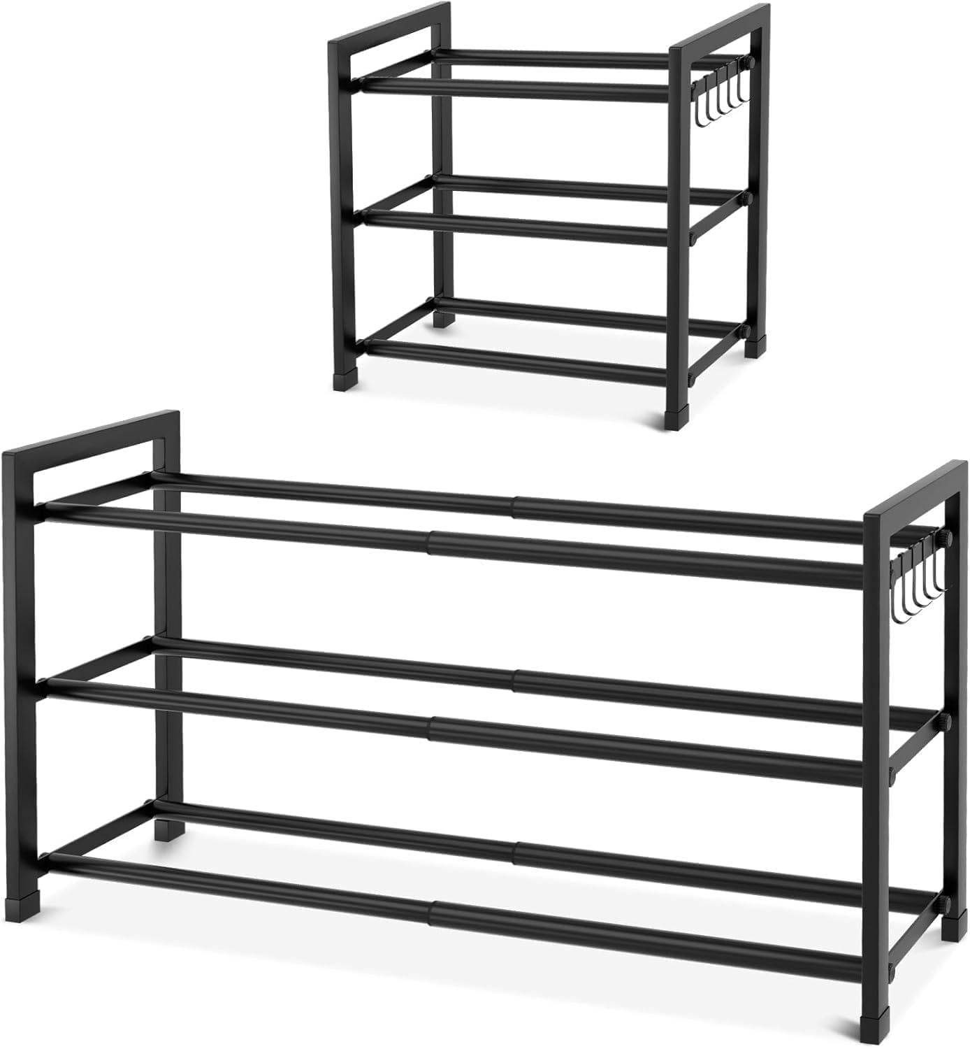サムコス シューズラック靴収納 靴棚 3段 伸縮式 省スペース 玄関収納 下駄箱 大容量6~12足 靴入れ 鉄パイプ 組立簡単 工具不要 45cmから83cm伸縮 アパート 廊下用 (ブラック)