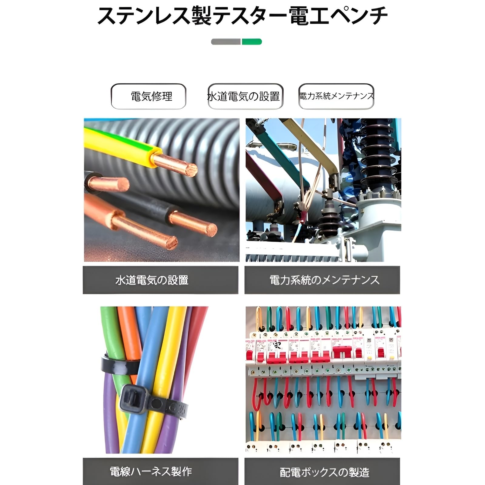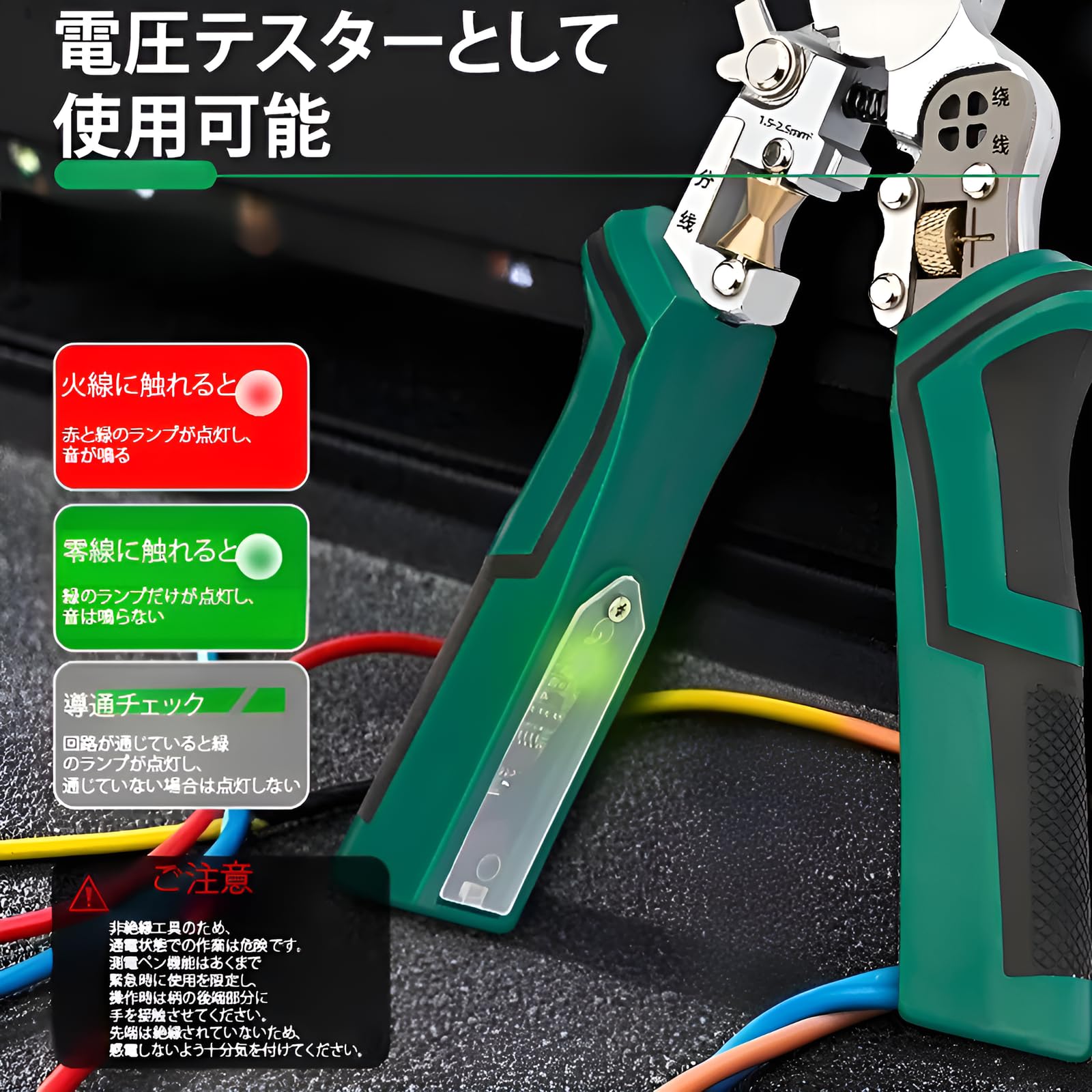 1. 10 機能統合 × 作業効率最大化:0.5mm²~16mm² まで 1 台で対応 ワイヤーストリッピング、ケーブルカット、ボルト捻じりなど 10 種の機能を搭載。精密ストリッパー溝で 0.5mm²~16mm² の電線径を正確に処理。スプリング式折りたたみ構造でポケットサイズ(収納時約 12cm)に収まり、防滑グリップ付きハンドルでハンドルからの滑りを防止。現場での工具交換時間を 80% 削減する実績あり。2. SK5 高炭素鋼ブレード ×3000V 耐圧設計:プロ向けの耐久性と安全性 硬度 HRC58 の SK5 高炭素鋼ブレードが硬質銅線をスムーズに切断。10,000 回開閉テスト合格のヒンジ構造と 3000V 耐圧の絶縁ハンドルで感電リスクをゼロに。JIS C9711 規格適合で信頼性を確保し、耐油性シリコンバッファーにより工具寿命を延長。3. 人体工学 × 軽量デザイン:長時間作業でも疲れにくい 3D ラバーコーティングされた握り部が最大 30N の把持力を発揮し、親指操作のクイックロック機構で片手での展開・閉鎖が可能。重量 220g の軽量化設計で、左利き用モデル(別売)も揃え、ユーザーニーズに合わせた最適な操作性を実現。4. マルチシーン対応 × 便利なアクセサリー:DIY から産業現場まで 家庭の配線工事、オフィスの設備保守、工場のメンテナンスなど多様なシーンで活躍。付属の 15cm メジャースケールで電線長を即時計測、マグネットトレイがネジ類の紛失を防ぐ。暗所での作業にも反射ストライプが視認性を向上。5. メンテナンスフリー × 長期保証:耐久性のある設計 自己研削式ブレードが常に鋭利な状態を維持し、分解洗浄可能な構造で金属粉の蓄積を防止。腐食・摩耗に強い表面処理で、過酷な環境下でも安定した性能を発揮。品質保証期間中は無料保守サービスを提供。【製品仕様】製品名:テスターワイヤーストリッパー【主要材質】ブレード材質:マンガン鋼