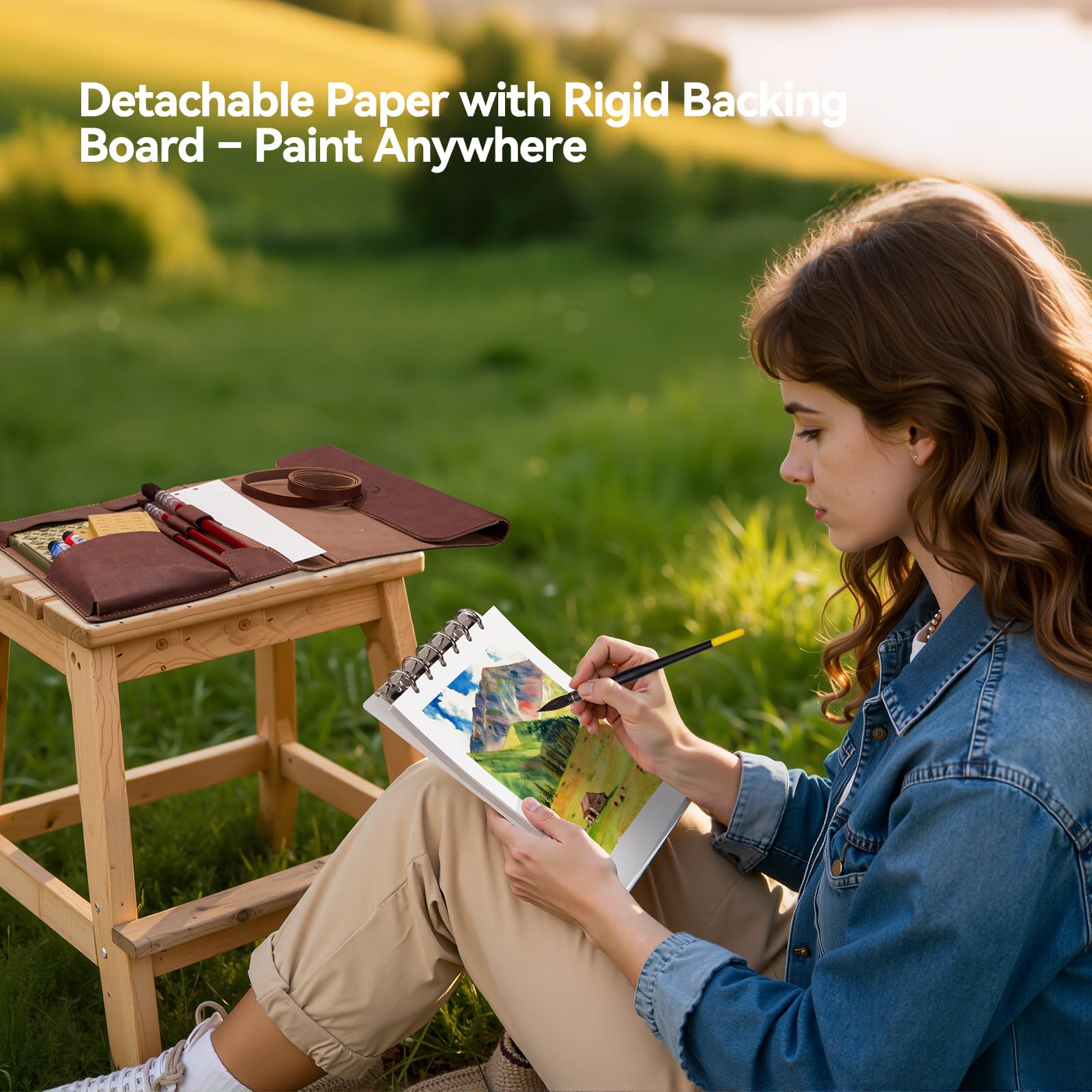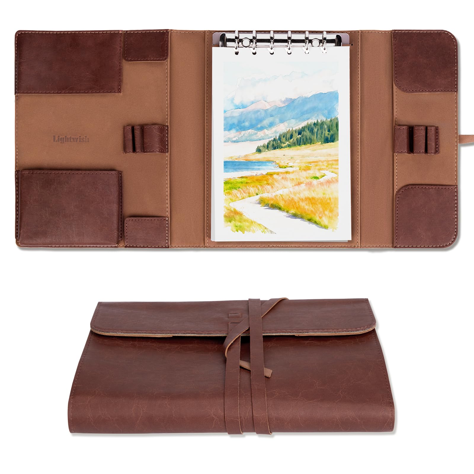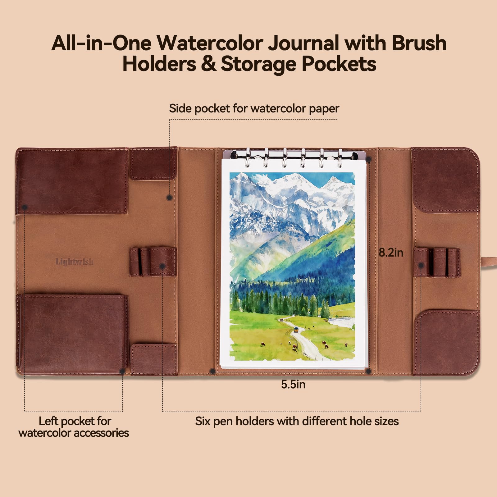 LIGHTWISH 水彩パッド - A5 20枚 綿100% 300GSM コールドプレス紙 | 裏板で取り外し可能 | オールインワンのトラベル水彩日記帳 ブラシホルダー&収納ポケット付き