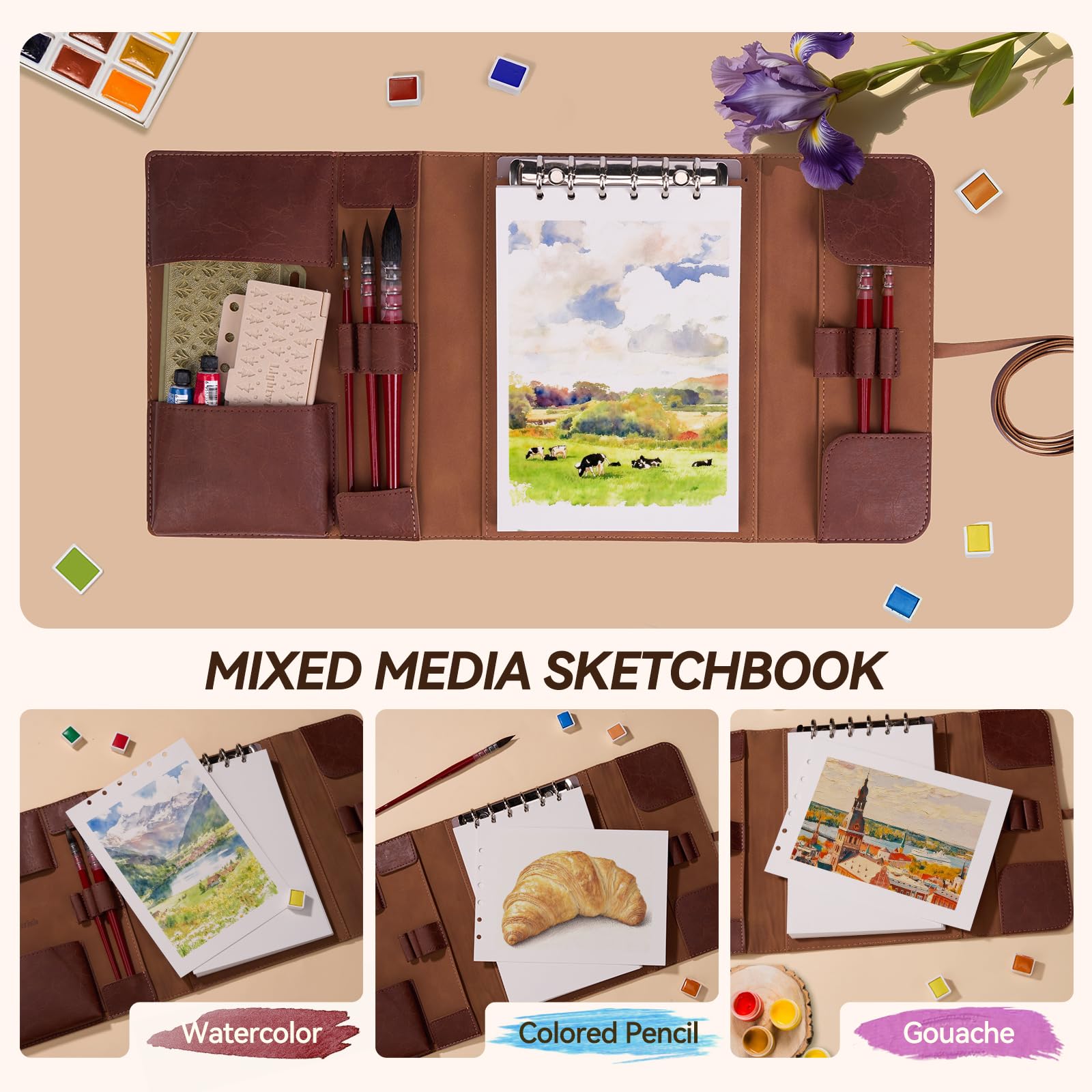 オールインワンの水彩日記帳、ブラシホルダー&収納ポケット付き:旅行用水彩キットがここにあります! このA5水彩パッドには、あらゆるサイズのブラシに対応する6つの万能ブラシホルダー(各サイドに3つ)が付いています。 専用の左ポケットには、小さな水彩絵の具、鉛筆、チューブペイントがぴったり収まり、サイドポケットには追加の水彩紙シートを収納できます。 このオールインワンデザインは、アーティストへのギフトに最適で、都市スケッチに最適なスケッチブックです。