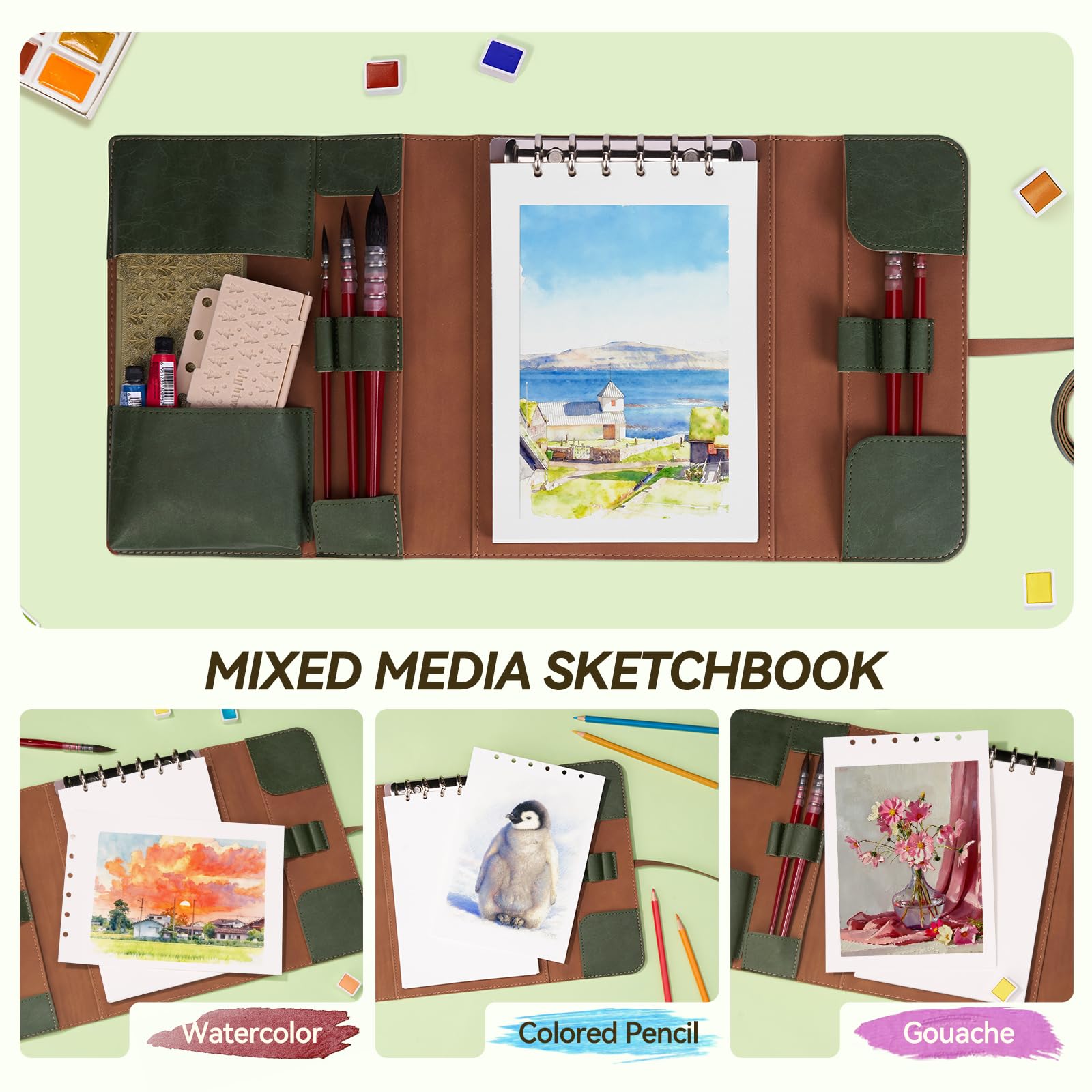オールインワンの水彩日記帳、ブラシホルダー&収納ポケット付き:旅行用水彩キットがここにあります! このA5水彩パッドには、あらゆるサイズのブラシに対応する6つの万能ブラシホルダー(各サイドに3つ)が付いています。 専用の左ポケットには、小さな水彩絵の具、鉛筆、チューブペイントがぴったり収まり、サイドポケットには追加の水彩紙シートを収納できます。 このオールインワンデザインは、アーティストへのギフトに最適で、都市スケッチに最適なスケッチブックです。