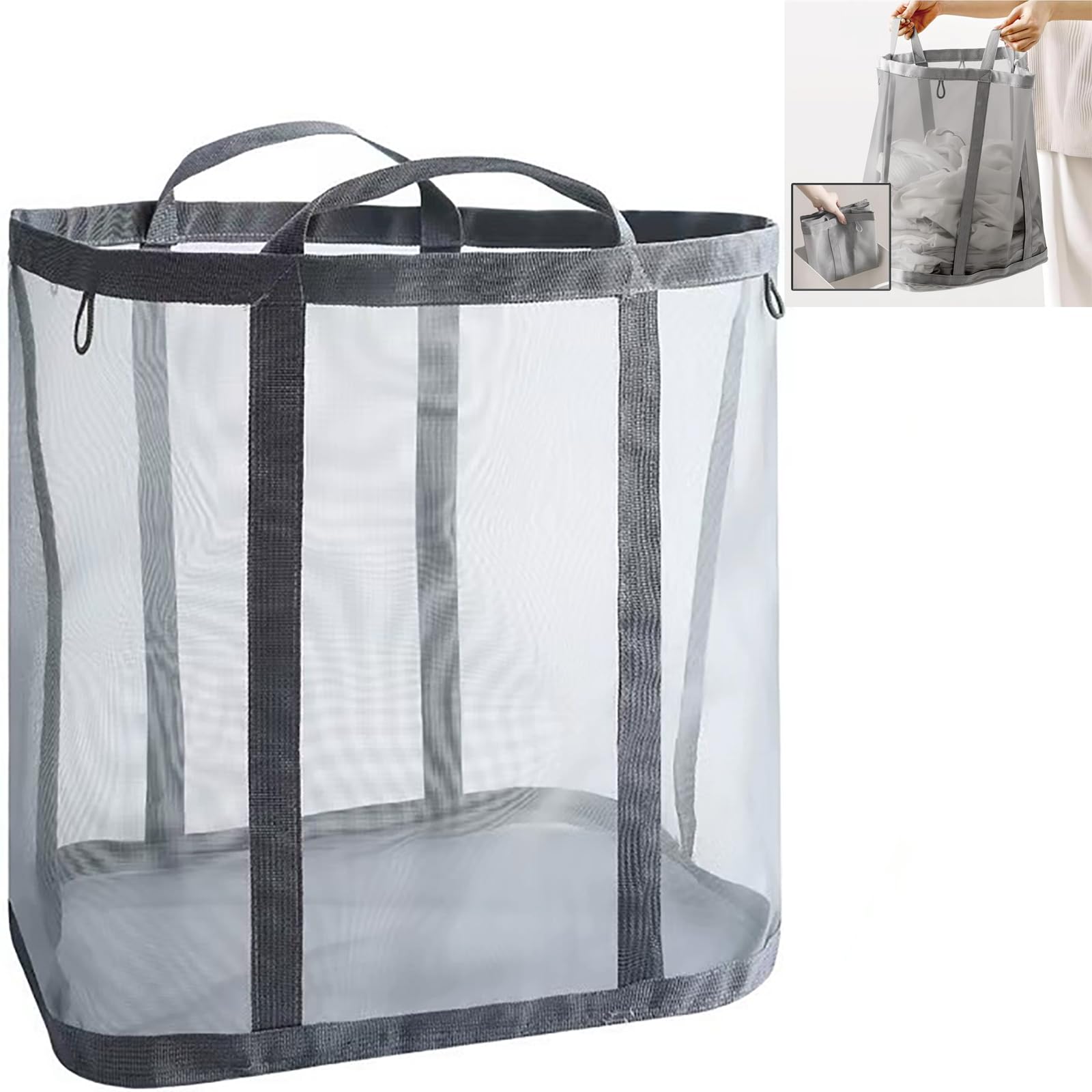 ランドリーバッグ ランドリーバスケット 収納バスケット メッシュバッグ 大容量 折りたたみ 通気性 取っ手付き メッシュ 軽量 持ち運び簡単 丈夫 壁掛け ランドリー収納 家庭用 旅行 (グレー)
