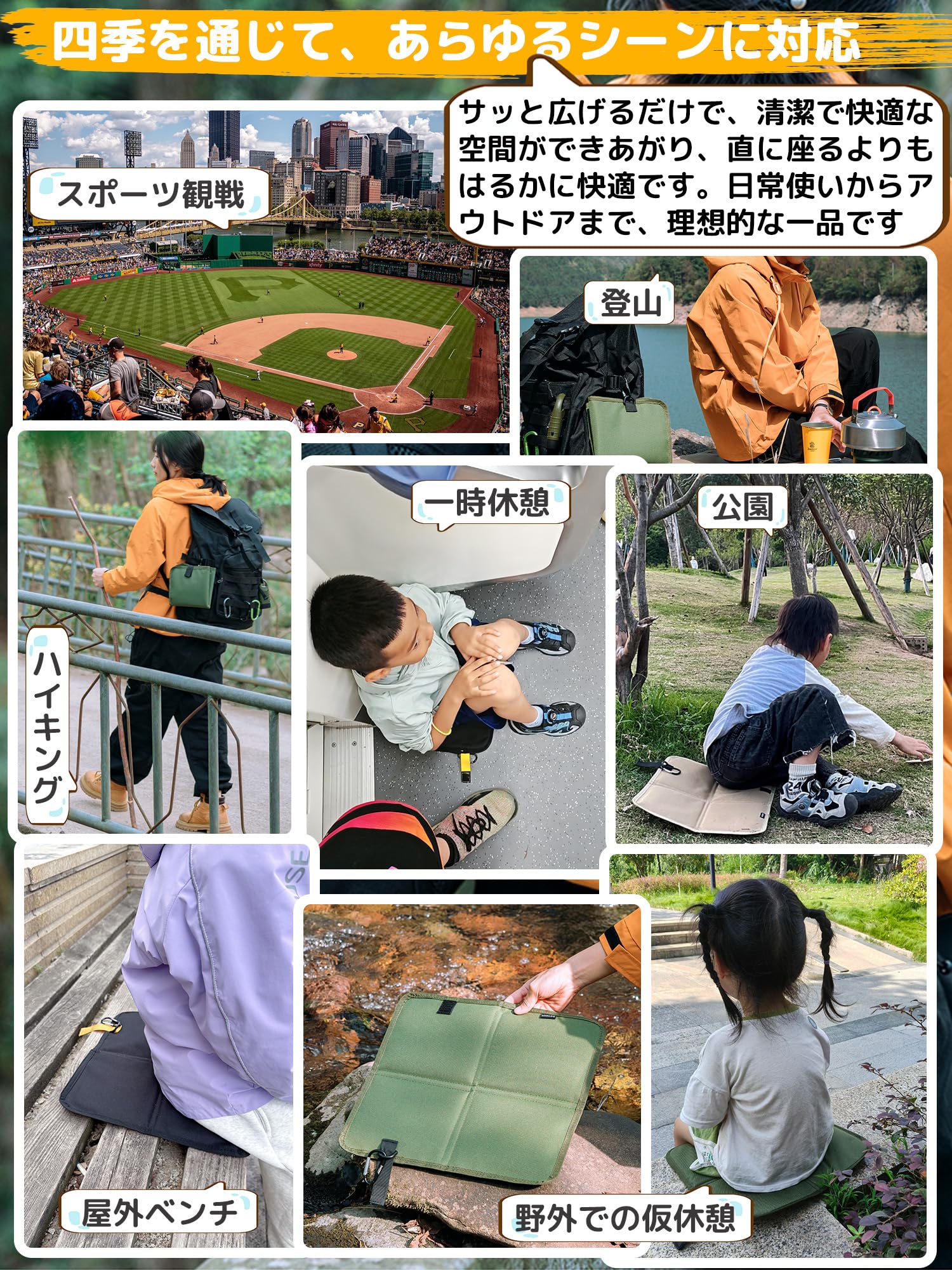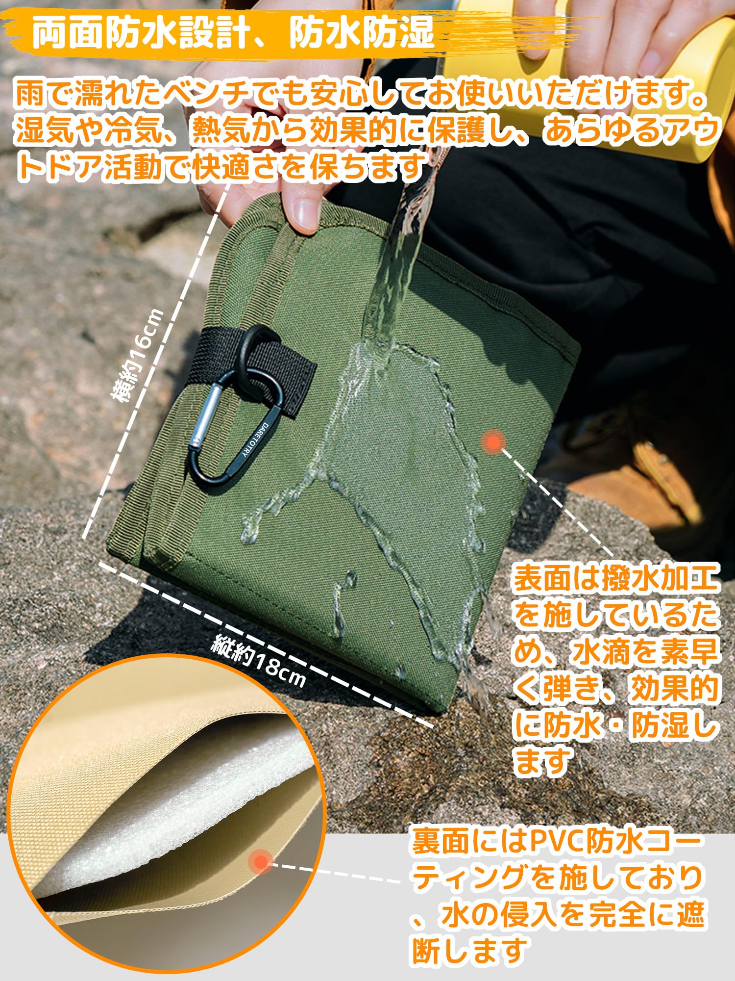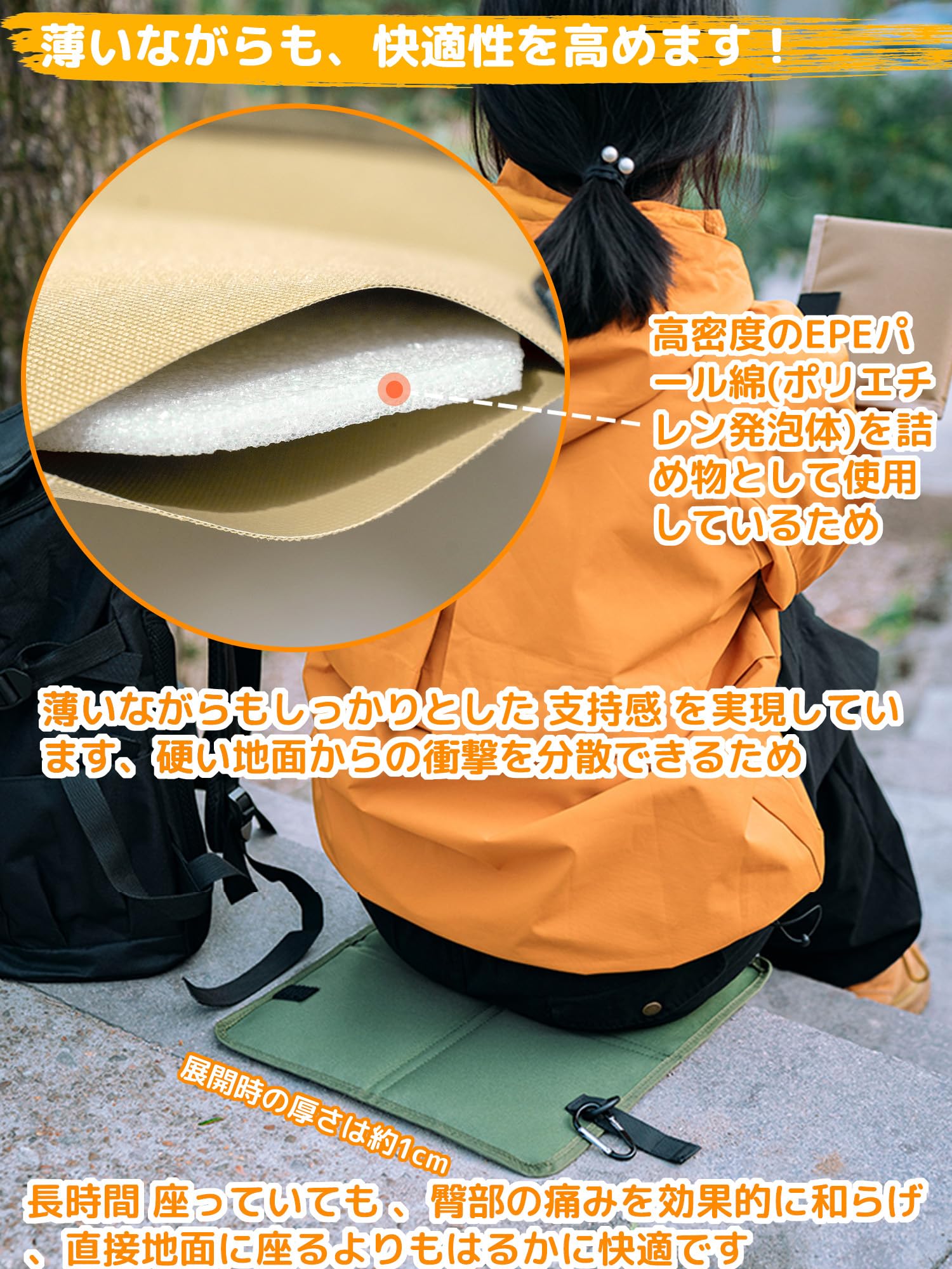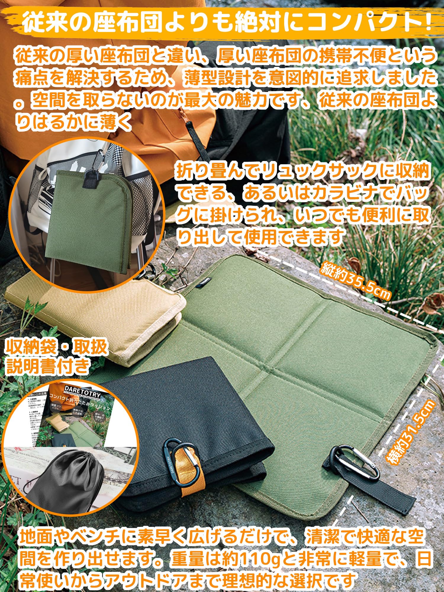 DARETOTRY【薄型・コンパクト設計】折りたたみ クッション カラビナ付き ポータブル 防水 防湿 熱/冷気遮断 アウトドア 屋外 野球観戦 運動会 登山 旅行 レジャー スポーツ観戦 スタジアム キャンプ 公園 花見 釣り用