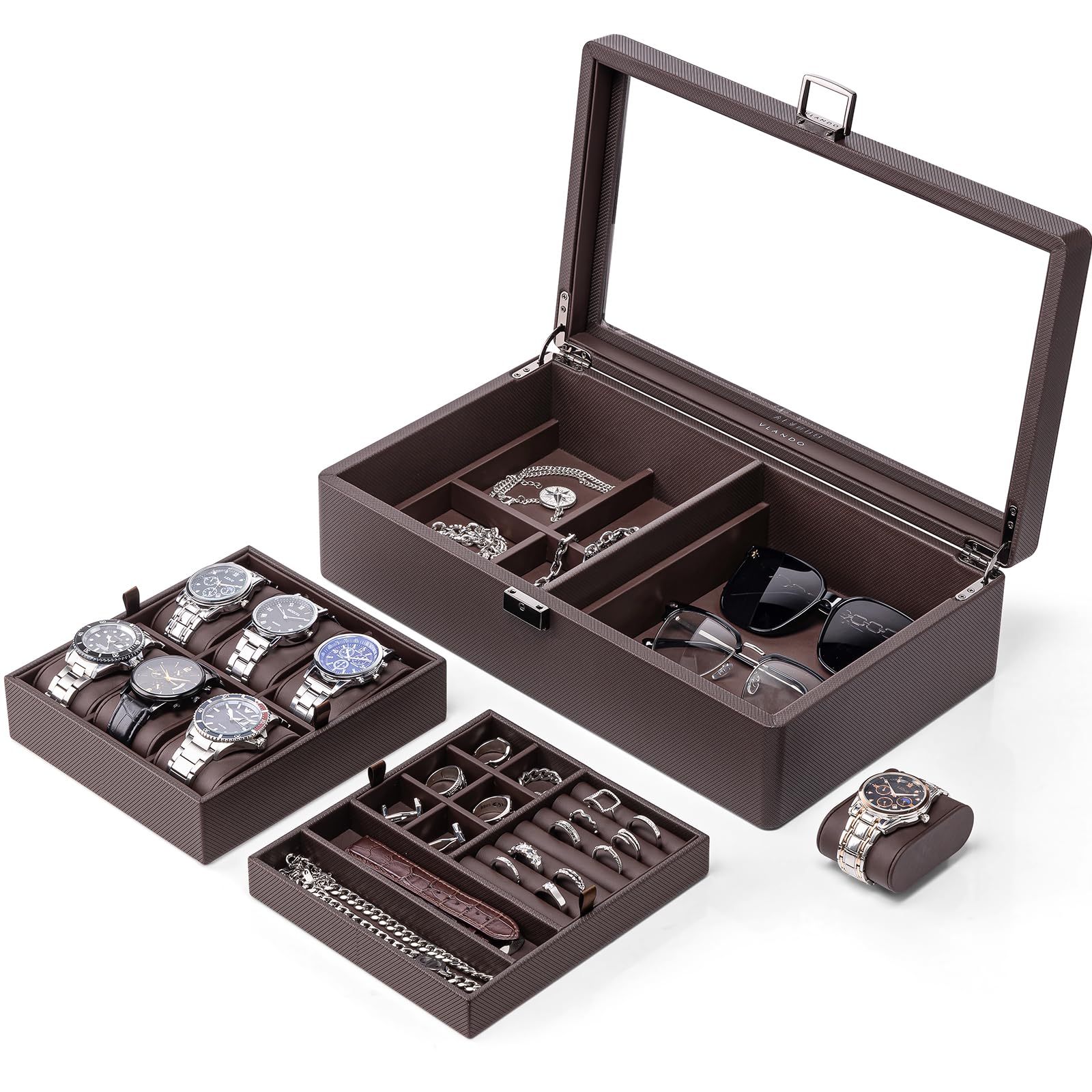 Vlando 6スロット 腕時計ケース PU製 ロック可能 男性 収納ボックス アクセサリーケース ウォッチボックス 取り外し可能な仕切り リング ブレスレット メガネ ガラス蓋 誕生日プレゼント