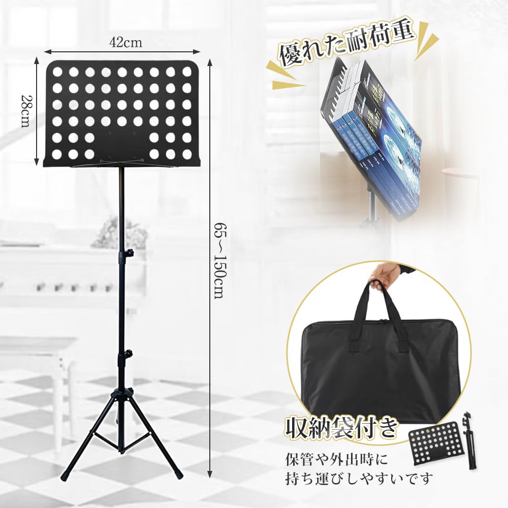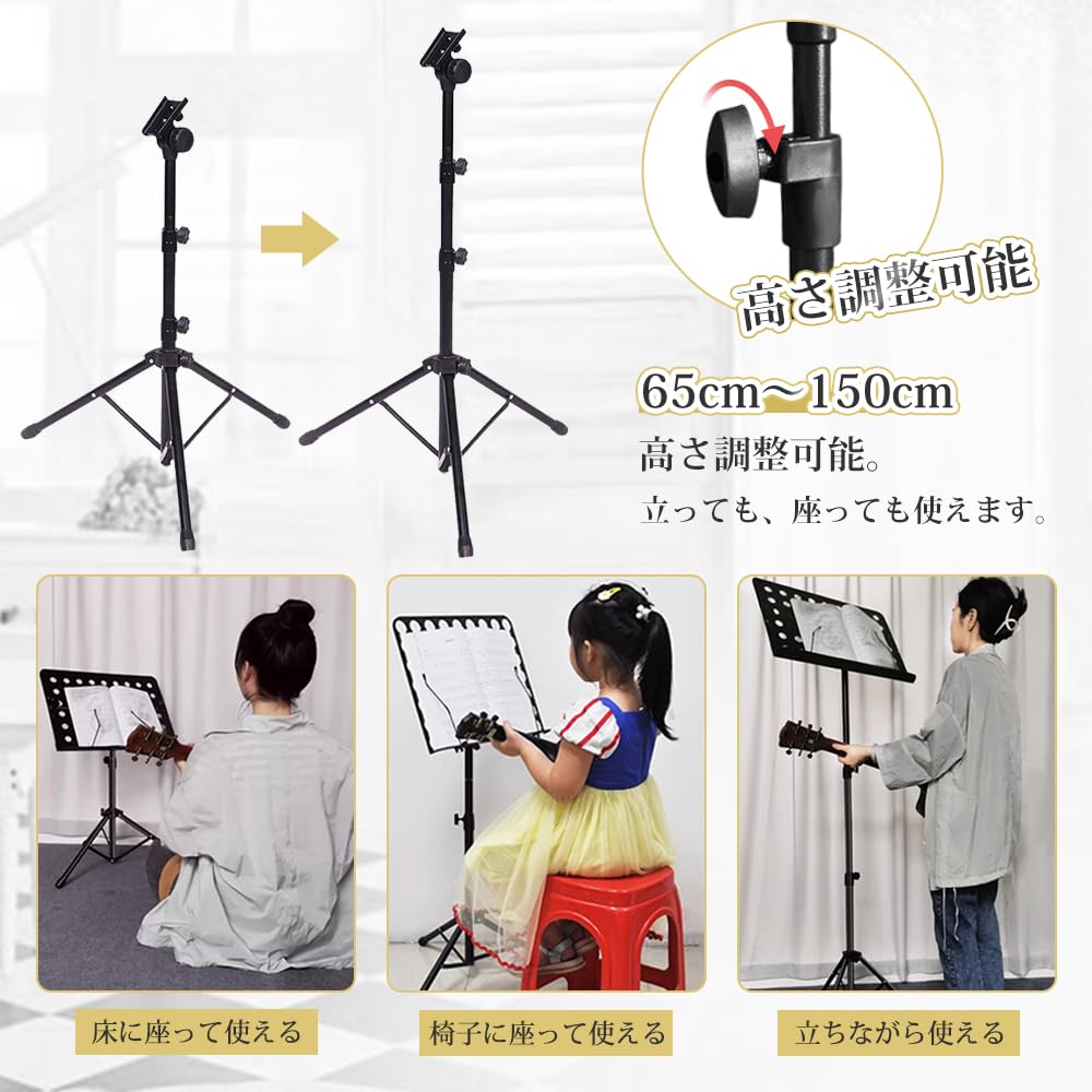 譜面台 折りたたみ式 楽譜たて 楽譜スタンド 73~145cm調節可能 楽譜クリップ付き 三脚 デスクトップスタンド ブックスタンド メニュースタンド 読書台 筆記台 縦置き 収納バッグ付き (ブラック二つ折り)