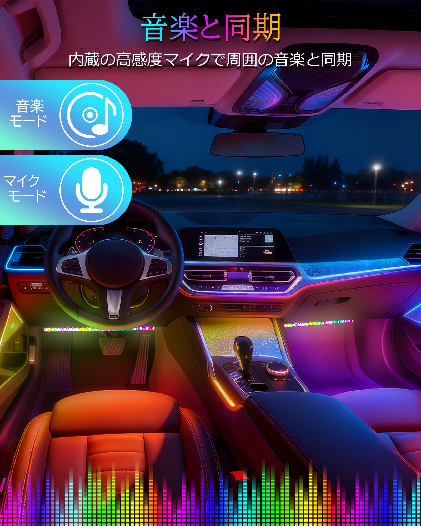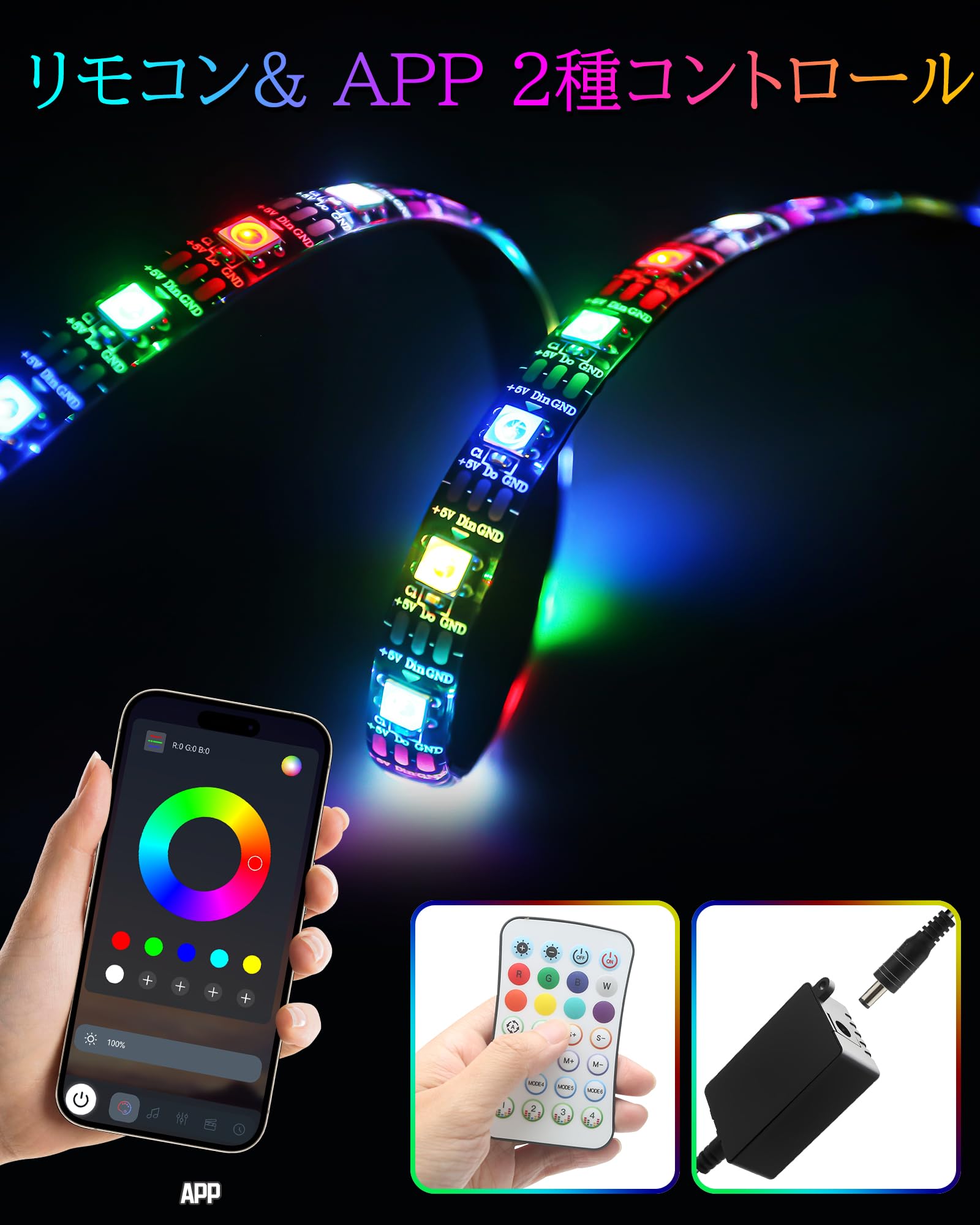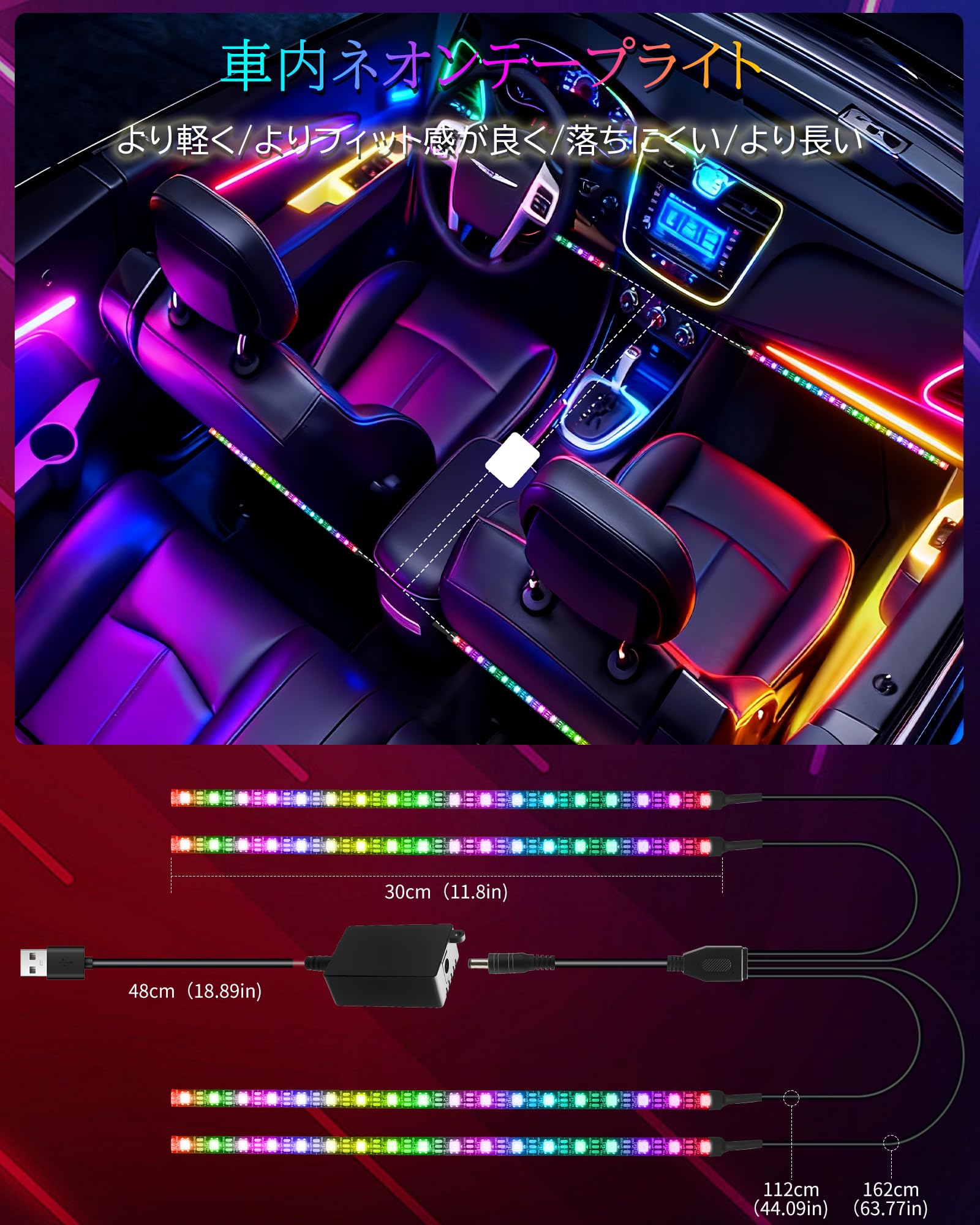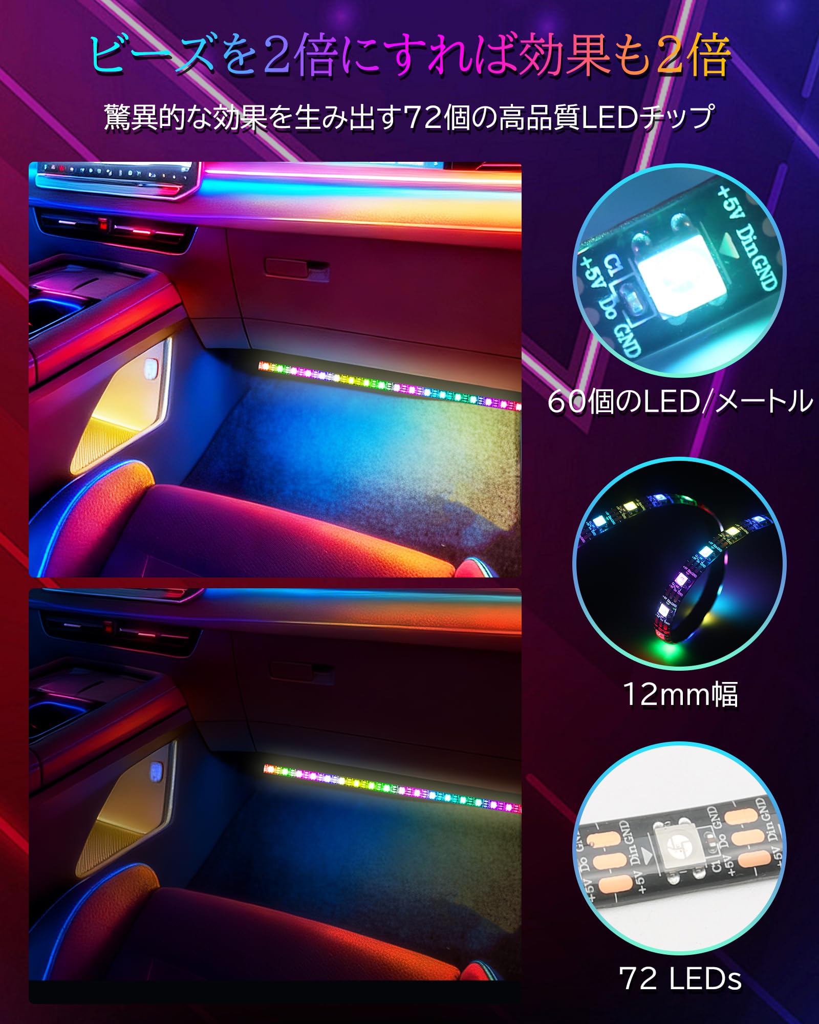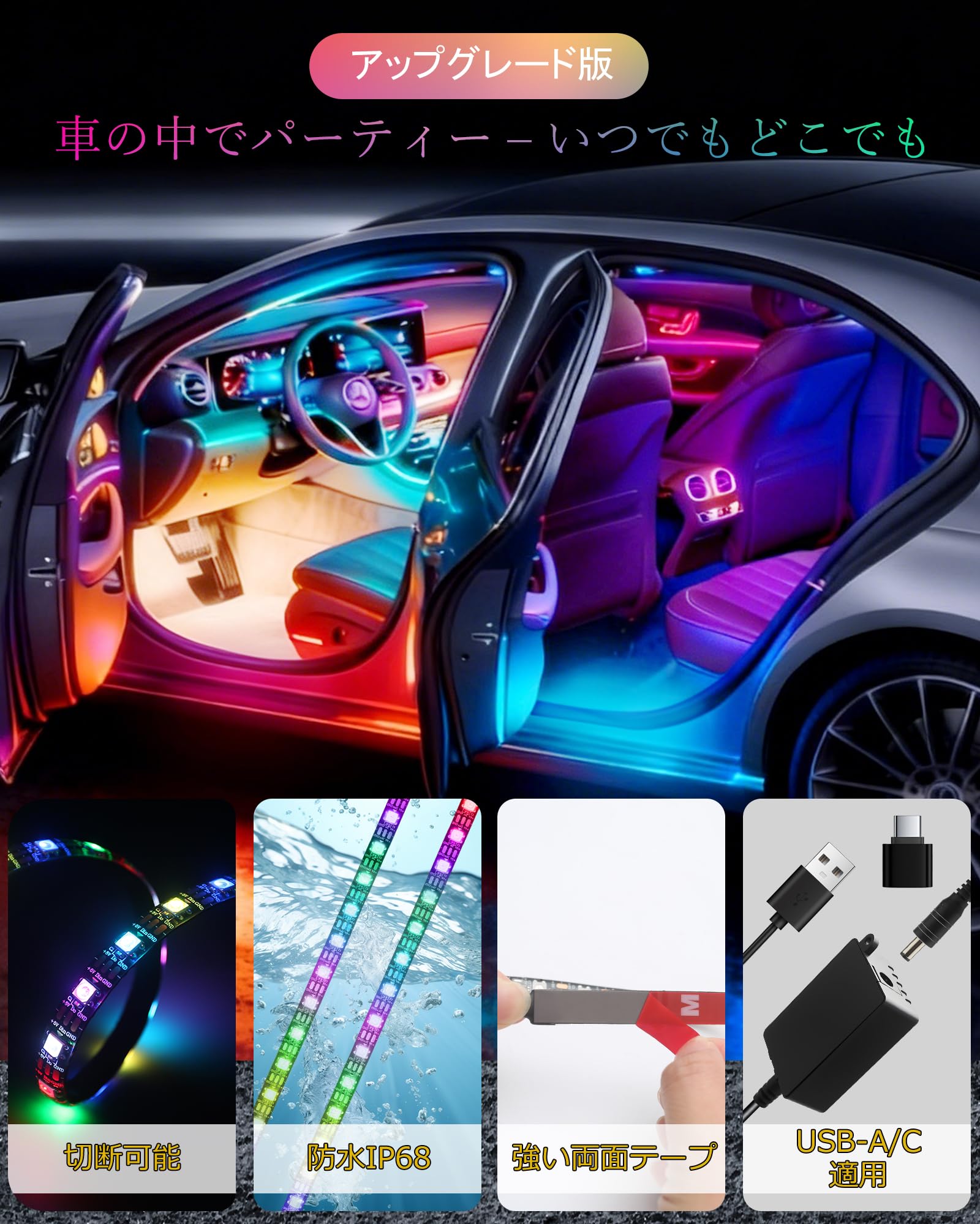 車内用 LEDテープライト 72LED 車イルミネーション フットライト 足元灯 アンビエントライト リモコン付き RGB IC 防水IP68 リモコン&APP 1600万色 調光調色 5V USB-TYPE C転換