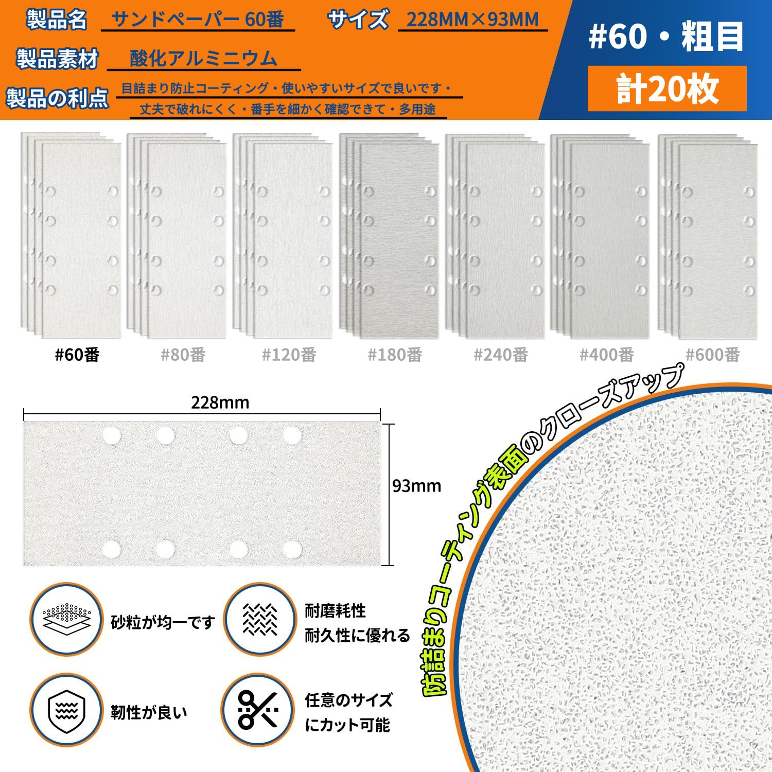 MORLARCO オービルサンダー ペーパー 60番 20枚セット サンディングペーパー 93X228mm サンダー ペーパー クランプ式 電動サンダー用サンドペーパー 吸塵8穴付 塗装仕上げのサンディング 金属磨き 木工DIY作業に 詰まり防止紙やすり