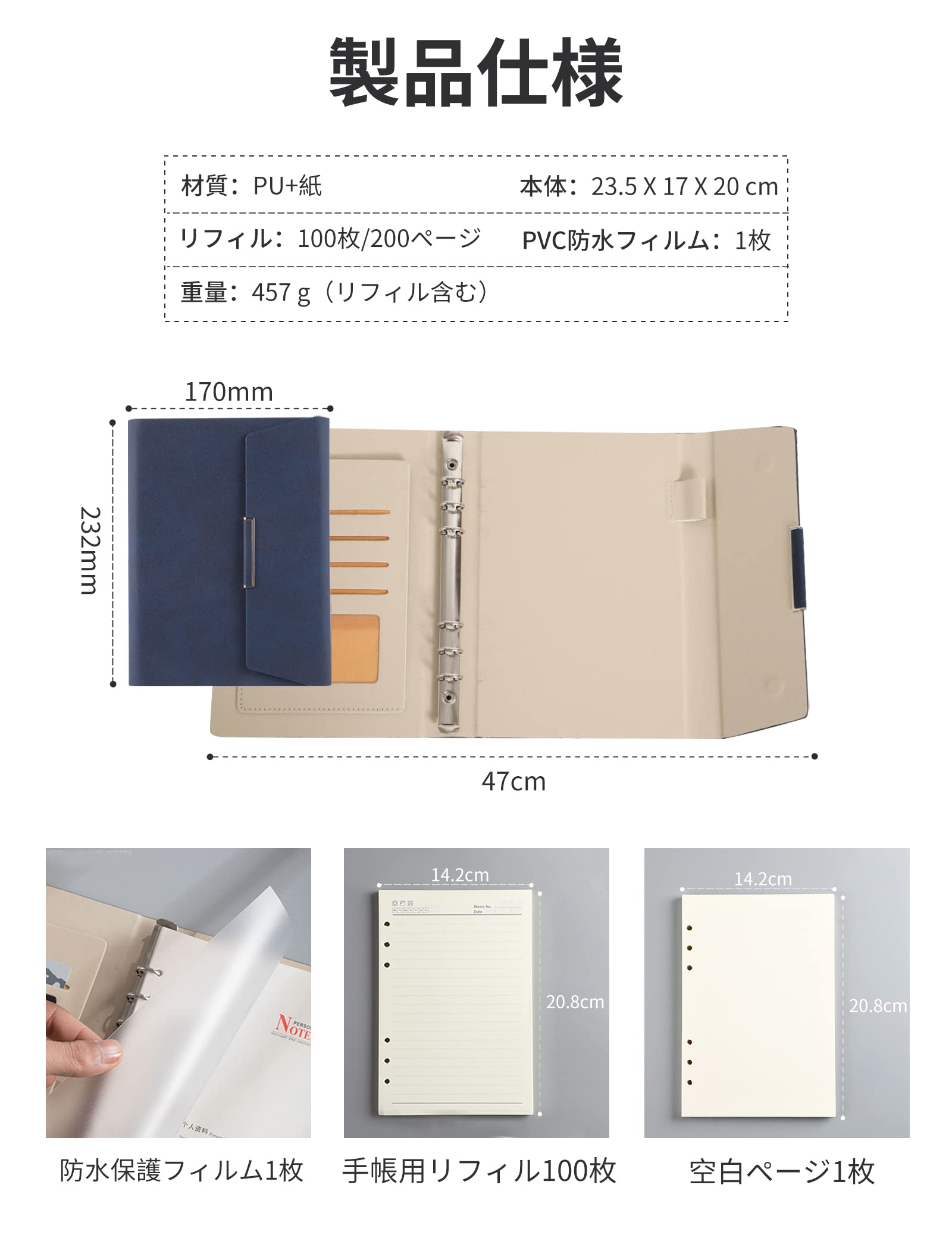 ALLMIRA システム手帳 a5 6穴 PUレザー 革 リング ノート バインダー 手帳カバー a5サイズ 三つ折り リフィル付き メモ帳 カード収納 ビジネス ルーズリーフ (青い)