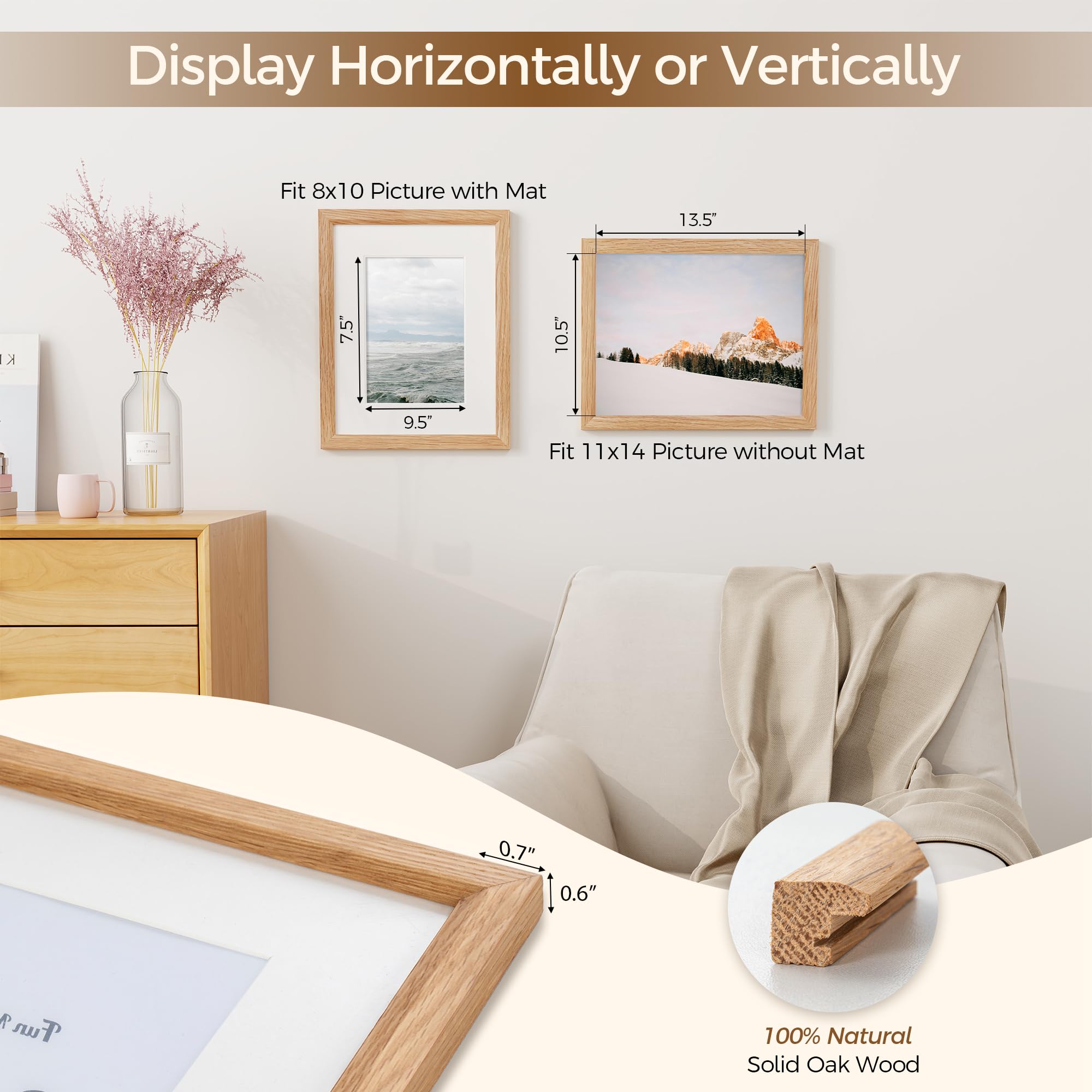 本物のオーク無垢材フレーム - 高品質の100%無垢オーク材で作られたこの12x16インチの写真フレームは、本物のオーク材の写真フレームに本物の外観の天然木の木目が描かれています。 このポスターフレームには、よりクラシックな外観のための厚さ1.2mmのアイボリーカラーマットが付いています。12x16インチの写真フレームは11x14にマットすることができます。