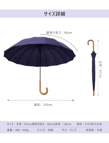 [Qesquilo] 16本骨 長傘 メンズ 日傘 ワンタッチ グラスファイバー Teflon撥水加工 紳士傘 大きいサイズ 収納ポーチ付 (ネイビー)