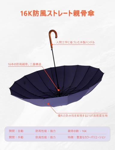 説明SoulRain 16本骨 48インチ スティック傘 自動開閉 無地 ファッショナブルでシンプル、アーク クラシック木製ハンドル、防風、壊れないスティック雨傘