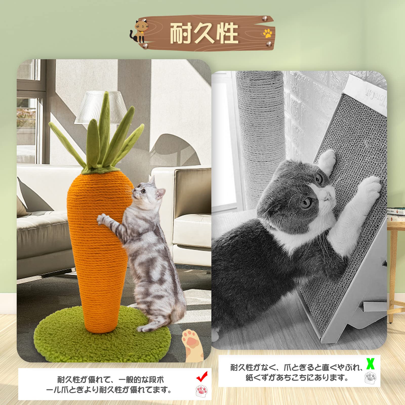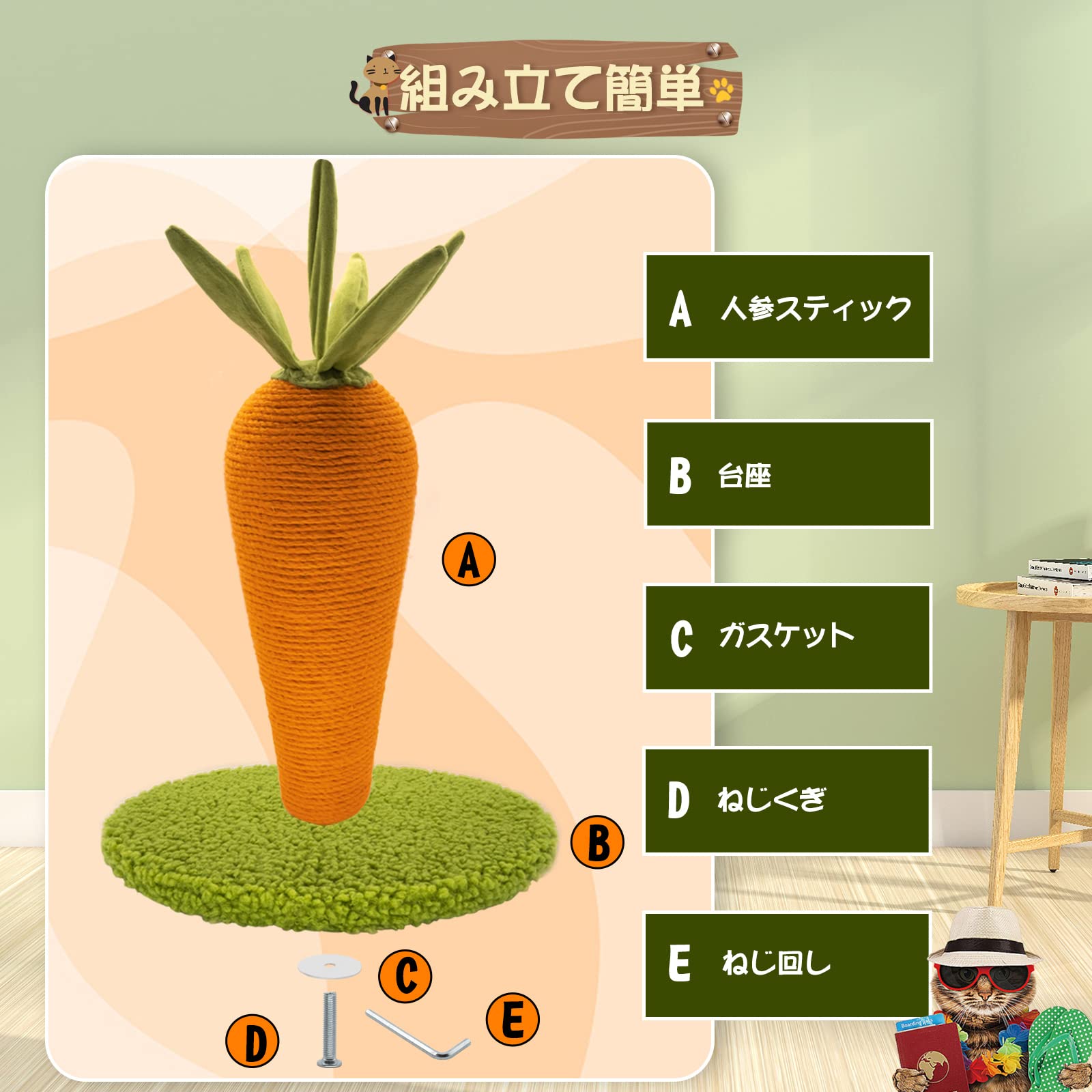 AUSCAT 猫爪とぎポール 猫つめとぎ スクラッチポール 人参型 インテリア 可愛い 安定 頑丈 長持ち 縦置き型 運動不足やストレス解消 天然サイザル麻 組み立て簡単