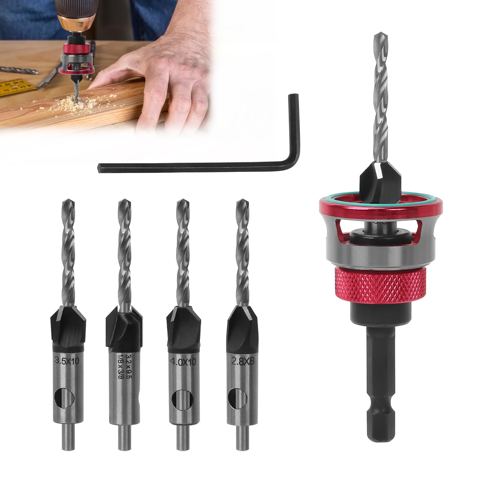 高精度 深さ調整可能 皿取り錐ドリルビット 4本セット 下穴・皿取・埋木用 六角軸 ハイス鋼 木工用ドリルビット レンチ付き 竹 木 MDF 硬質ゴム 対応 高速切削で綺麗な仕上がり DIY 家具製作 キャビネット (赤)