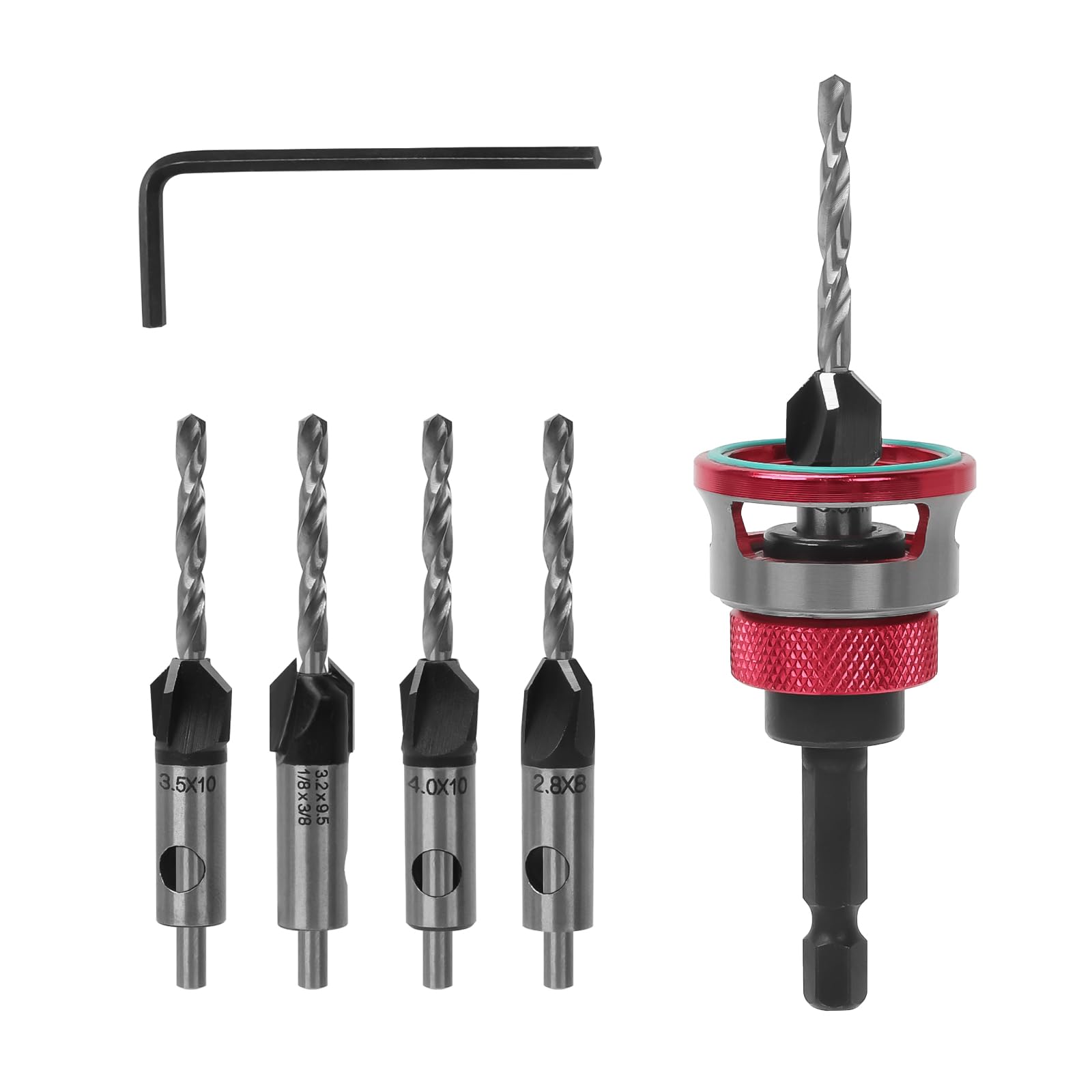 皿取り錐ドリル ビット 4本入り 埋木錐 下穴・皿取錐 レンチ付き 六角軸 高速度鋼製 木工用ドリルビット 穴あけトリマー 面取りカッター バリ取り セット 竹/木/硬質ゴムなどの穴開け Countersink Drill Bit Set (レッド)