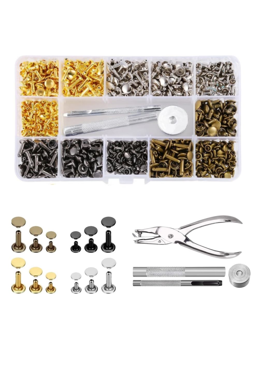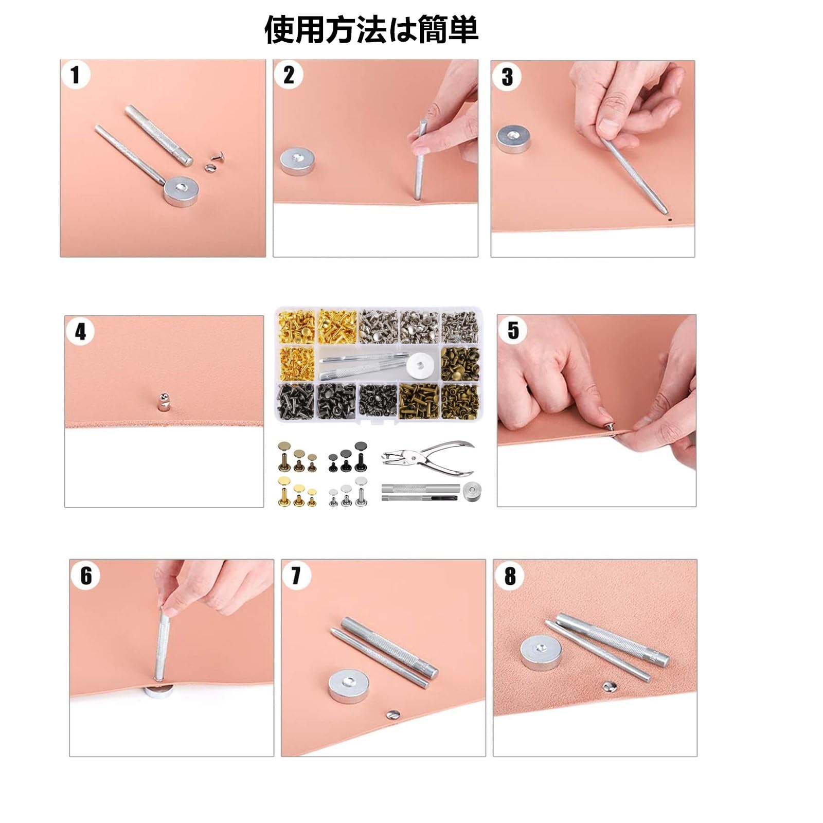 レザークラフト カシメセット 4種色リベット リベット 革細工 工具セット 丸形6mm 8mm 12mm スタッズ 底鋲 打ち具セット DIY 手作り ダンボール財布 布革細工 靴 収納ケース付き
