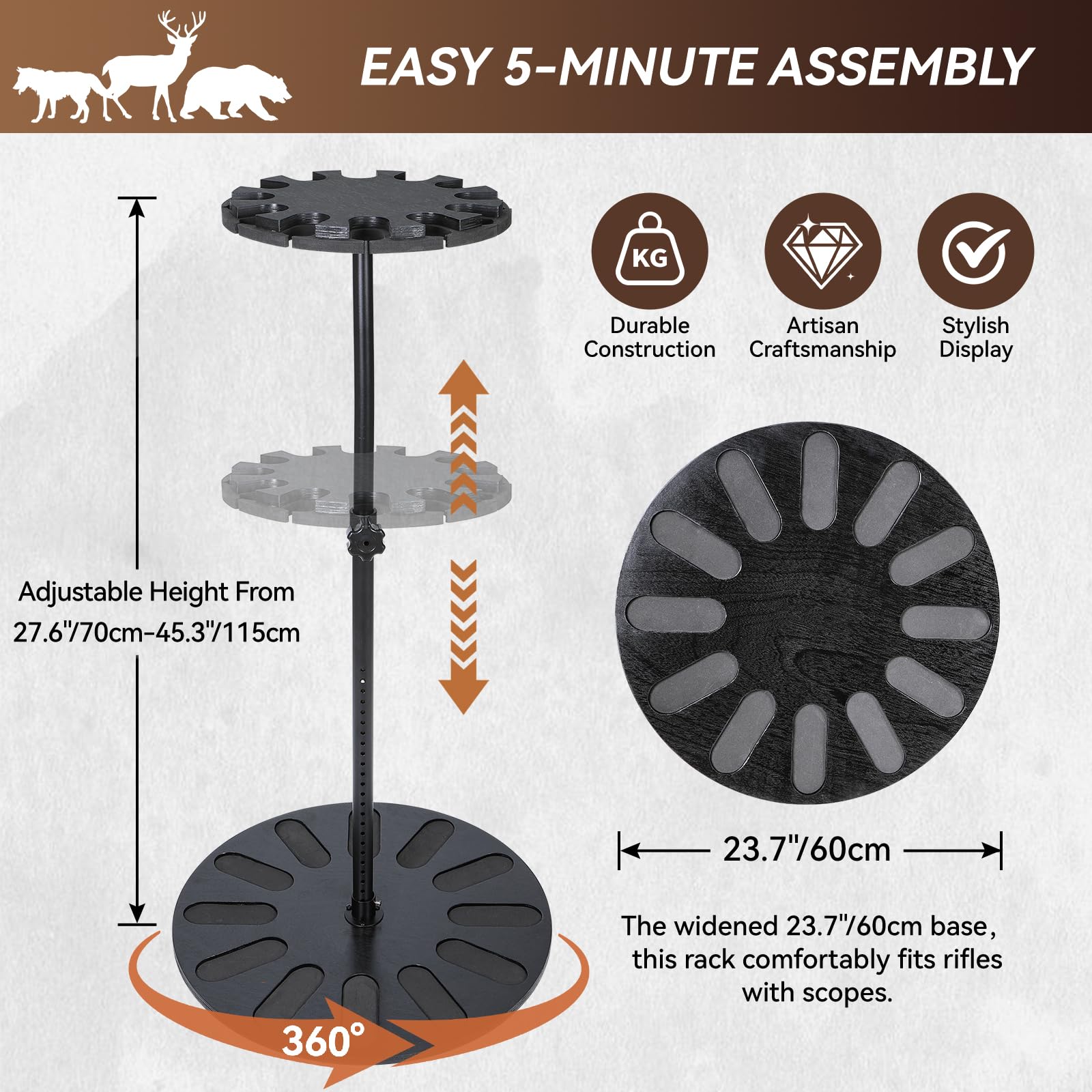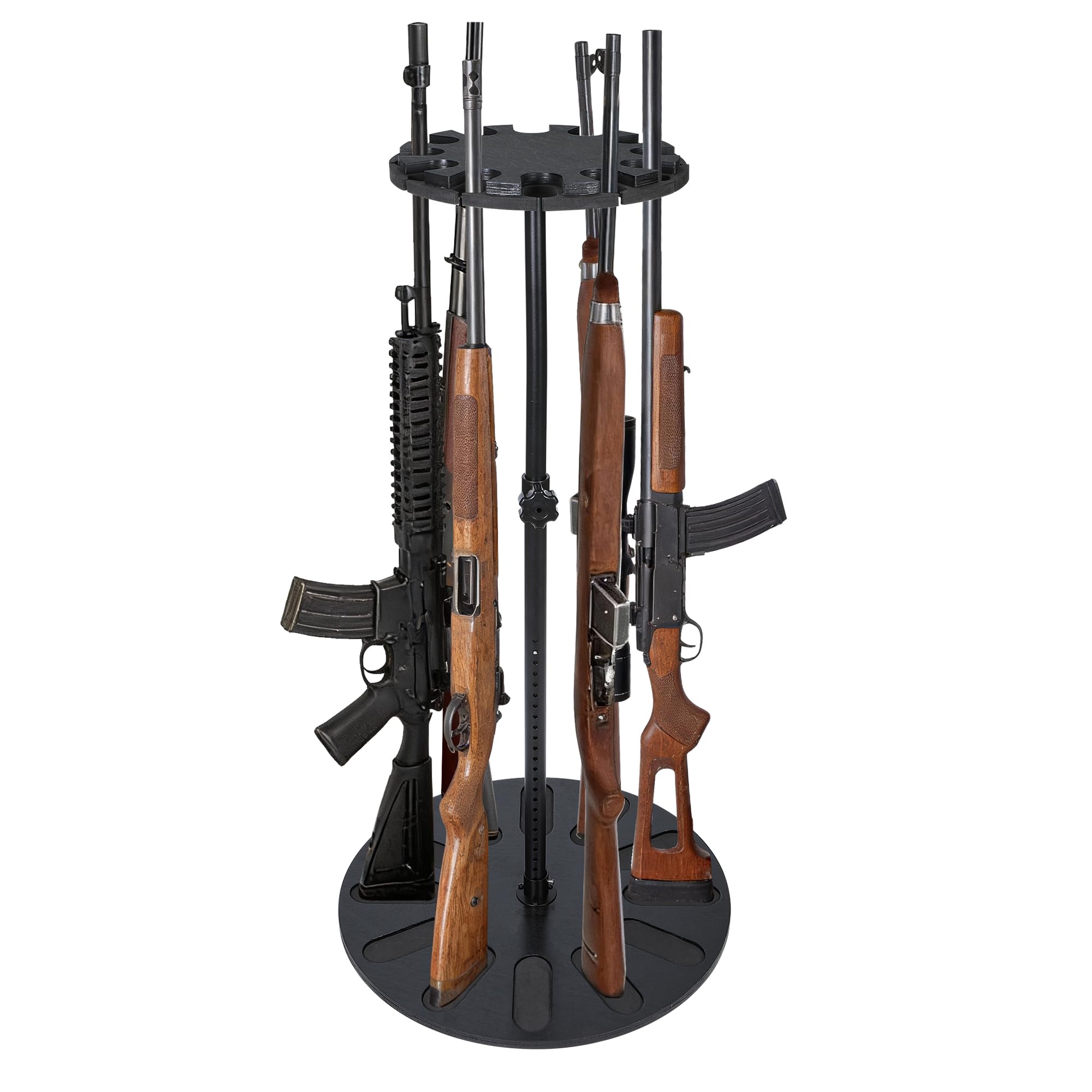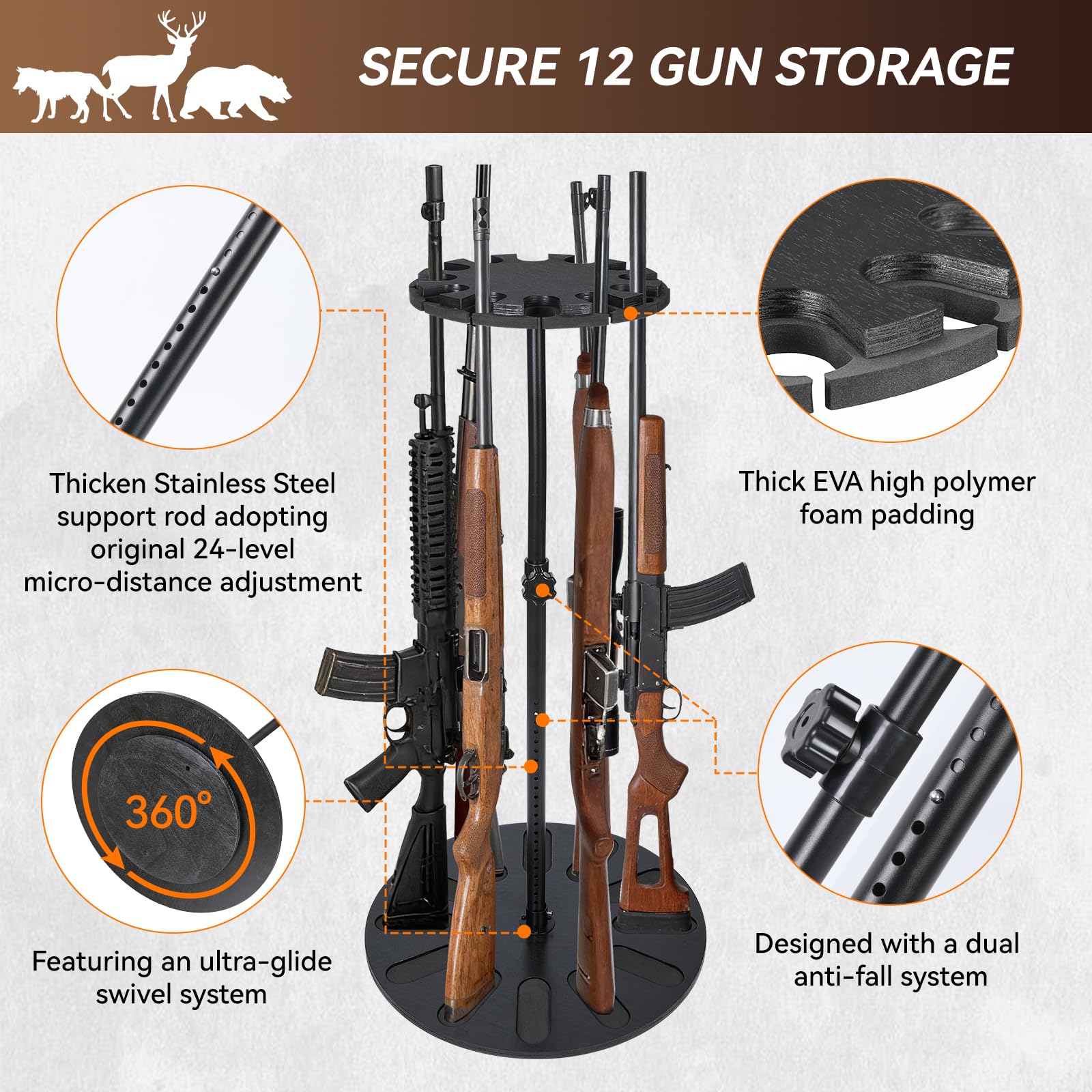 プレミアム360度回転ガンラック - 24段階高さ調節可能、12丁ライフル収納、再生可能な天然木&EVAパッド採用セキュア展示保管スタンド、銃器保管庫/ホルダー整理に最適
