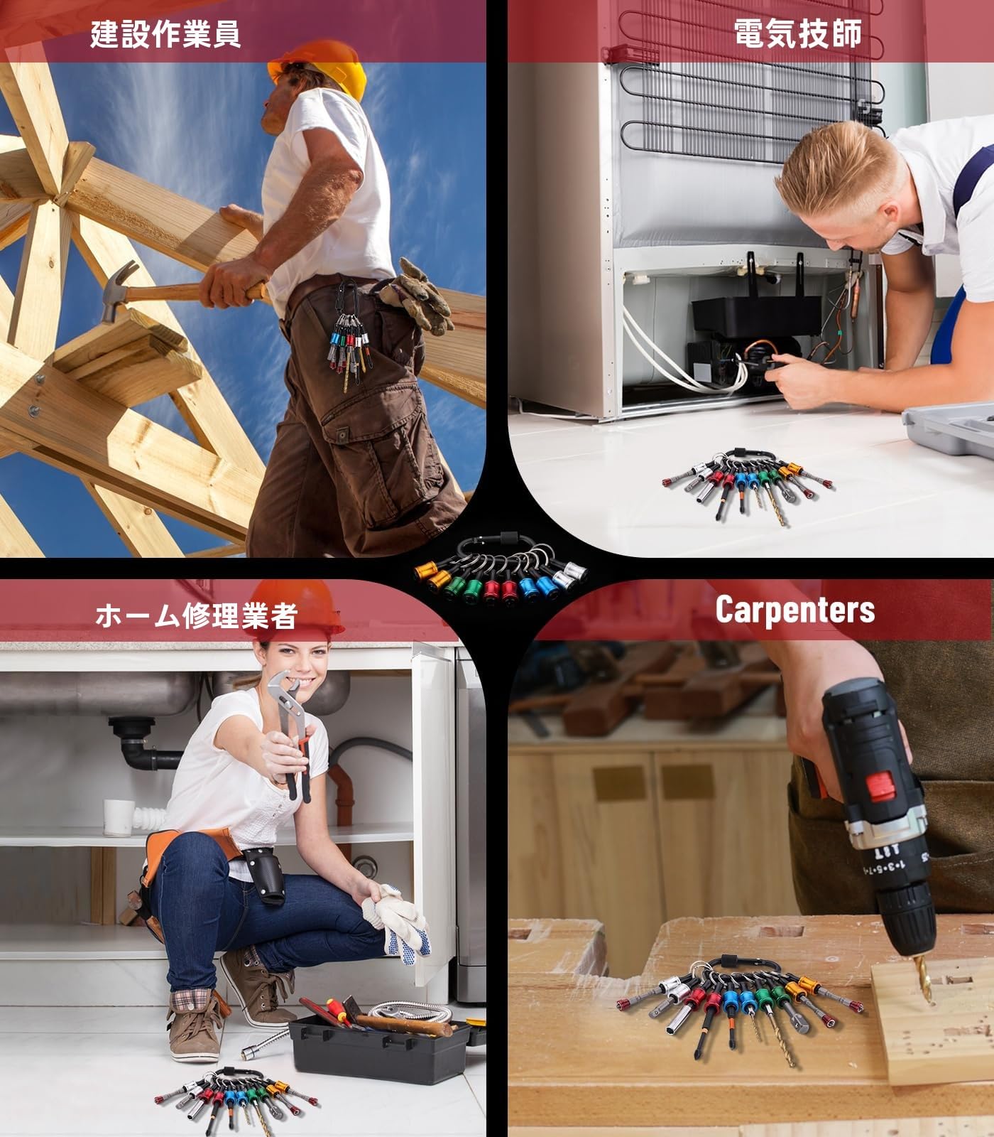 ビットホルダー カラビナ ライトアングルドリルエクステンションソケット付き 6色セット 引き上げ式 ソケットホルダー 先端工具 ドライバービットホルダー用 携帯用 収納 六角軸 6.35mmに適用作業用手袋付き