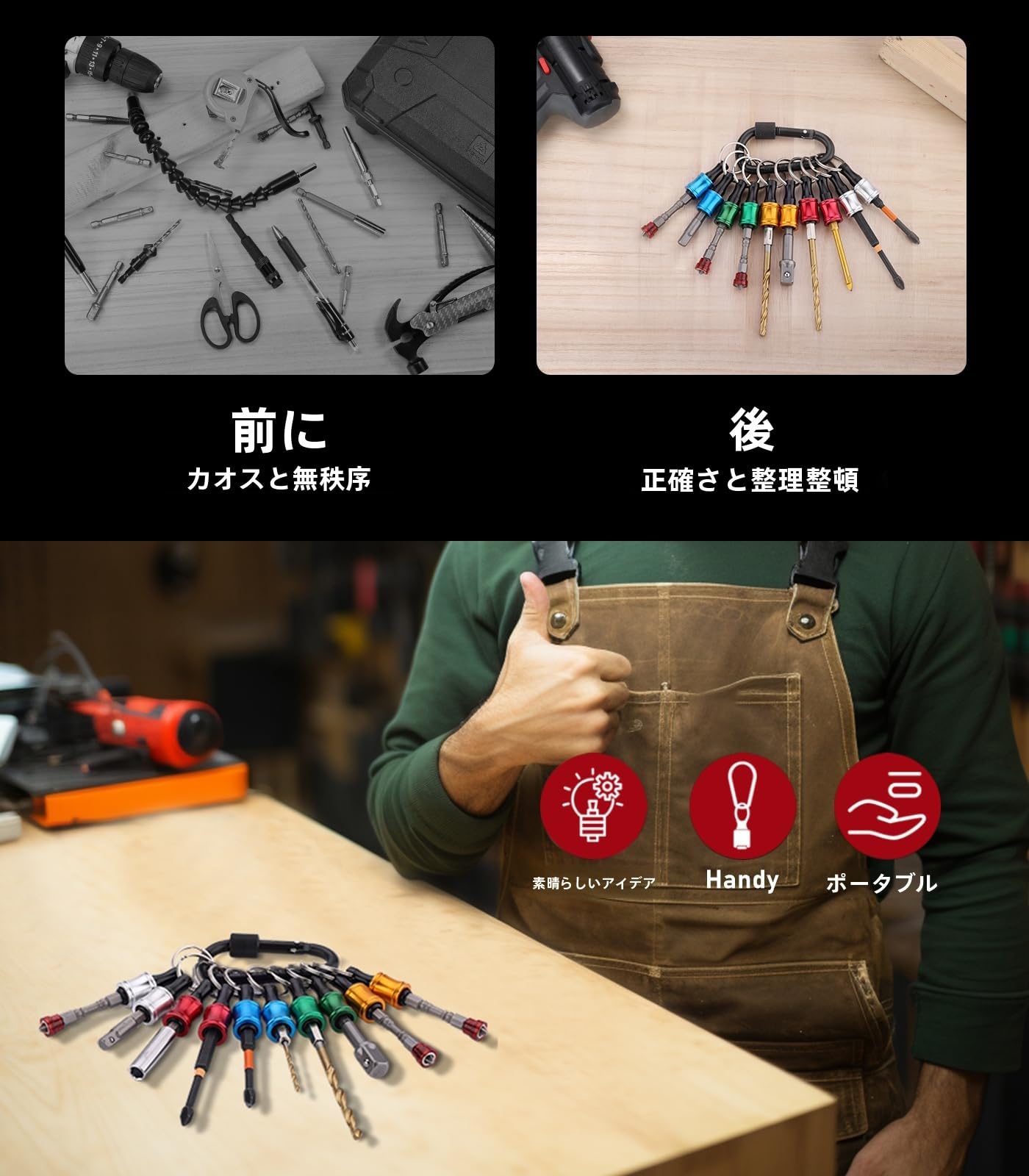 ポータブルドライバービットホルダー 12個 6色スーツ キーホルダータイプ 引下げ式 カラビナ付 アルミ製 軽量 落下防止 ストレージ ソケットブラケット フロントエンドツール 先端工具 収納 カラフル