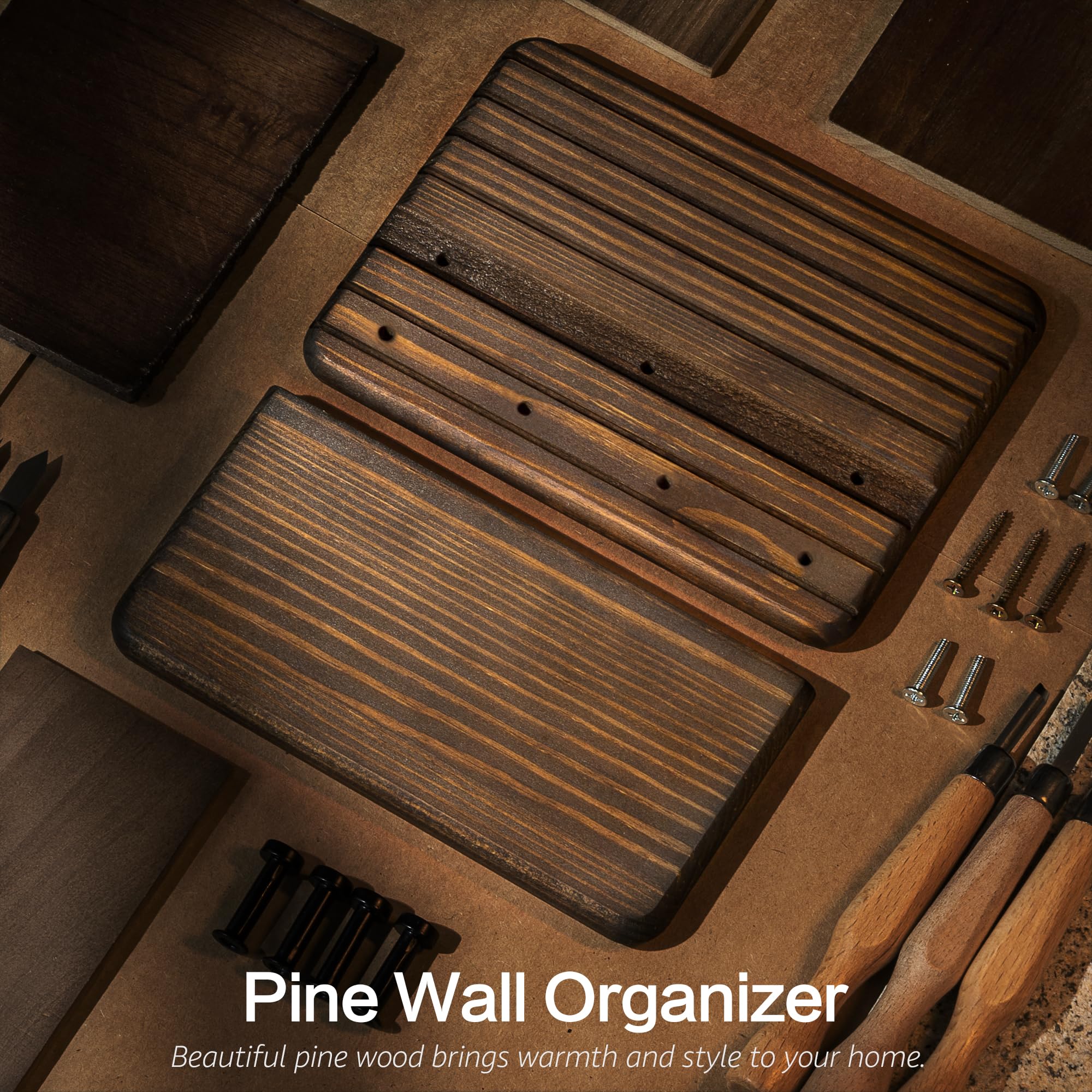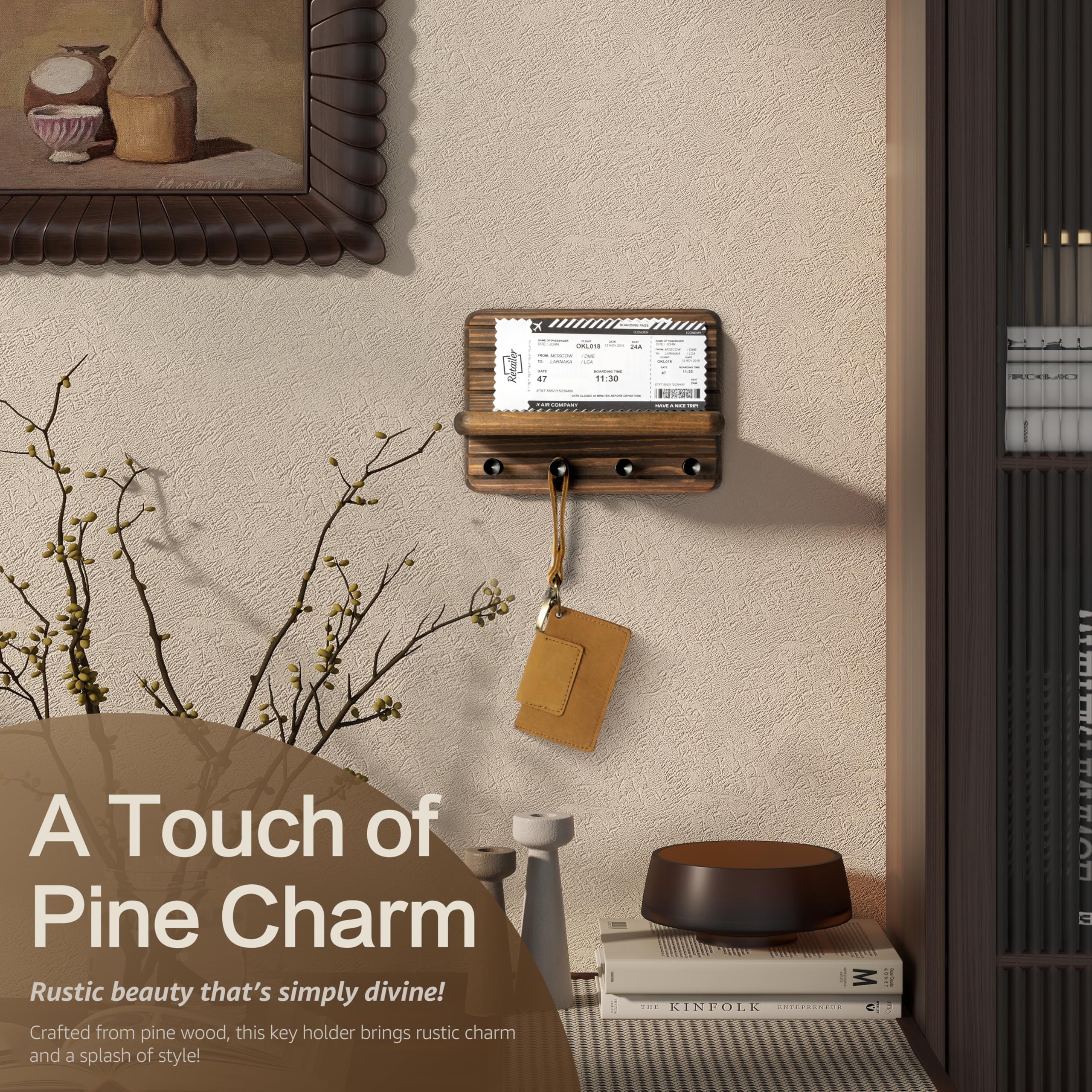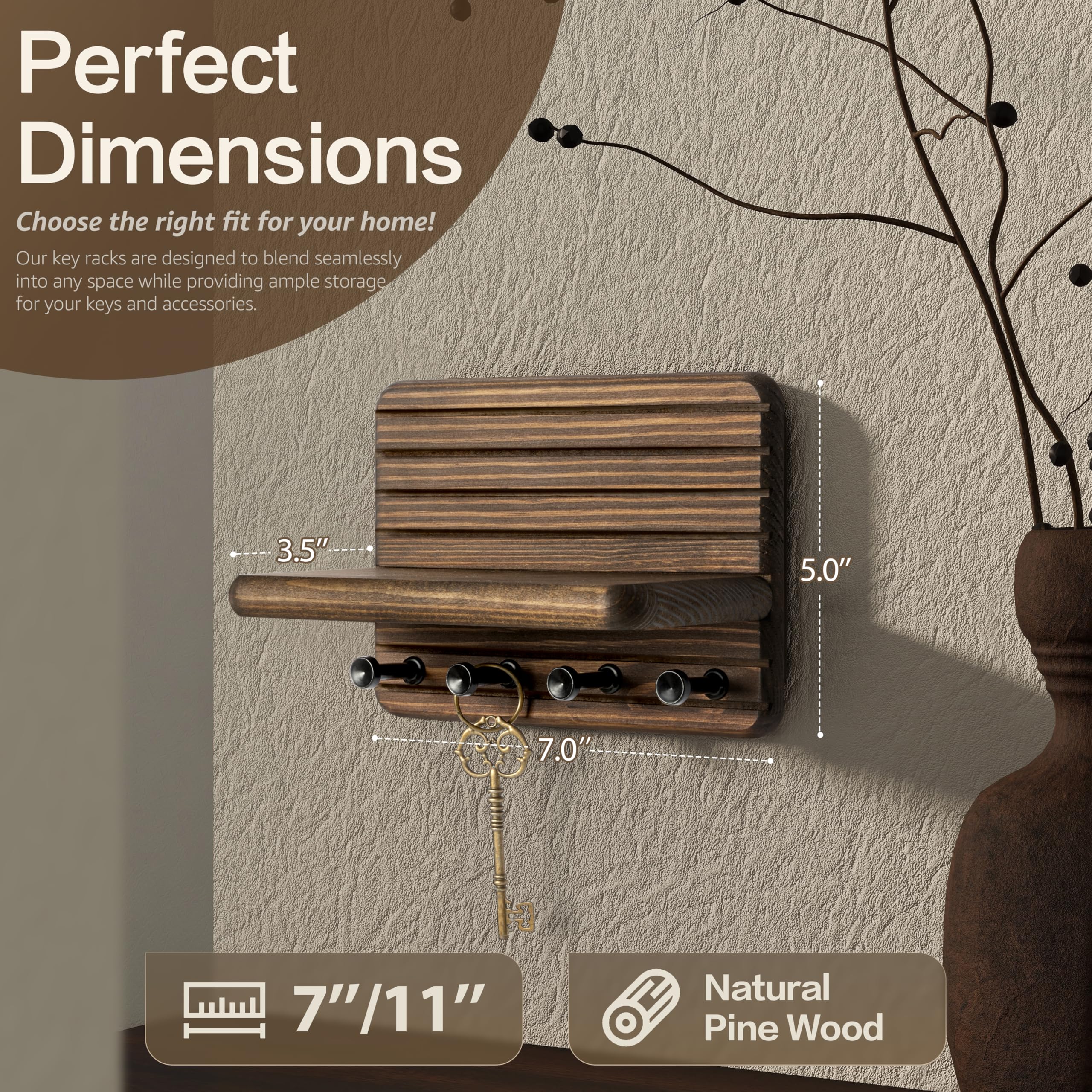 Rebee Vision(リービービジョン) 小型 ファームハウス キーホルダー 壁取り付け ホームデコレーション用 – ミニ7インチ 木製キーホルダー 壁用 フック4個&フローティングシェルフ付き - きれいでトレンディな家のためのアパートの必需品 (ブラウン)