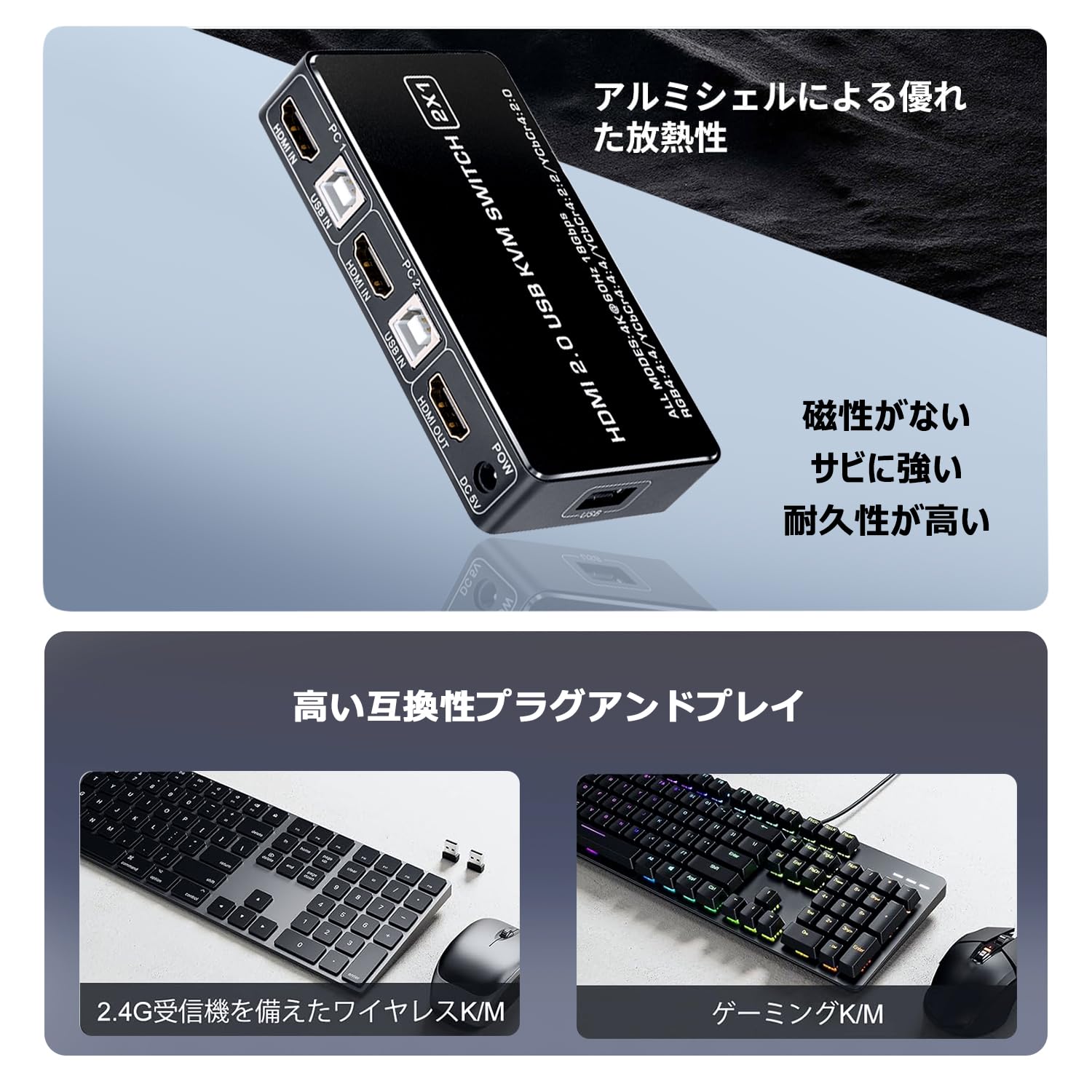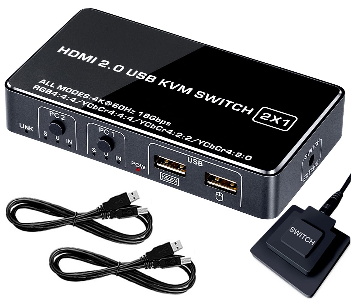 KVM HDMI 切替器 2ポートPCスイッチ、UHD4K @ 30 Hz(YUV 4:4:4)、ホットキースイッチング(便利で高速)、電源不要、2本のUSBケーブルとHDMIケーブルが含まれています