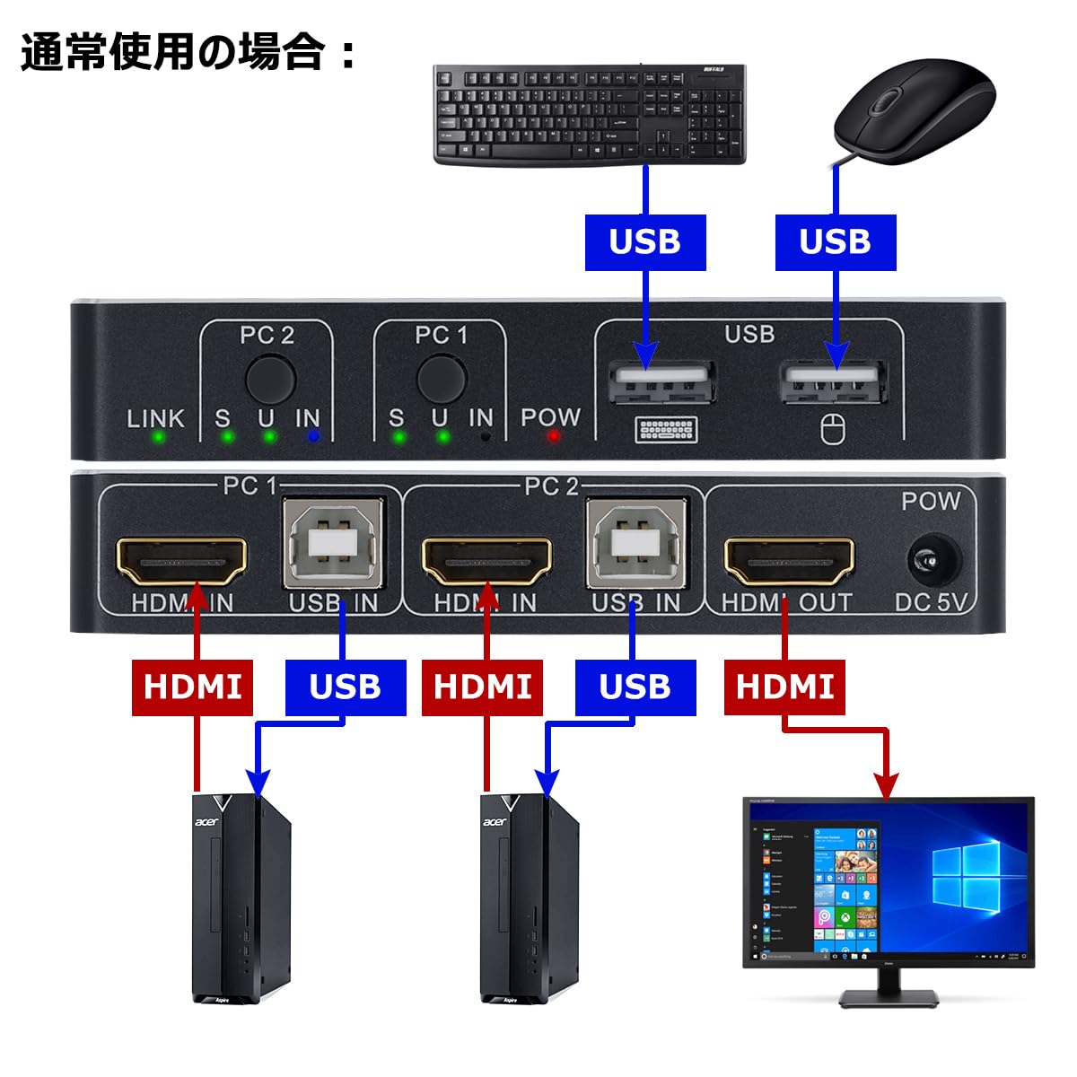 USB3.0 切替器 KVMスイッチ HDMI 2入力1出力 パソコン2台モニター1台切り替え 1台のプリンターを2台のパソコンで使用 4K@60Hz 5Gbps 4 USB-A3.0ポート キーボード/マウス/プリンター/他のデバイス対応 USBスイッチャー USB 切り替え PC切替器 マウス キーボード 切り替え HDMIケーブル/USB3.0ケーブル/手元スイッチ/日本語説明書付き