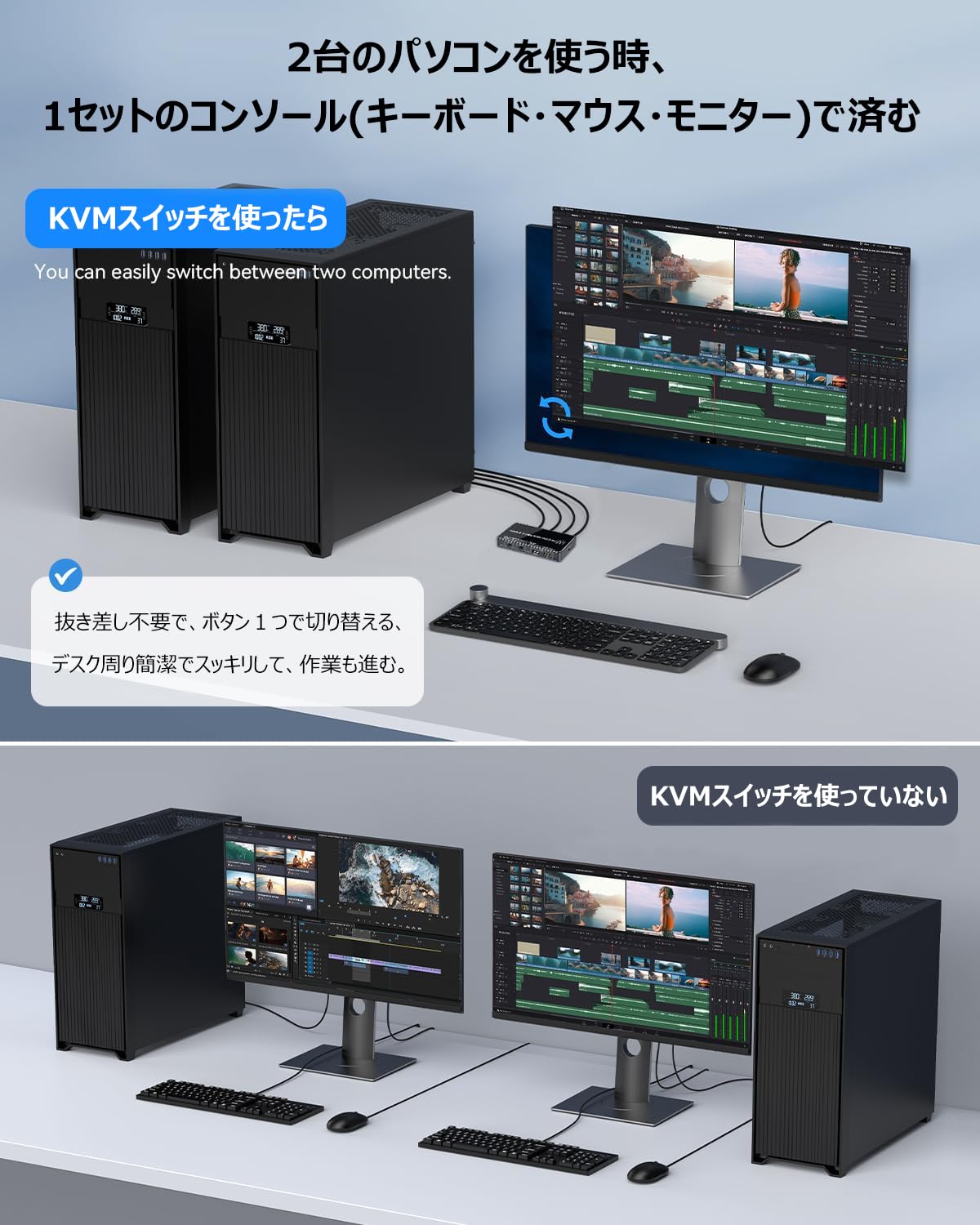 kvmスイッチ hdmi 4K kvm スイッチ HDMI切替器 2ポート(PC2台用)Ultra HD 4K 60Hz HDMI2.0 HDCP2.2 3D/HDRスプリンター USB2.0 USB キーボード/マウス共有 USBメモリ/プリンター/外付けハードディスク対応 外付けスイッチ付き電源不要 (KVM スイッチ2ポート)