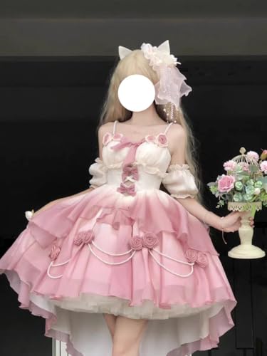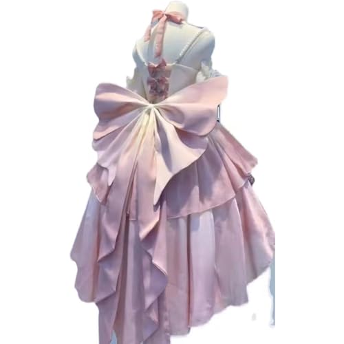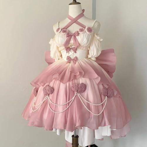 [ボズとガルヤ] 長い裾 ロリータワンピース ロングトレーン 花嫁 薔薇 パール 華ロリ ティアード ウエディングドレス ピンク リボン 姫系 cosplay lolita ゆめかわいい 半袖 茶話会