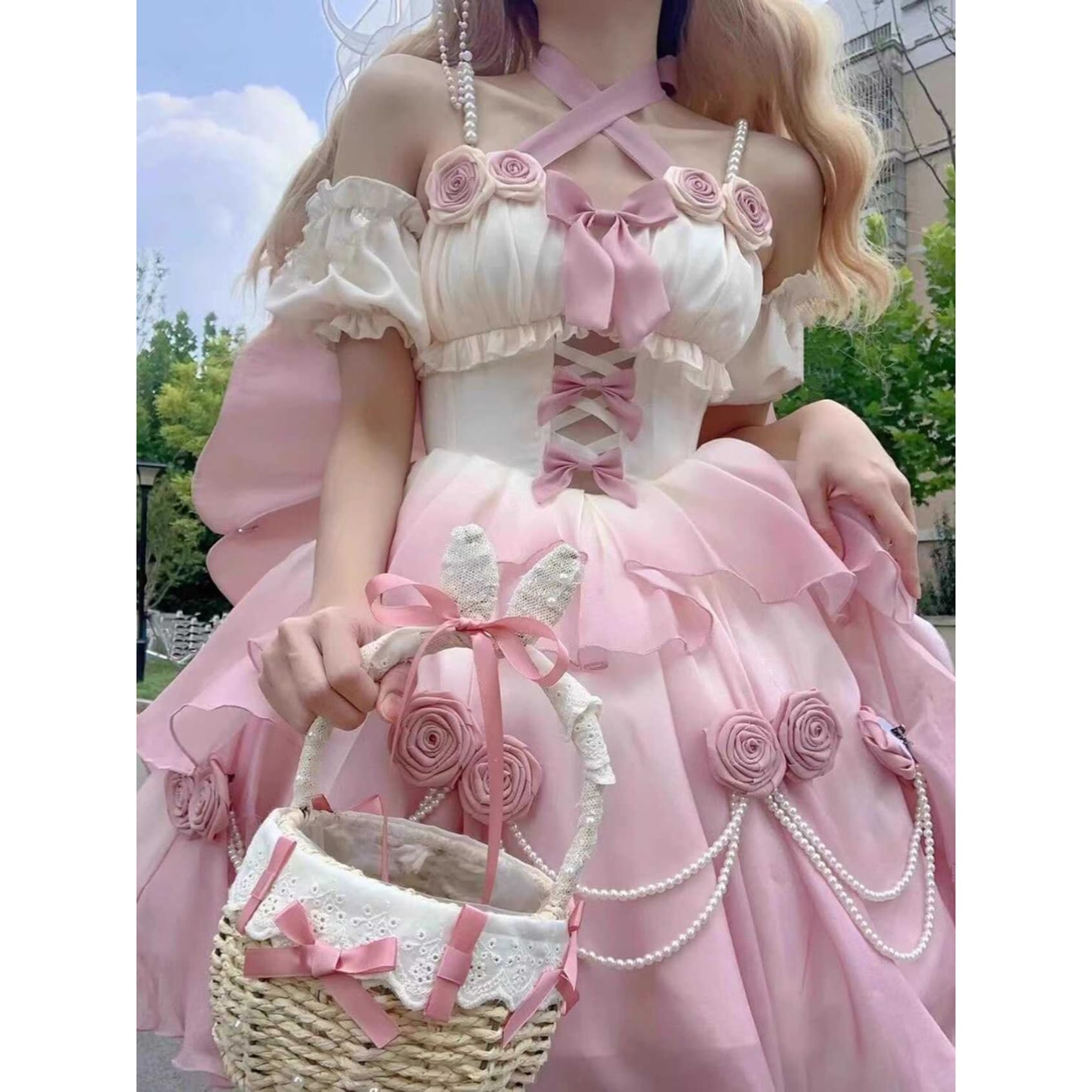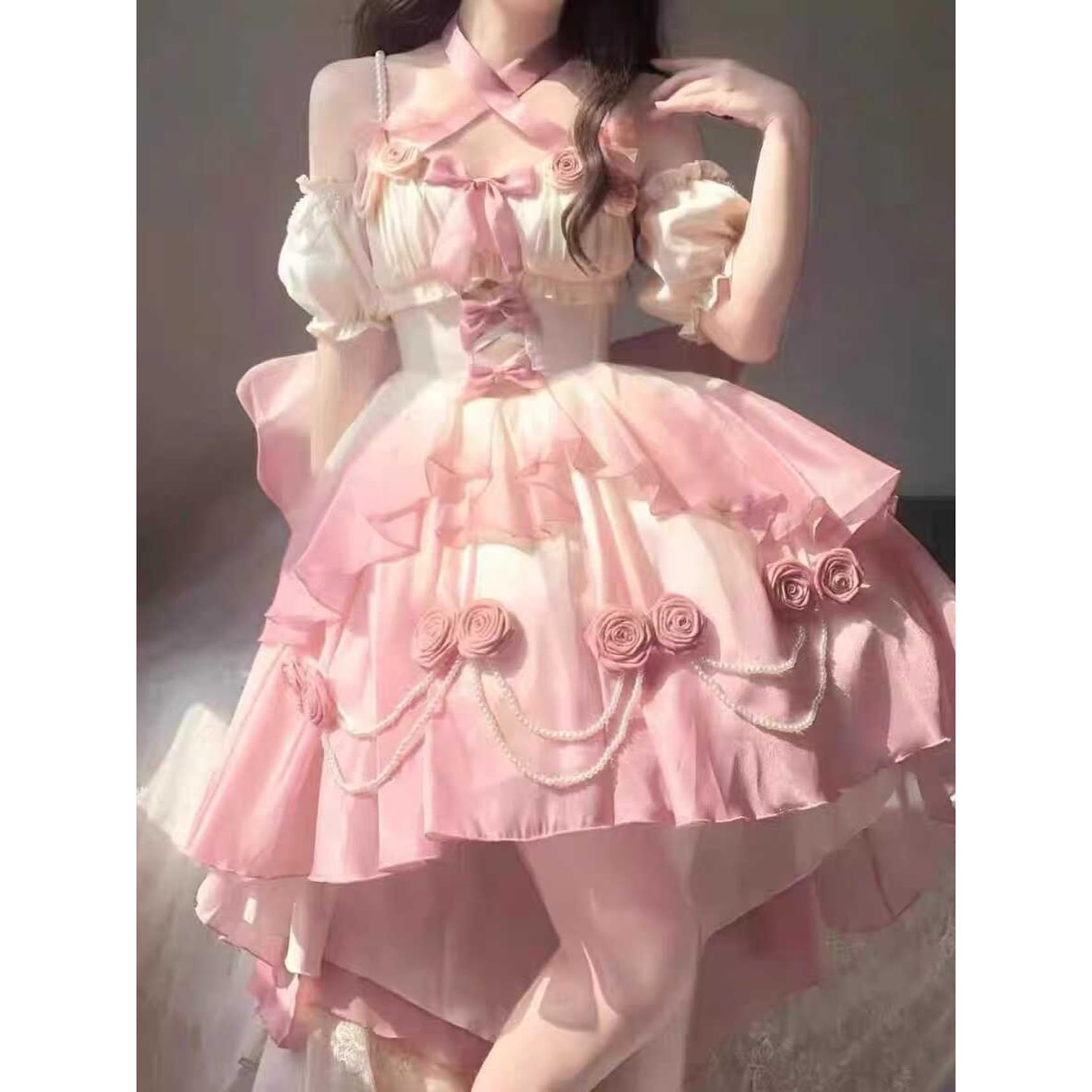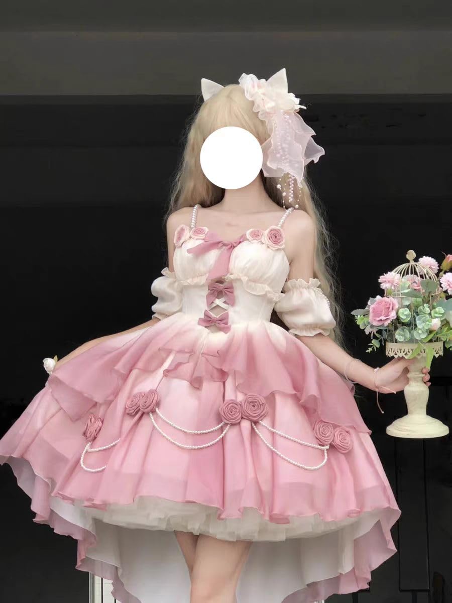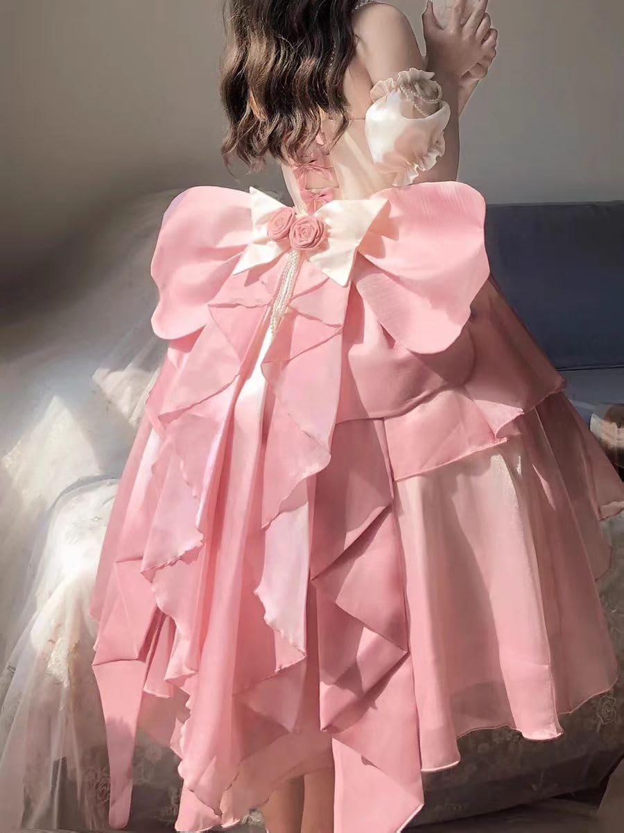 [ボズとガルヤ] 長い裾 ロリータワンピース ロングトレーン 花嫁 薔薇 パール 華ロリ ティアード ウエディングドレス ピンク リボン 姫系 cosplay lolita ゆめかわいい 半袖 茶話会