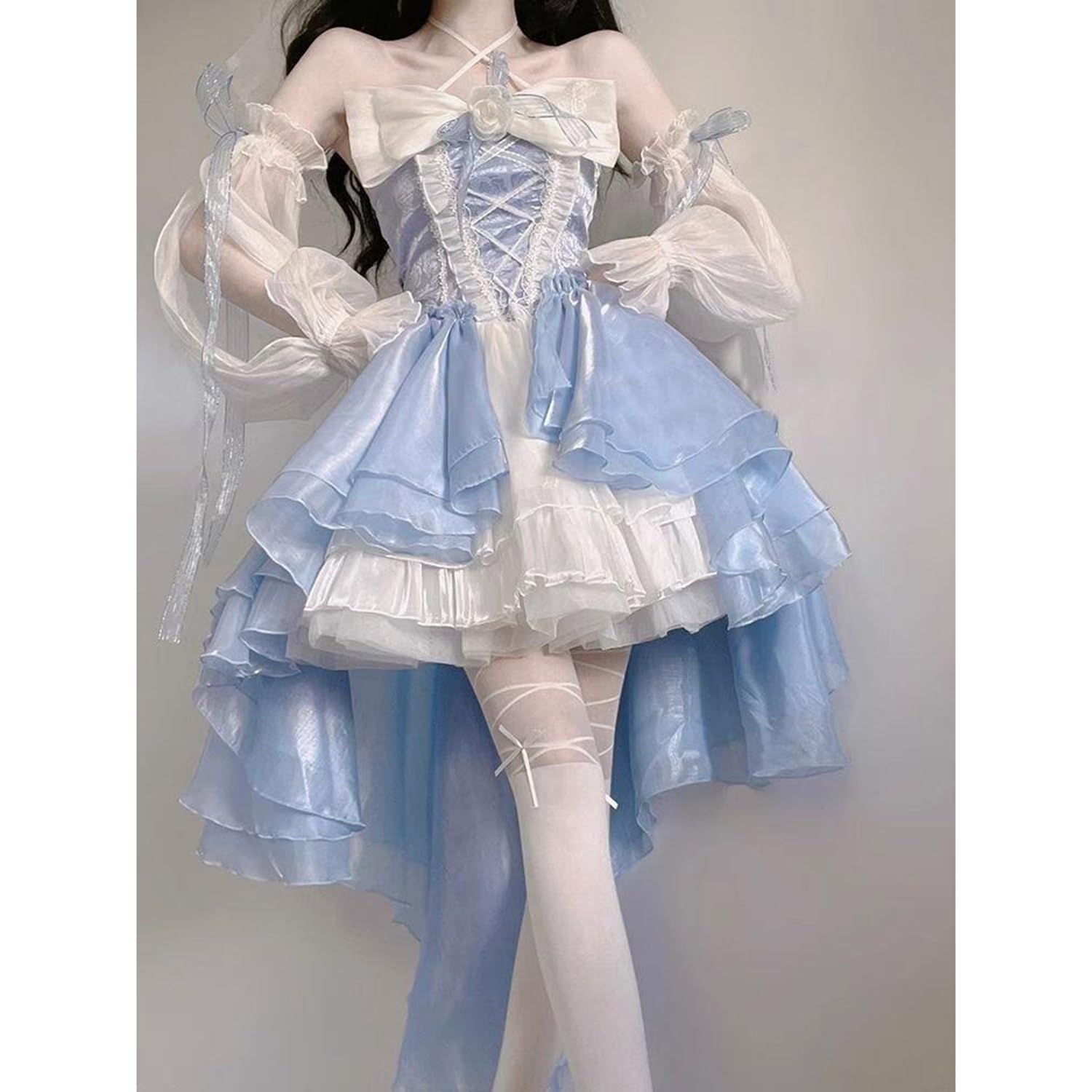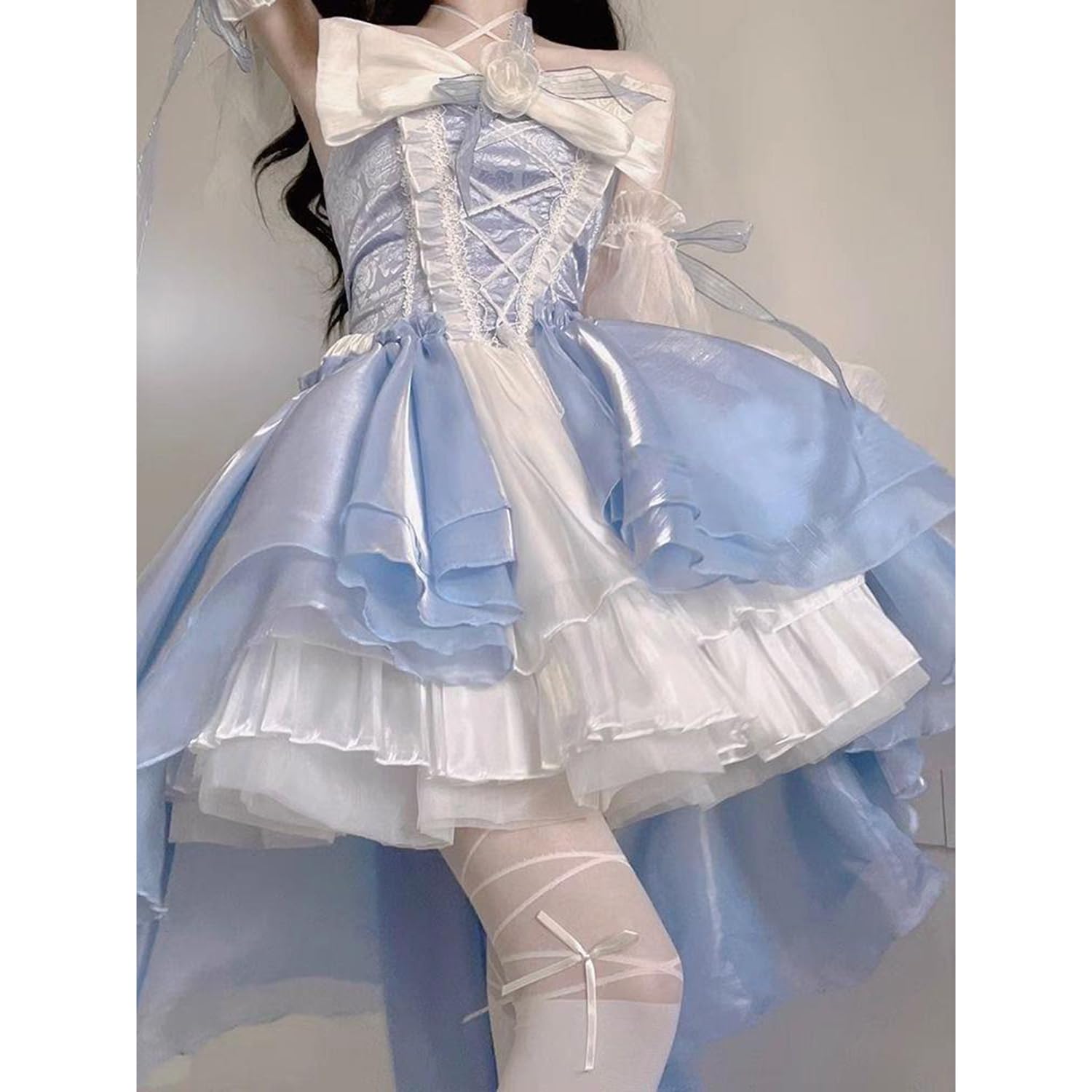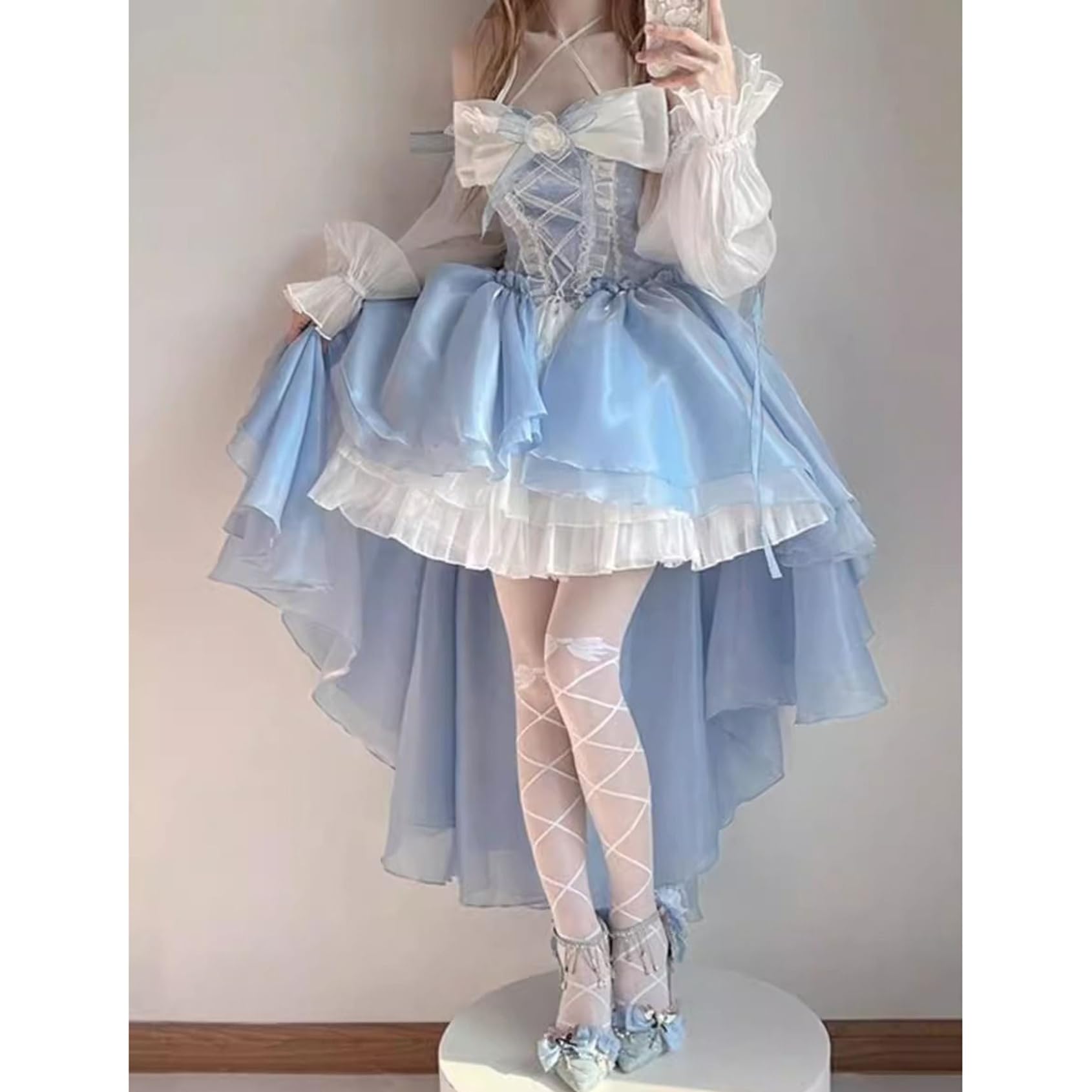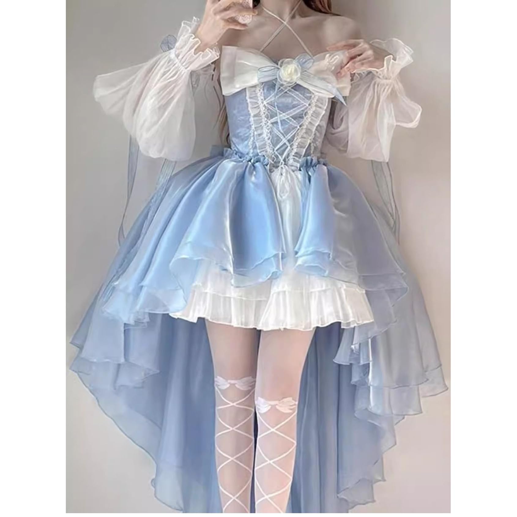 [ボズとガルヤ] 森ガールワンピース 姫袖 長い裾 オフショルダー 透け感 長袖 大きいリボン 宮殿風 ドレス フリル 貴族風 花嫁 水色 ゆめかわいい レース cosplay お嬢様 パーティー