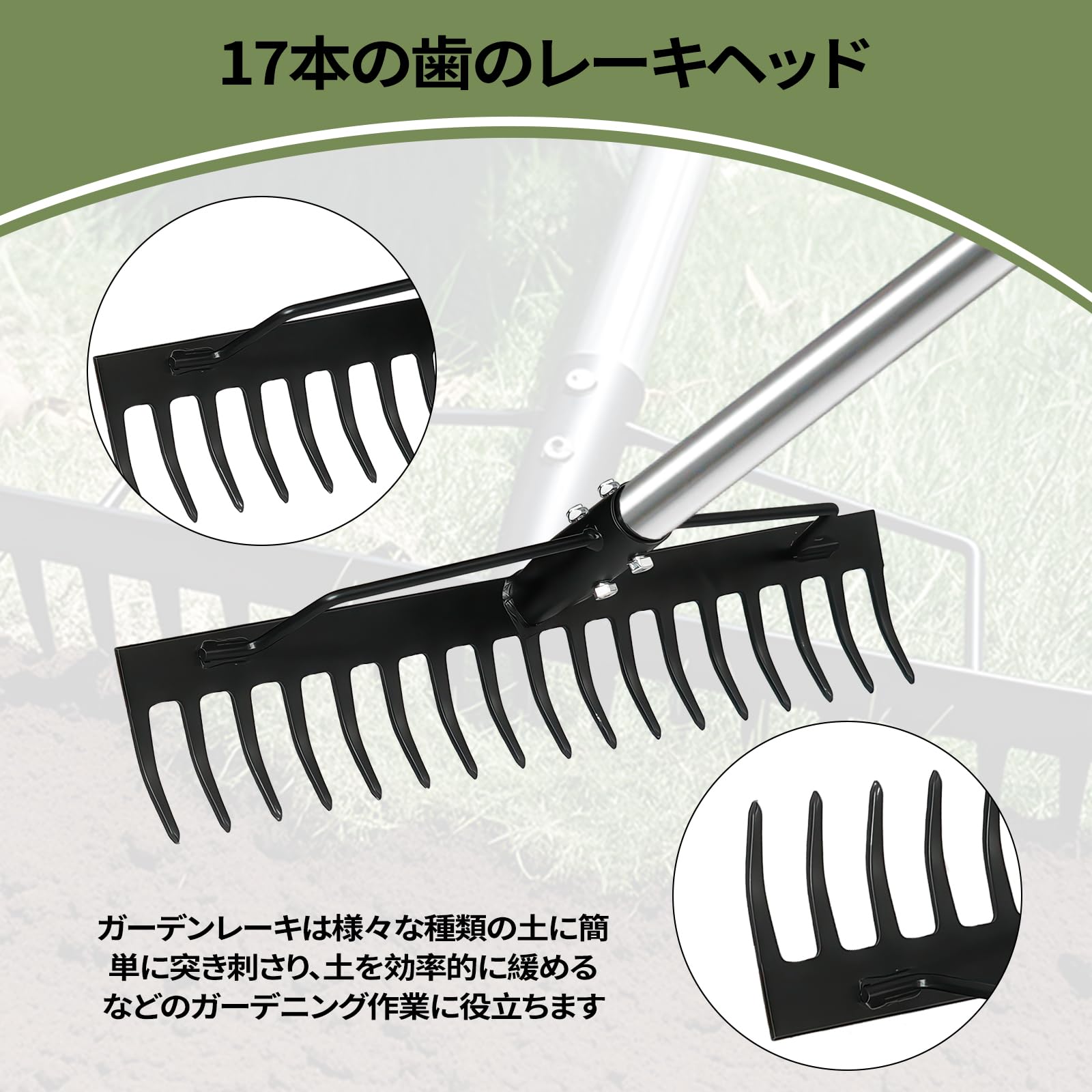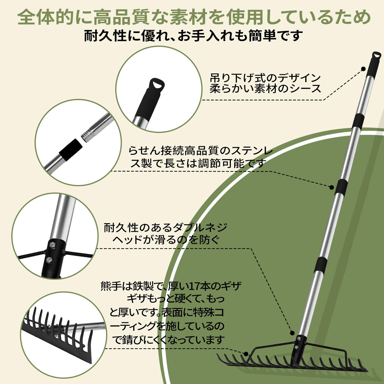HeGeed レーキ 熊手 ガーデンレーキ 伸縮レーキ 長さ調節可能 87.5cm-167cm ステンレス柄付 スチール17爪 メタルヘッド 吊り下げ式 軽量 落葉掃き 整地作業/園芸/芝生のサッチ取り 園芸用農具