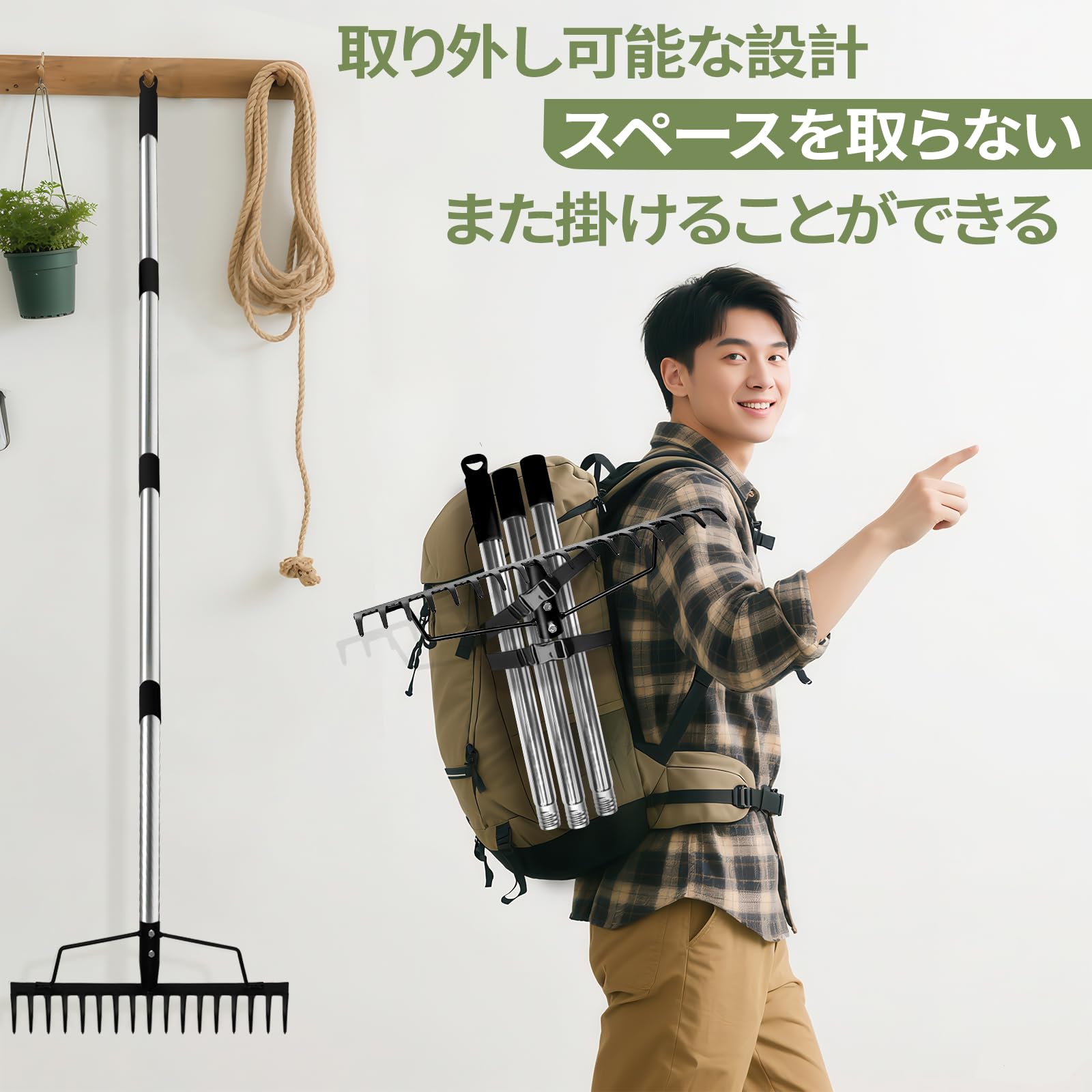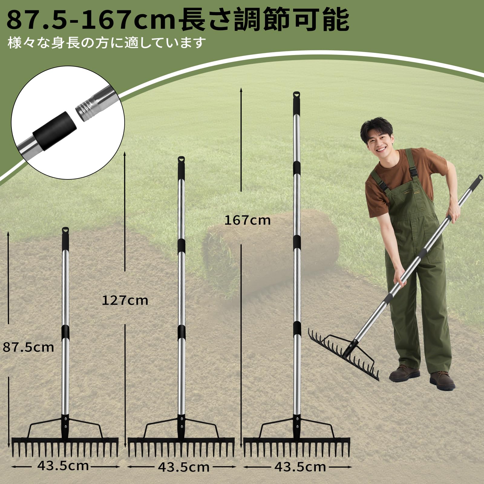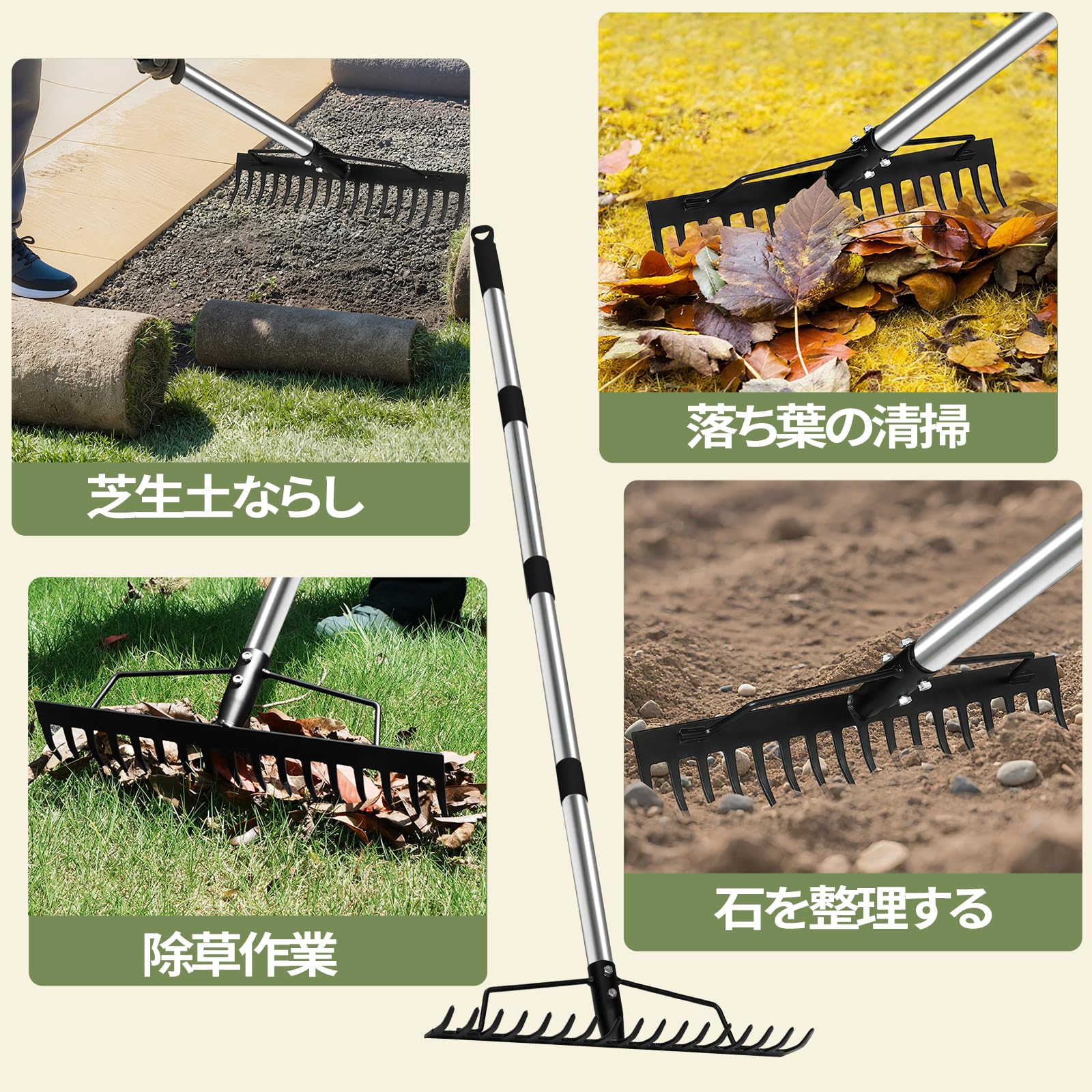 FQIPEI 熊手 伸縮レーキ 1.3m ステンレス柄付 21本爪 メタルヘッド 頑丈なレーキ 芝生のサッチ取りレーキ 草刈り 落葉集め 整地作業 土壌緩和 園芸用農具