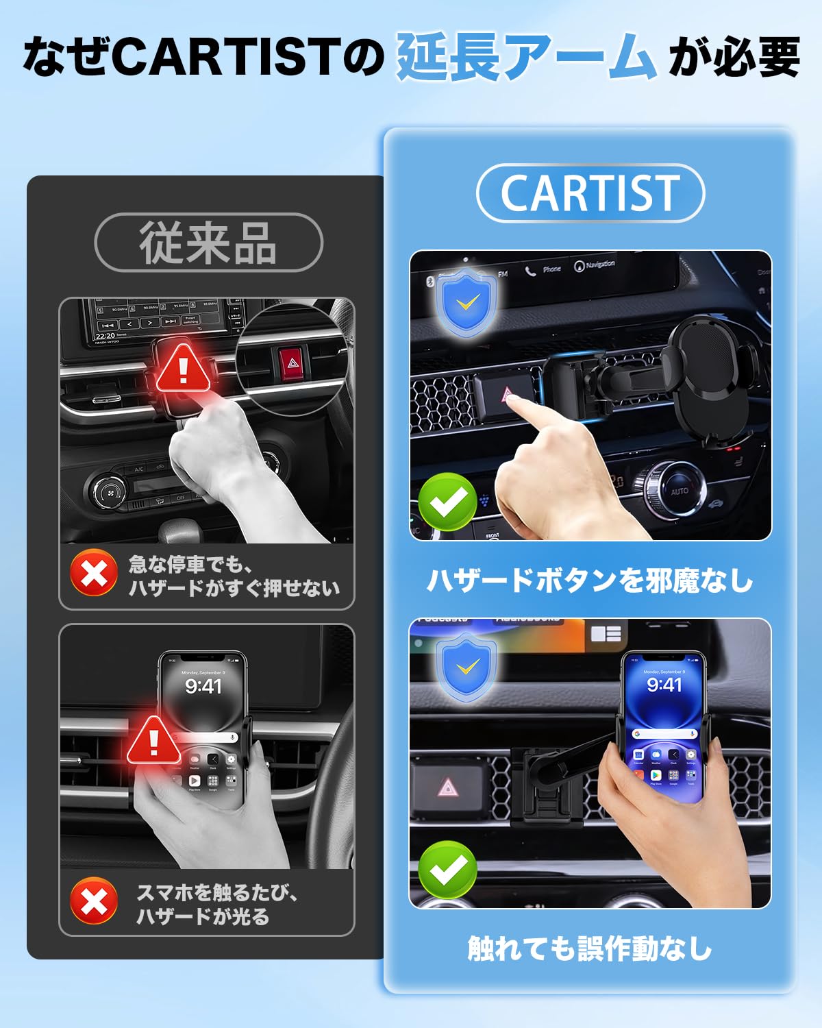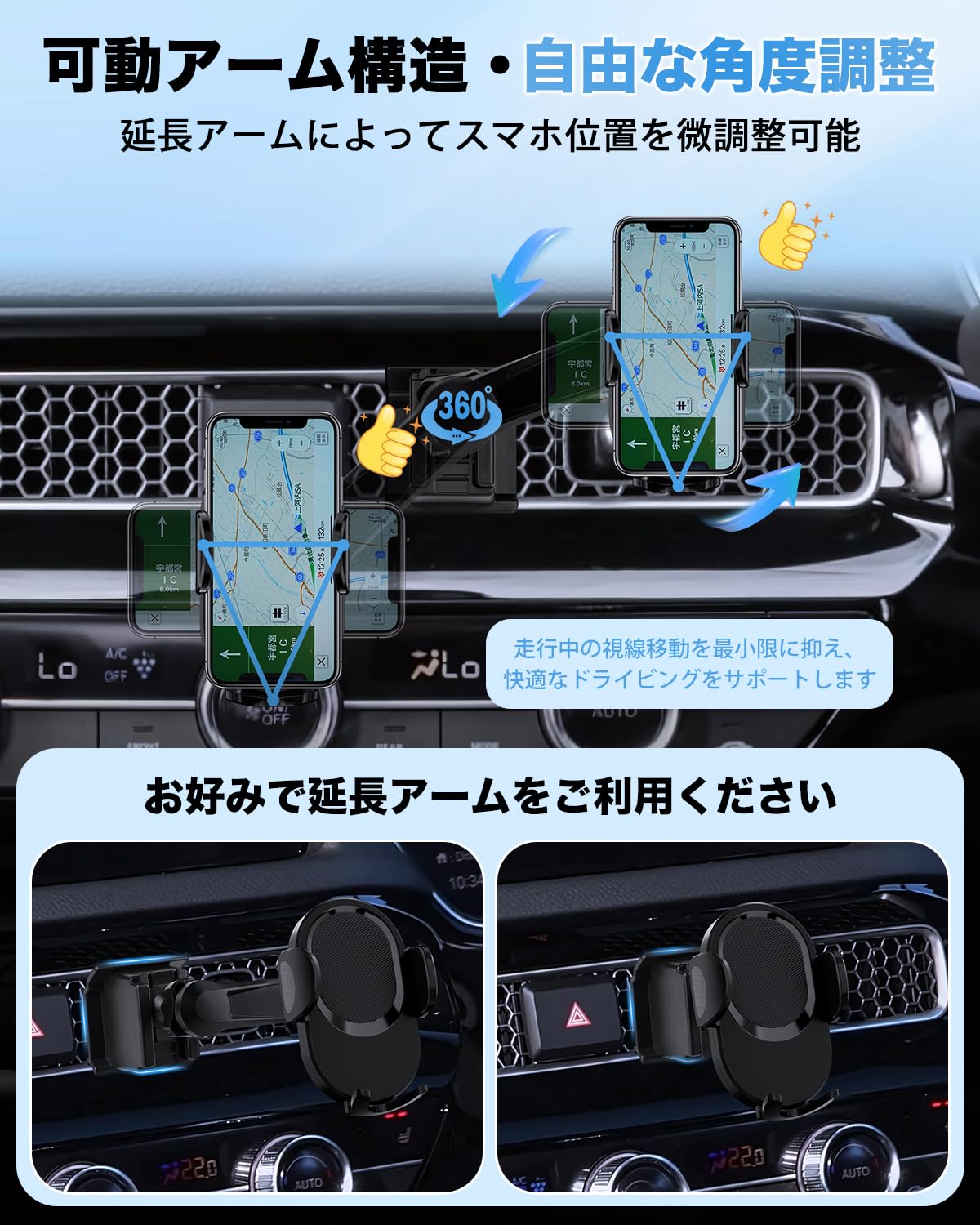 CARTIST トヨタに適合 C-HR スマホホルダー CHR NGX10/50/ZGX10/ZYX11型 スマホスタンド 携帯ホルダー 延長アーム付き【ハザードボタンを邪魔なし】 安定固定 車載ホルダー 360度回転 落下防止 縦横向き可 ほとんどのスマホ対応 パーツ アクセサリー 内装 取付簡単