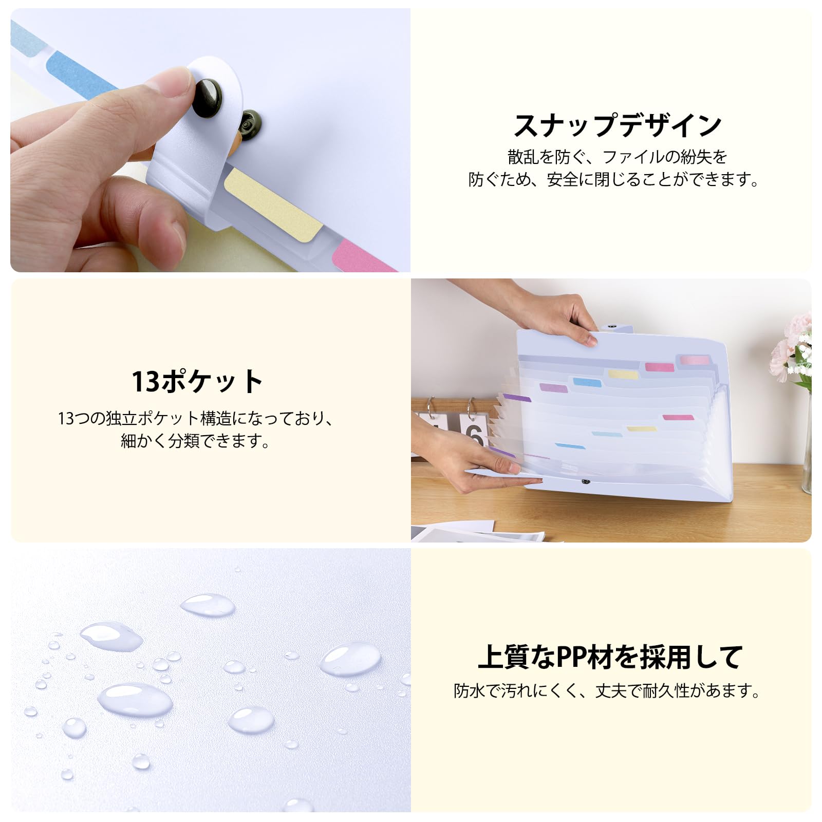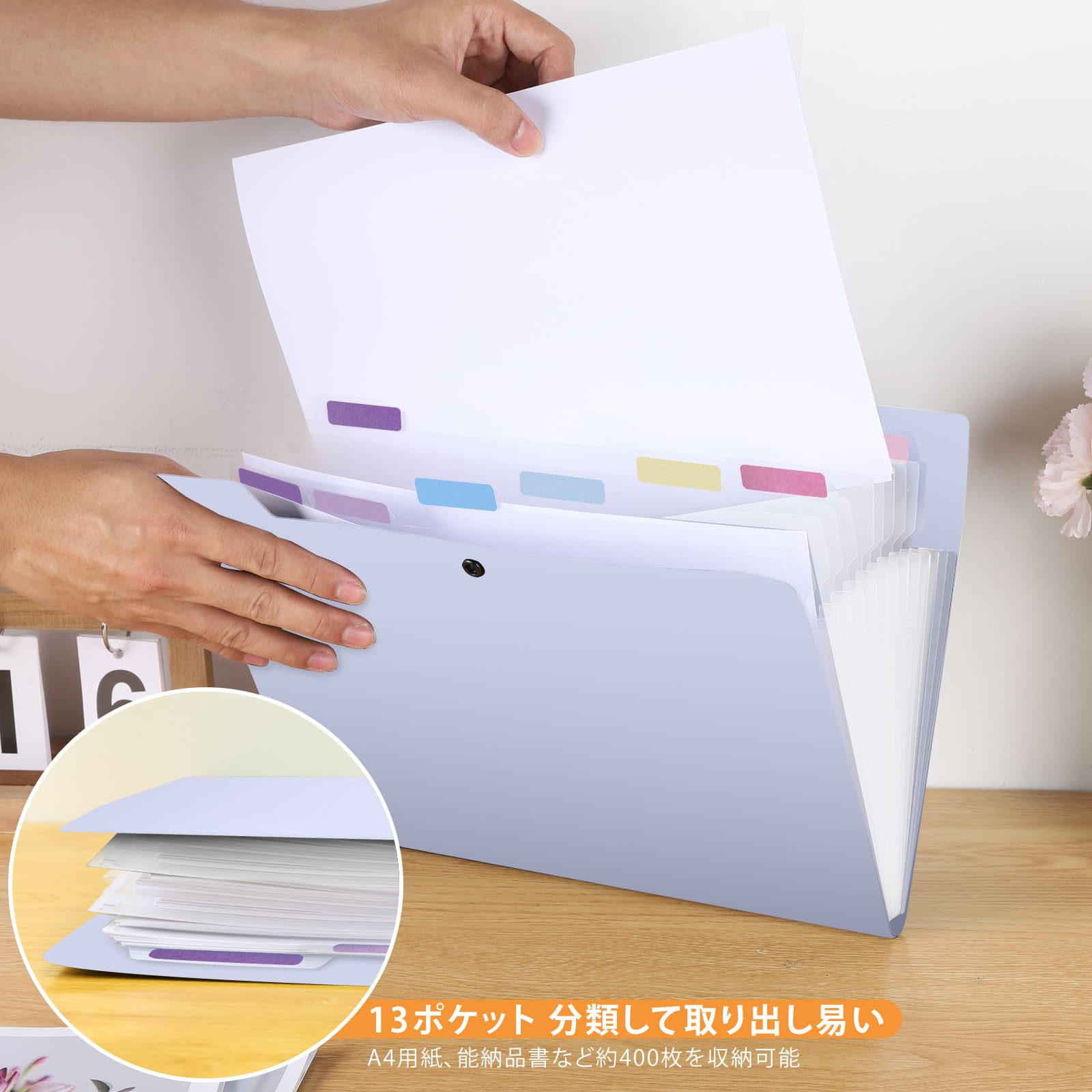 Homdolaser ドキュメントスタンド A4 アコーディオンファイル 13ポケット 書類収納ケース 色別ファイリング 区分けラベル付き 大容量 伸縮 蓋付き 自立式 12仕切り