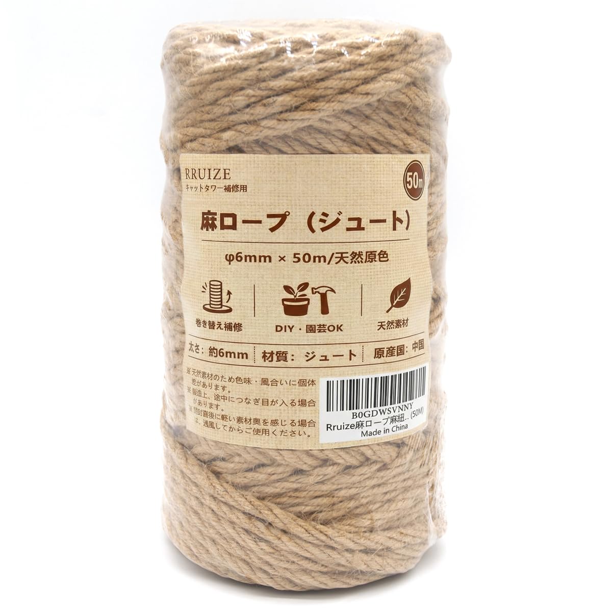 Rruize 麻紐 麻ロープ 麻縄6mmx50mキャットタワーリペアロープ 太さ6mm 麻縄 爪とぎ用 猫タワー キャットウォーク キャットタワー用 キャットクライミングフレームの修理の代替品 手作り DIY 園芸(50M)