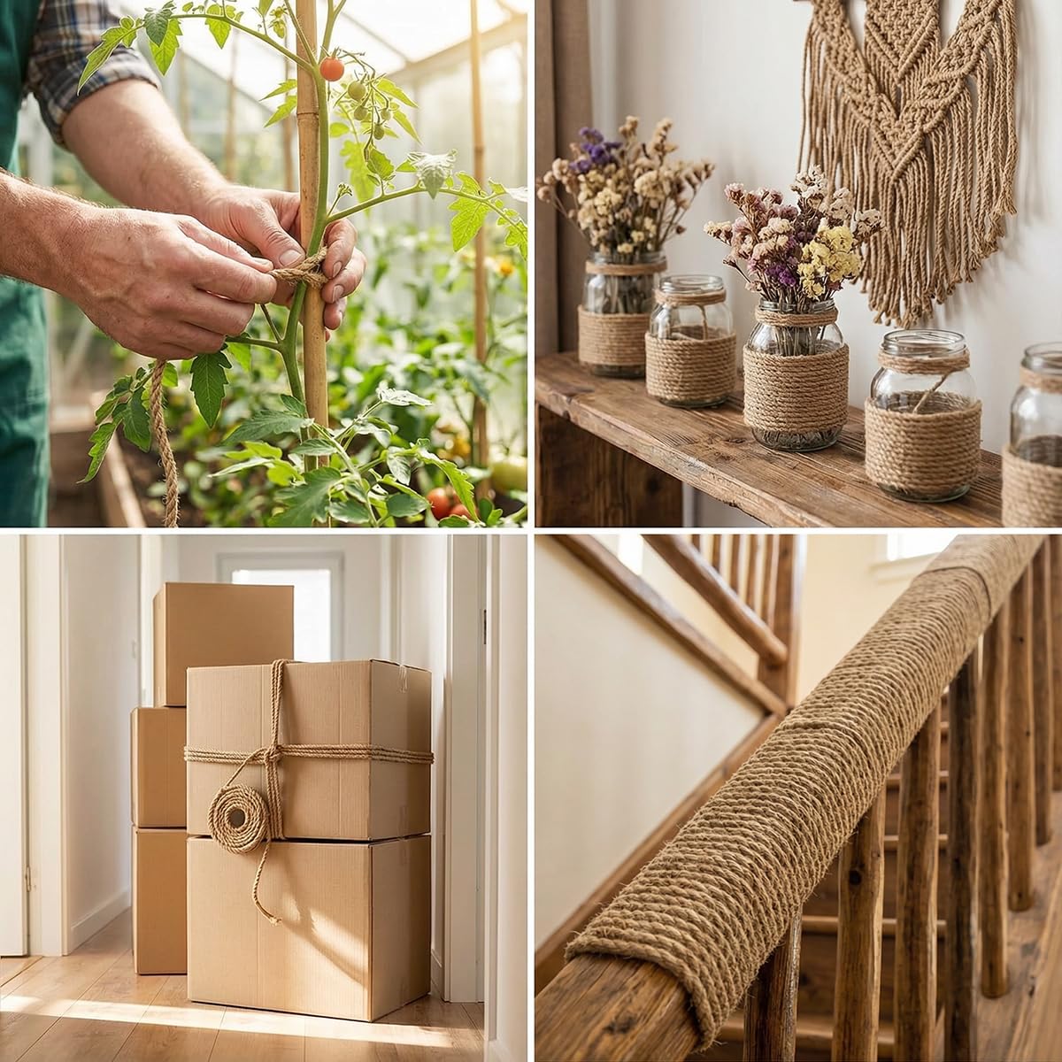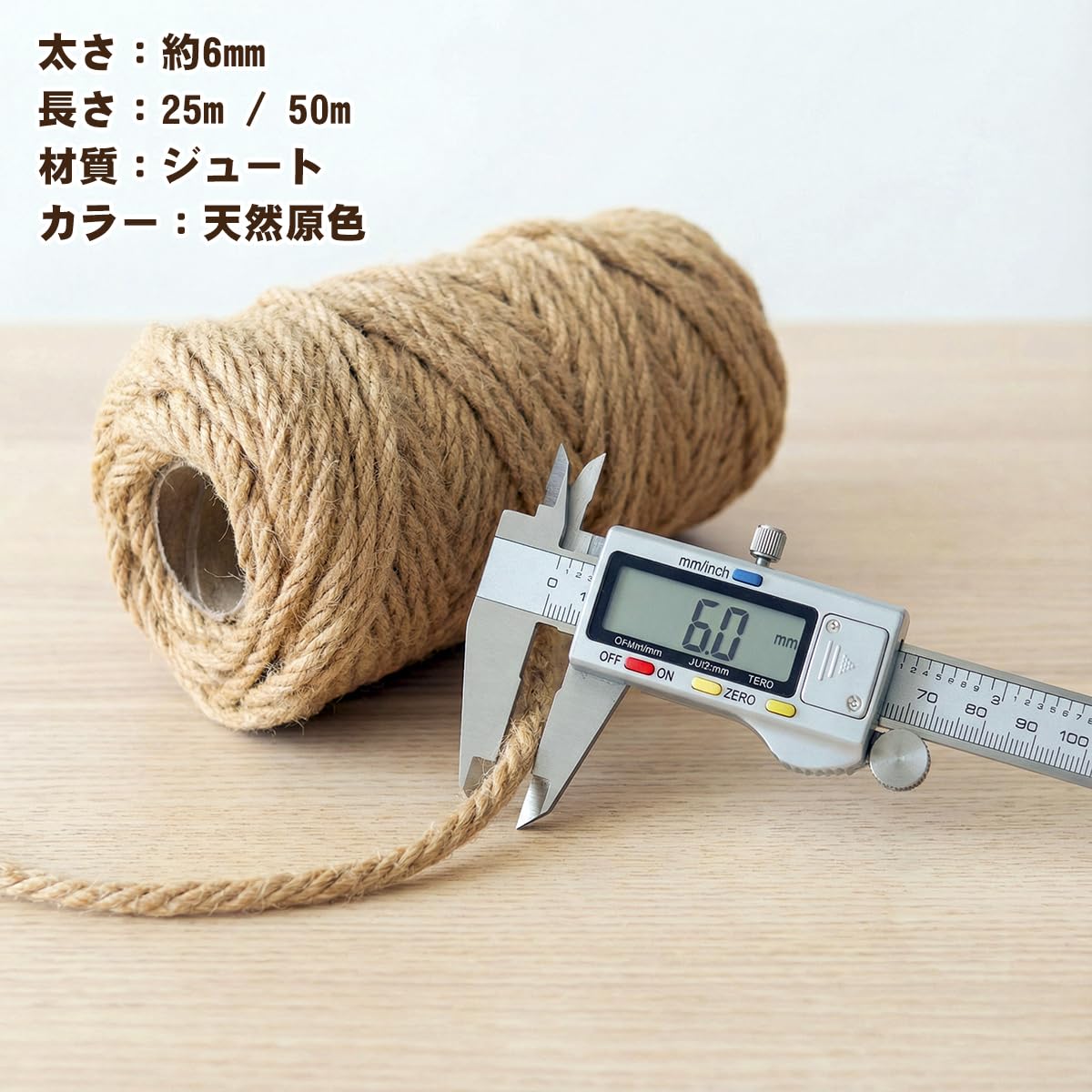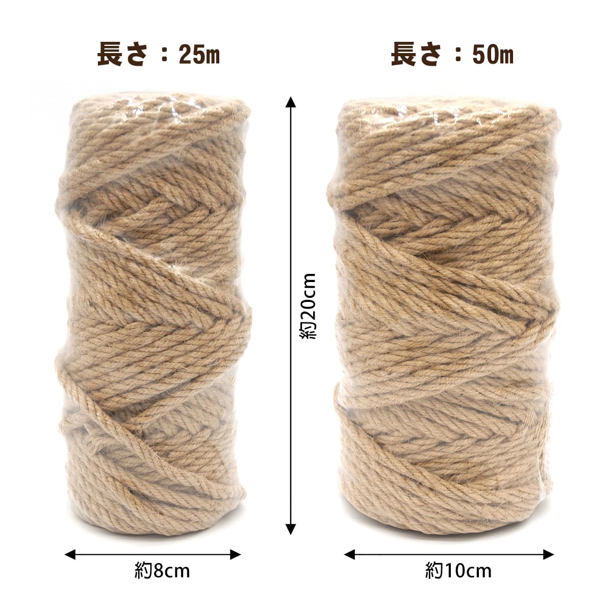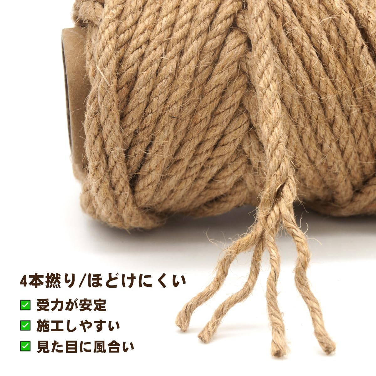 太さ6mm、長さ50m。天然黄麻100%使用の麻ひもで、使用後は土に還る環境に優しいロープです。 植木や果樹の根縛り・枝縛り・誘引・倒木お越しや農作物の結束や樹木の枝吊り・雪吊りに便利な麻縄です。 DIYで住宅の階段手摺りに巻き付けて美装や滑り止めにしたり、木工作の部材にしたり、又猫の爪とぎ、キャットタワー修復にも利用されています。