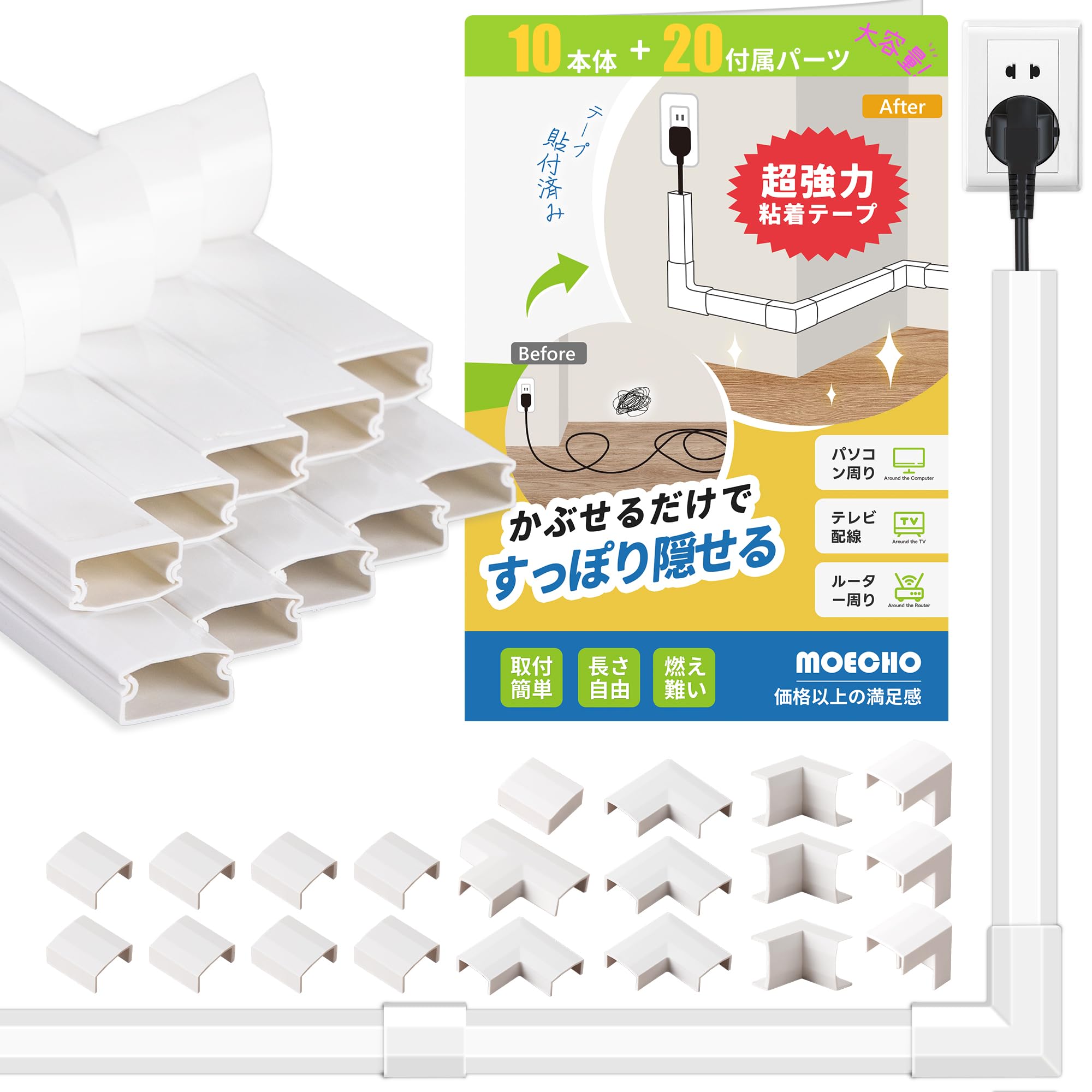 配線カバー コード隠し ケーブルカバー 【豊富なパーツ・テープ貼付済み・選べるサイズ展開】 配線モール ケーブル隠し コードカバー ケーブル カバー 配線隠し 電源コード モール lanケーブル 壁に這わせる 簡単設置 自由カット白 壁 床 テレビ コンピューター (白、カバー×10+パーツ×20, 30×2×0.9cm)