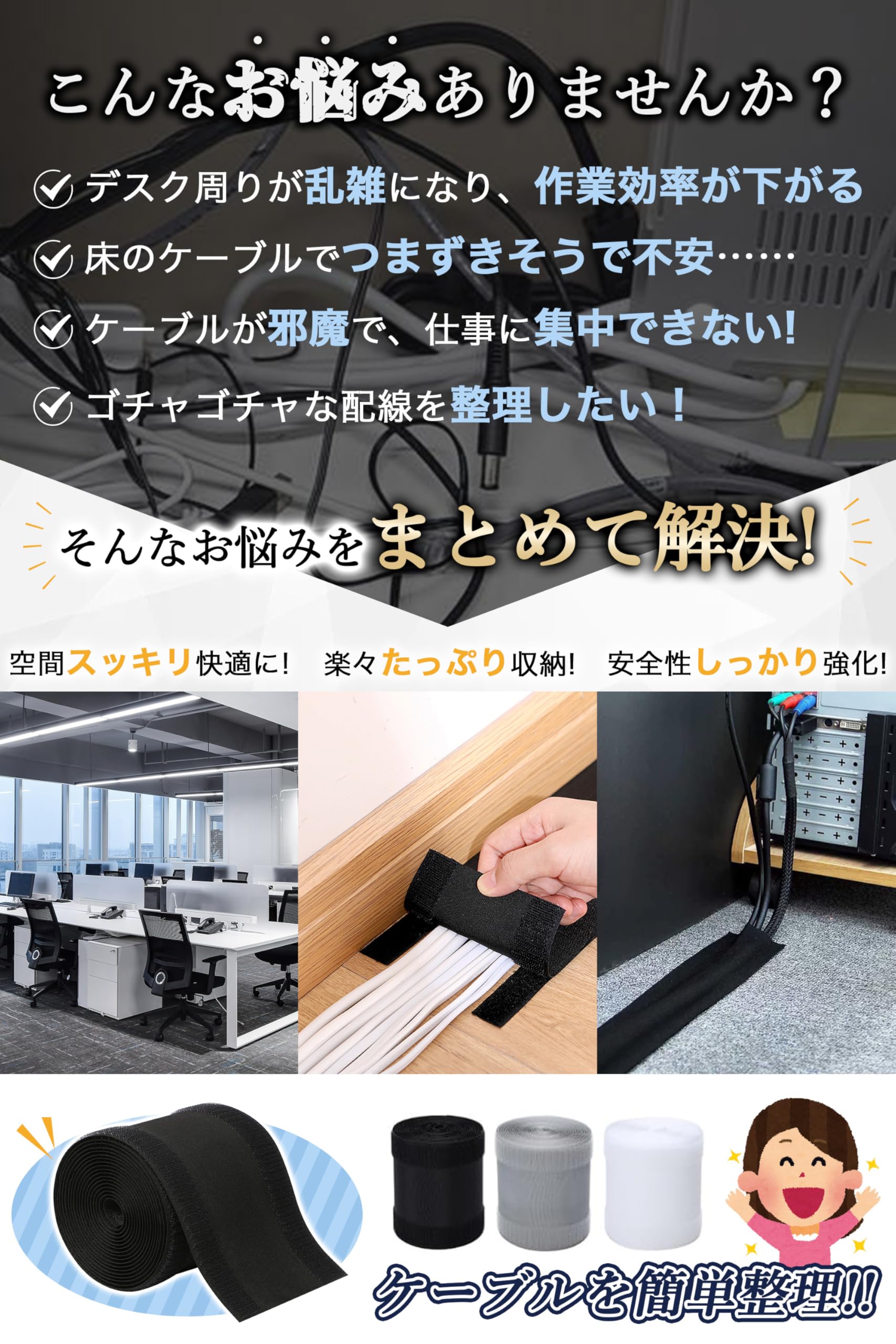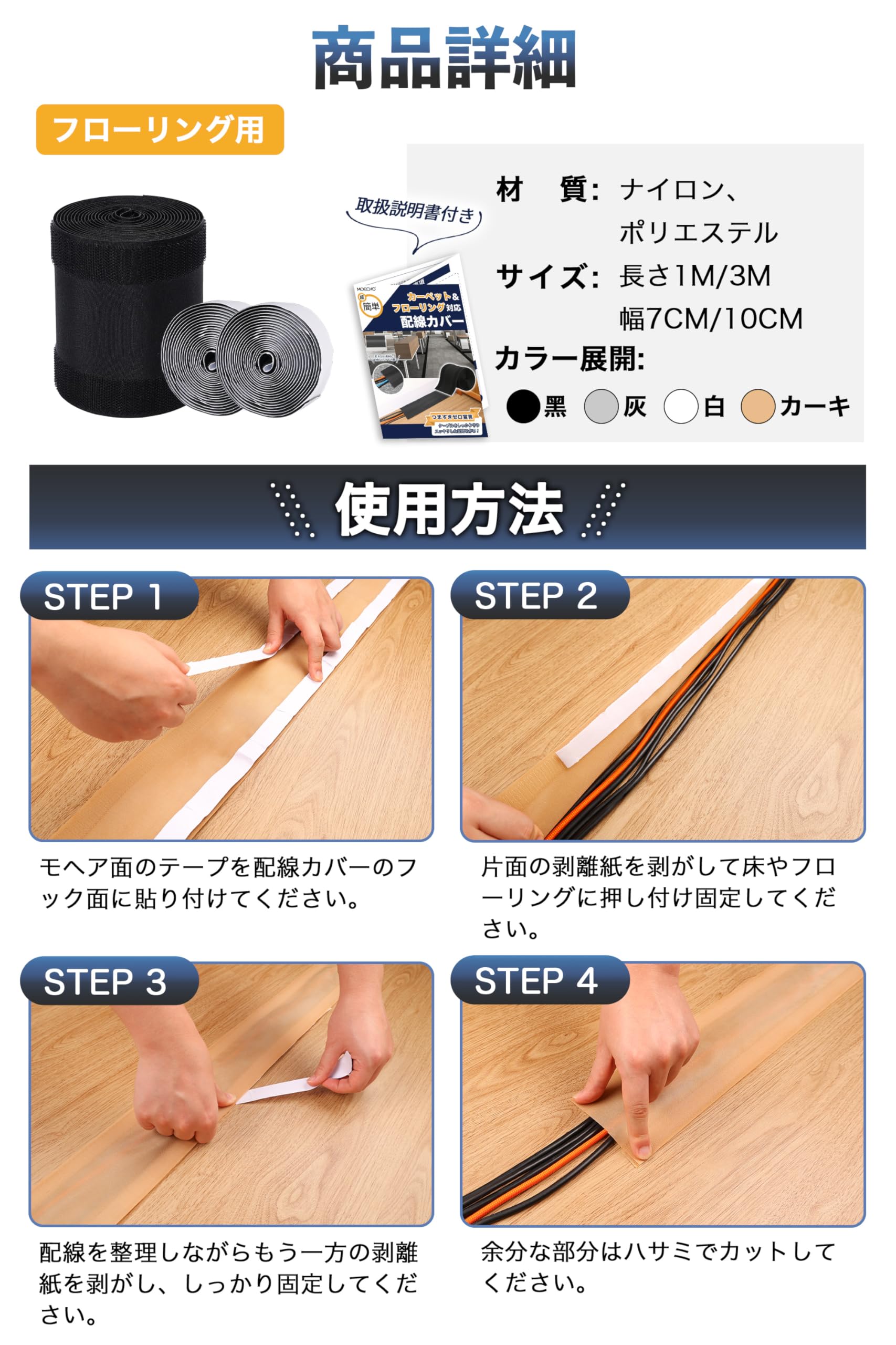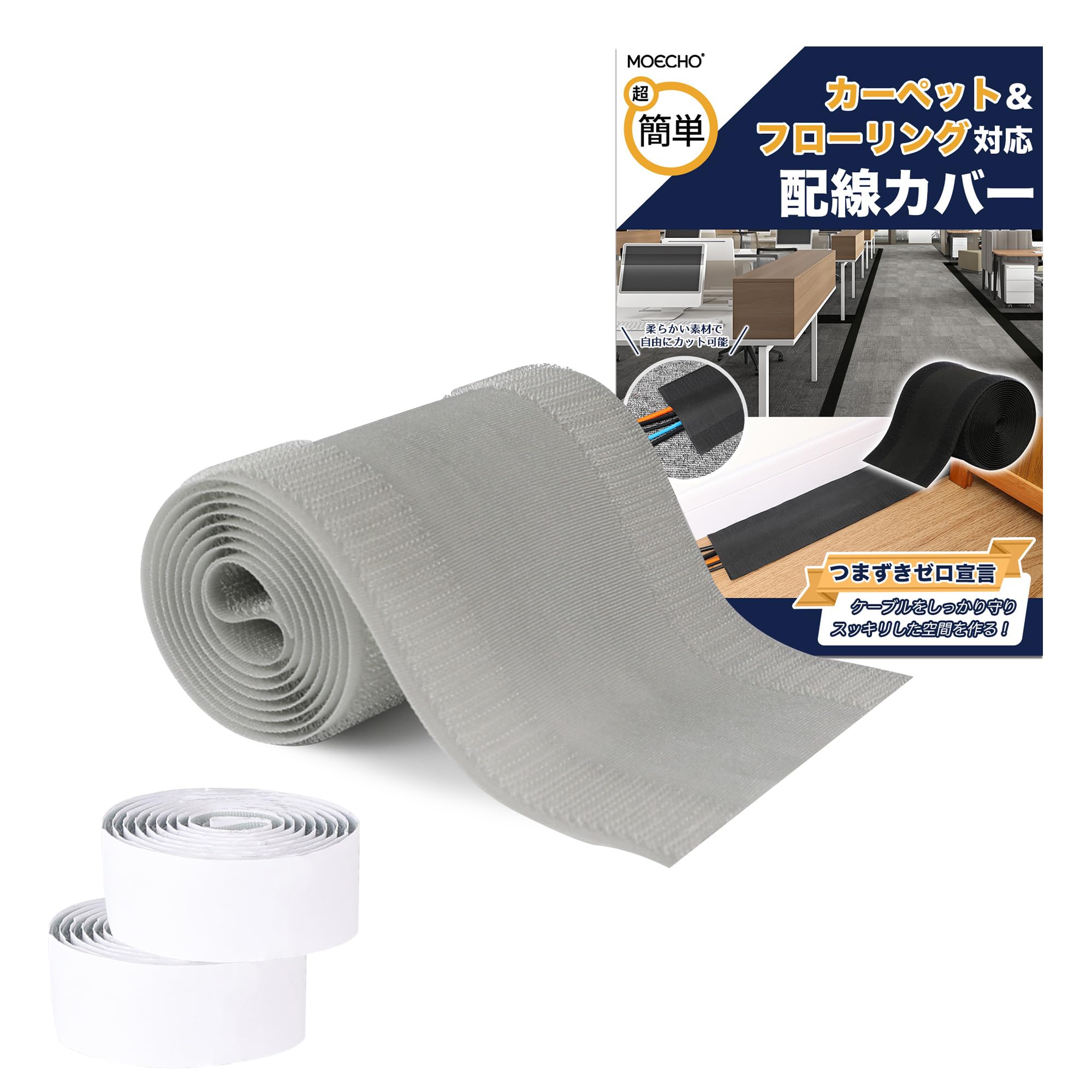 配線カバー 配線隠し 【自由にカット・10cm×1m・繰り返し使用可能】 配線 カバー ケーブルカバー コード隠し ケーブル コード 隠し 配線カバー コードカバー つまずき 感電 防止 マジックテープ 面ファスナー フロア カーペット 床 絨毯 pcデスク 適用 オフィス 倉庫 家庭用 (グレー×フローリング用【モヘア面テープ付き】)