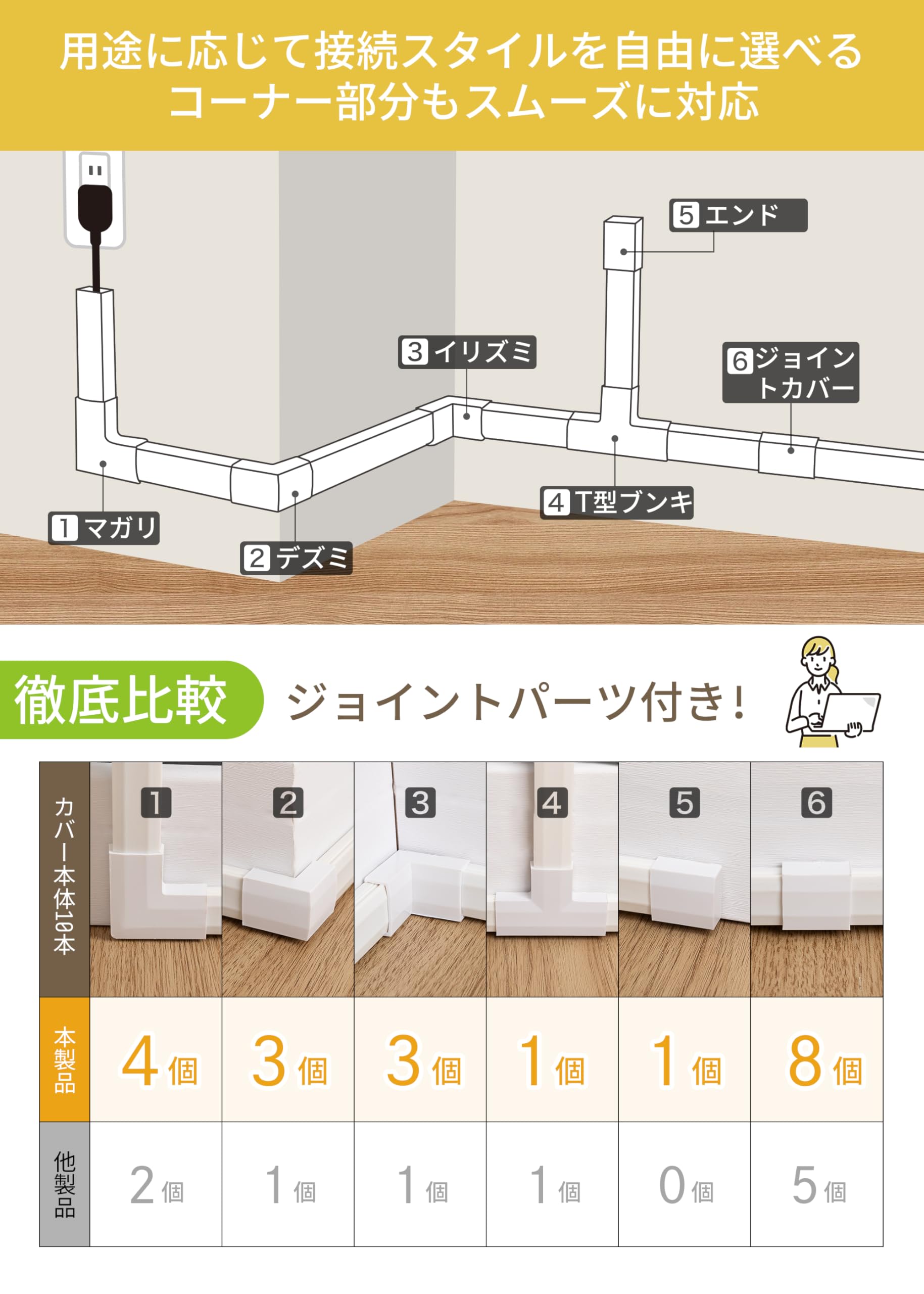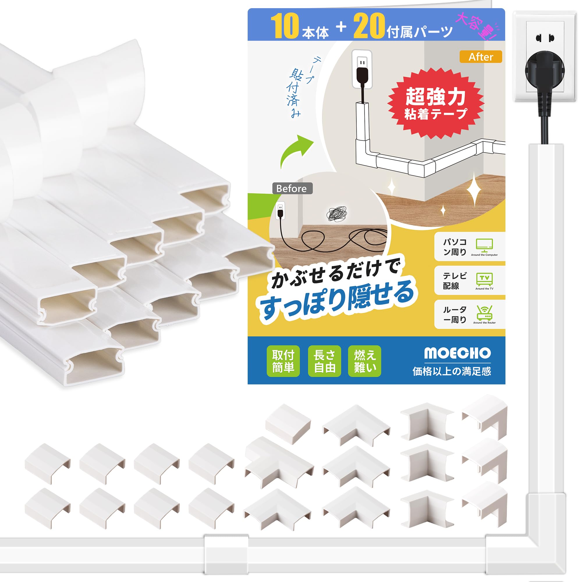 配線カバー コード隠し ケーブルカバー 【豊富なパーツ・テープ貼付済み・選べるサイズ展開】 配線モール ケーブル隠し コードカバー ケーブル カバー 配線隠し 電源コード モール lanケーブル 壁に這わせる 簡単設置 自由カット白 壁 床 テレビ コンピューター (白、カバー×10+パーツ×20, 30×1.5×0.9cm)