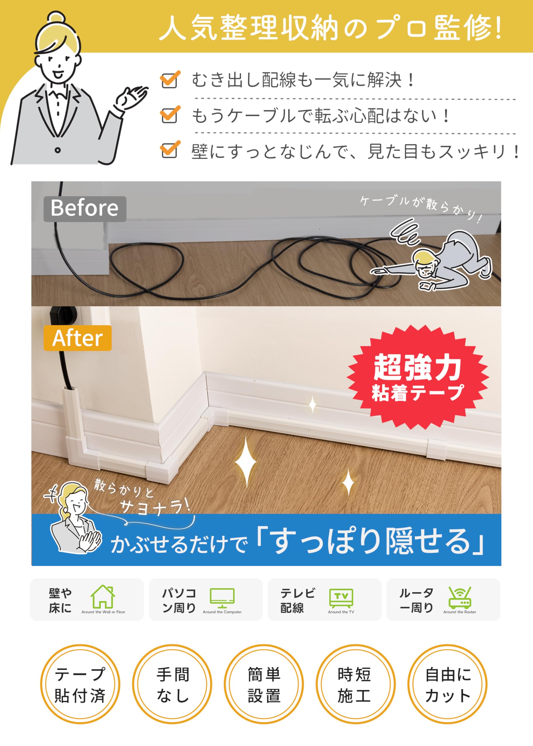 配線カバー コード隠し ケーブルカバー 【豊富なパーツ・テープ貼付済み・選べるサイズ展開】 配線モール ケーブル隠し コードカバー ケーブル カバー 配線隠し 電源コード モール lanケーブル 壁に這わせる 簡単設置 自由カット白 壁 床 テレビ コンピューター (白、カバー×15+パーツ×31, 30×1.5×0.9cm)