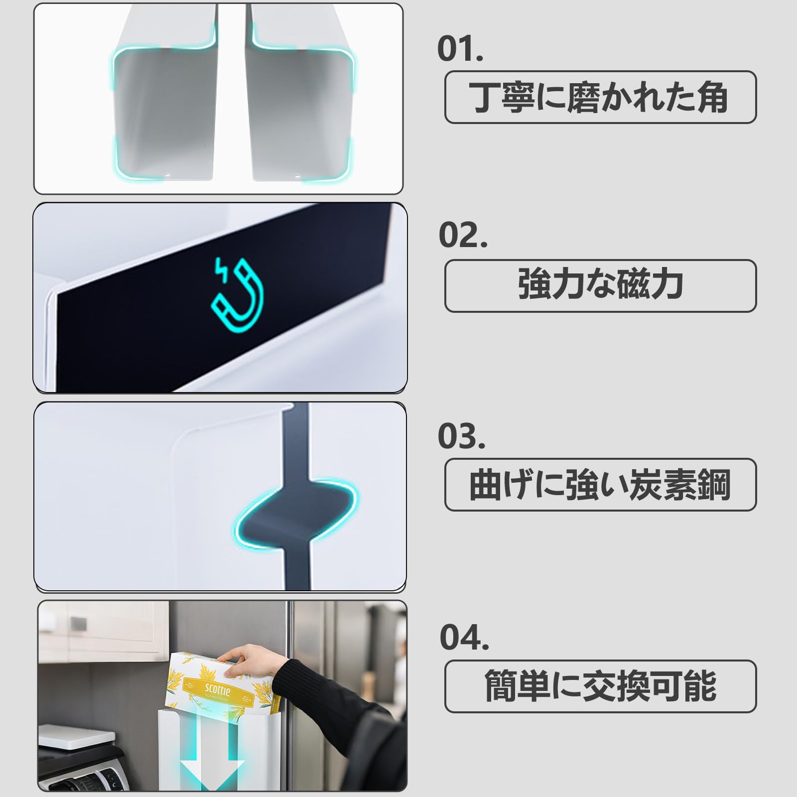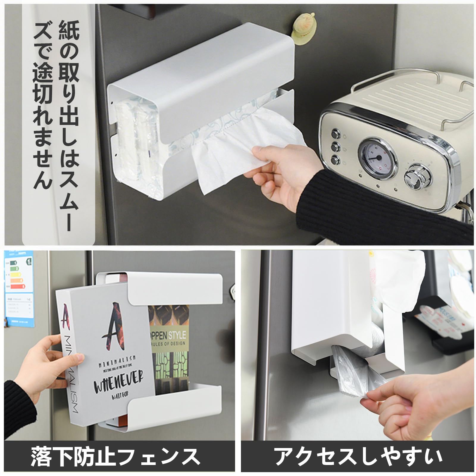 Wowfill マグネット ティッシュケース ペーパーホルダー 長方形 片手で切れる キッチン 浴室 お風呂 洗面台 収納(白)