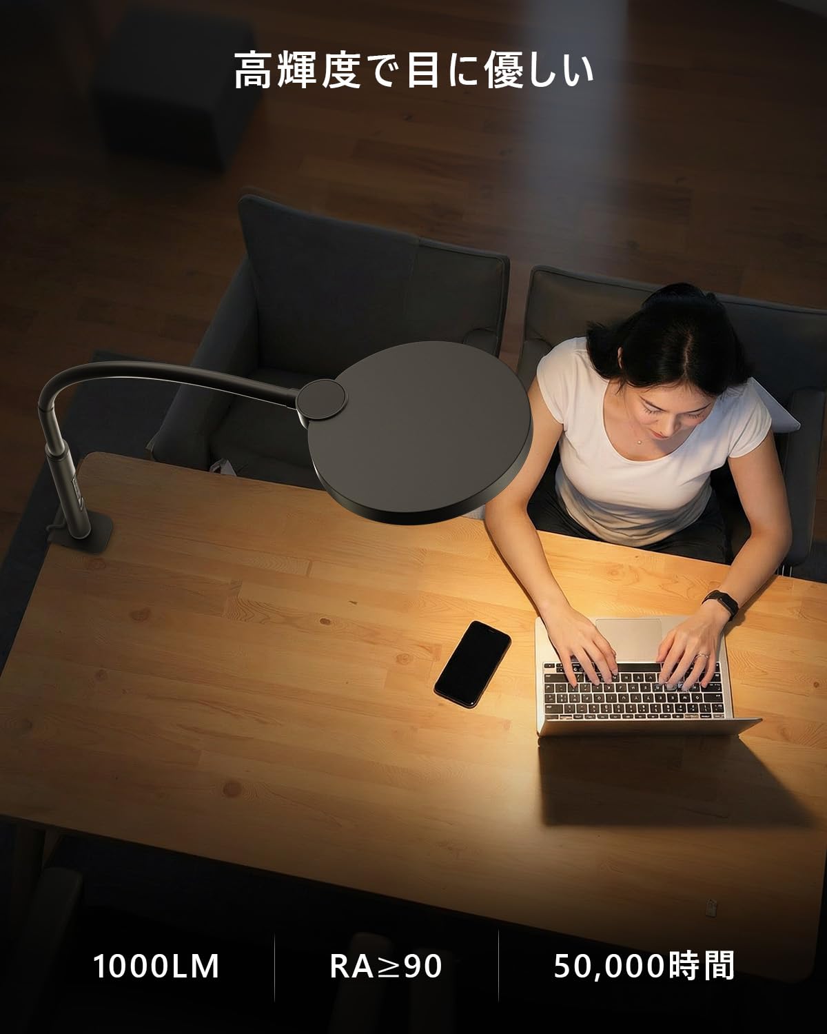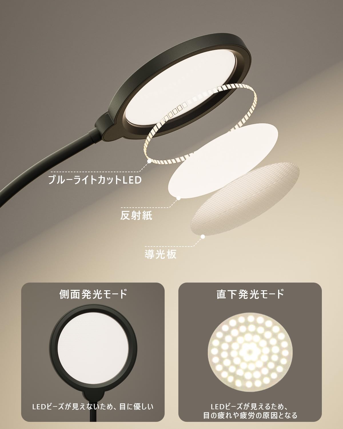 Jplednas デスクライト LED「クランプ式 ・5段階調光調色・多角度調節・タッチ操作・45分タイマー・記憶機能 」電気スタンド「円形面光源・高演色・目に優しい・12W・1000LM」 明るい卓上ライト 読書/勉強/仕事用(ブラック )