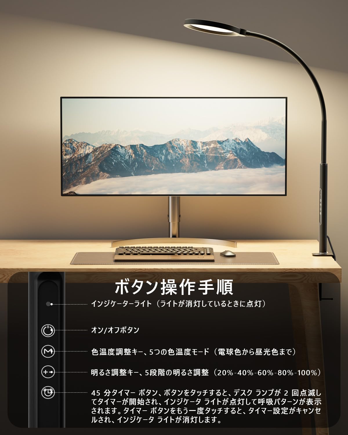 デスクライト LED,ピアノライト,目に優しい 卓上ライト,広い照射エリア,3種類の色調(電球色・白色・昼光色), 5段階の調光機能,高輝度1100lm,Ra90演色,360°角度調整可能, タッチキー,タイマー機能,USB/ACアダプター給電,電気スタンド,スタンドライト,譜面台用ライト,読書灯,勉強 寝室 仕事 ブックライト,黒