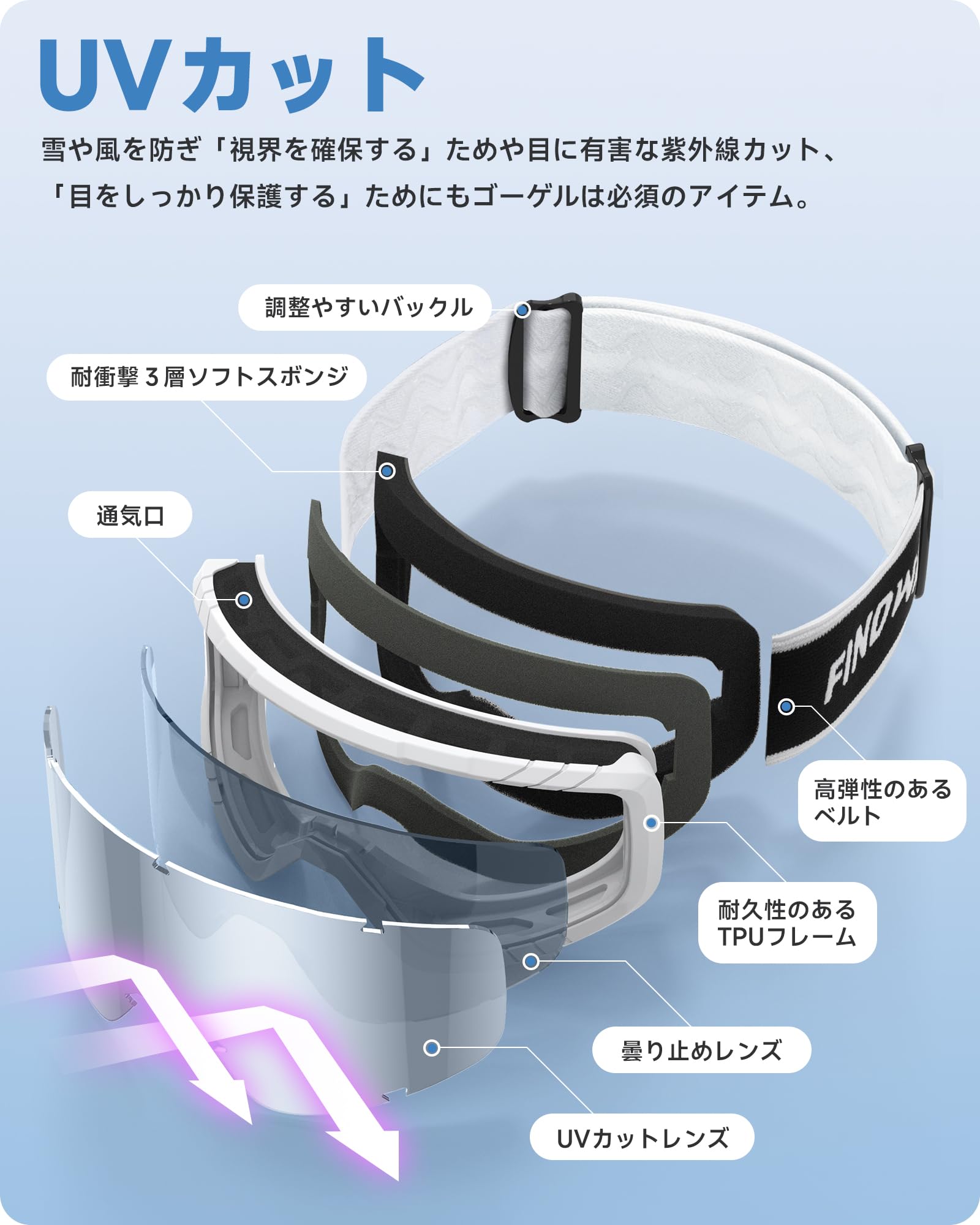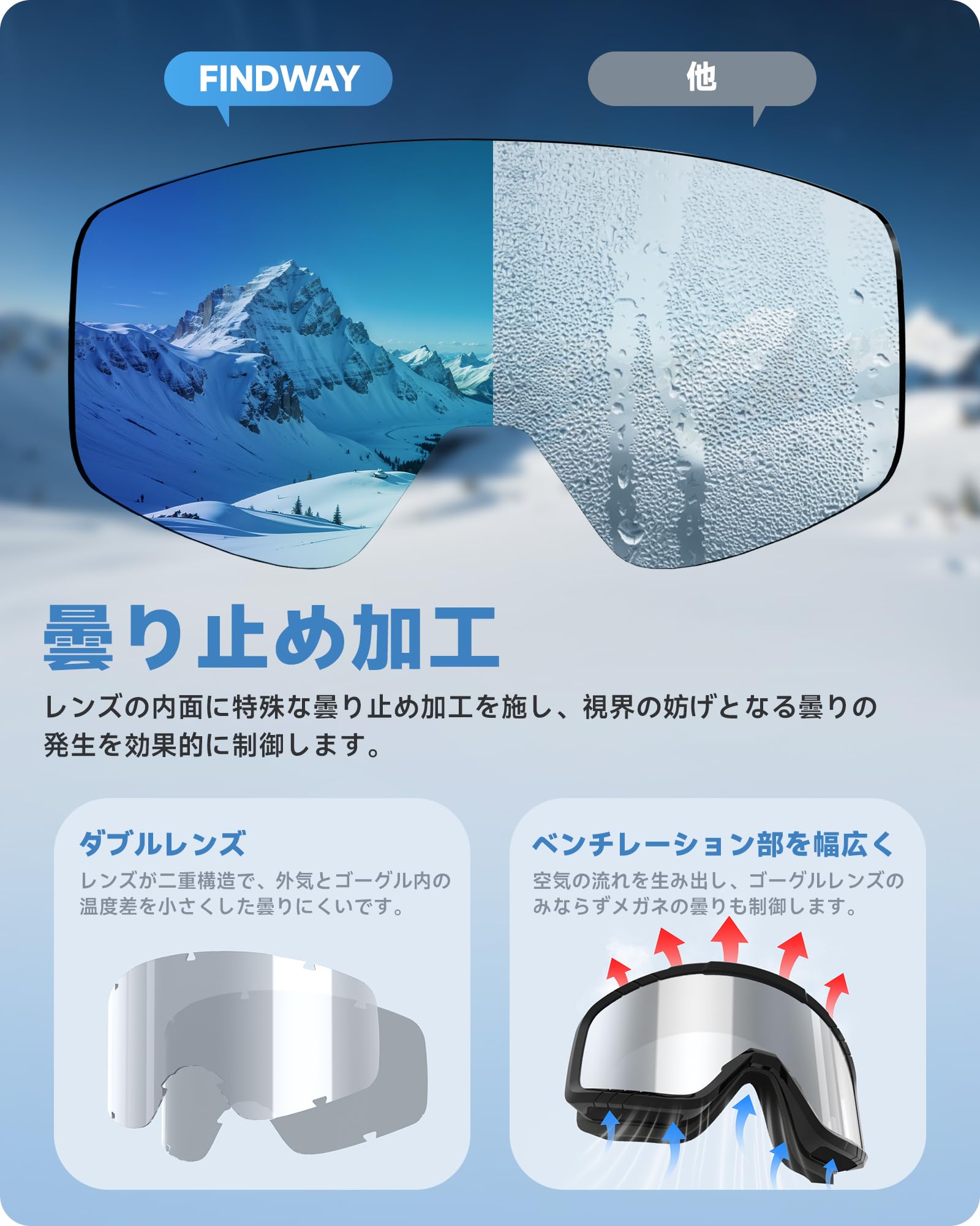 [Findway] スキーゴーグル スノボ ゴーグル スノーボードゴーグル 眼鏡対応 レディース メンズ スノーゴーグル UV400保護 OTG 広視野球面レンズ 防風/防雪/紫外線防止/曇り止め 軽量と耐衝撃 ジュニア 大人男女兼用 登山 スキー 晴れ/曇り/全天候対応