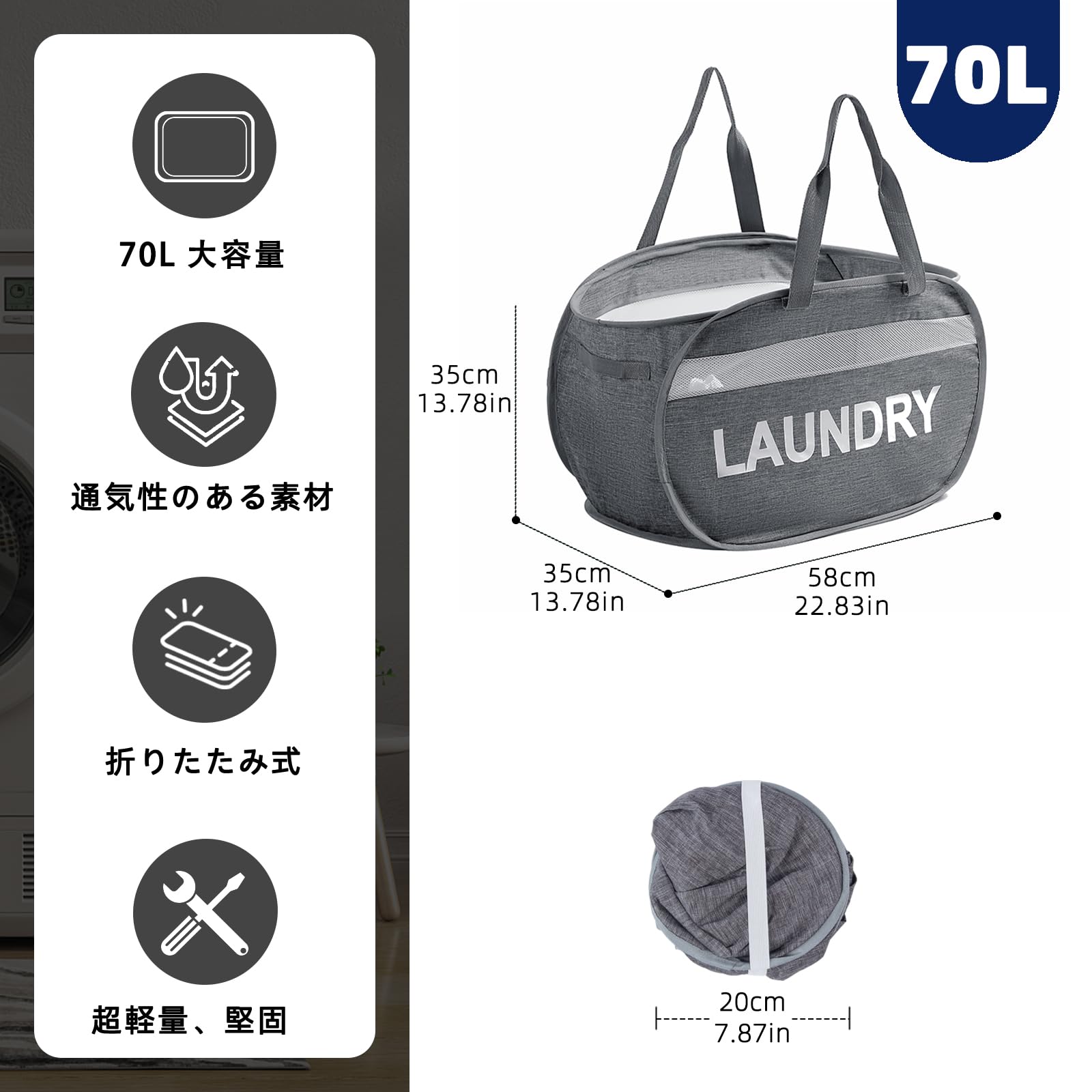 LunaMeet ランドリーバスケット 折りたたみ 破れにくい 70L 横型 洗濯カゴ 洗濯かご 大容量 メッシュ ランドリーバッグ ランドリーボックス 洗濯物入れ 収納 旅行 持ち運び可能 Laundry Basket Hamper