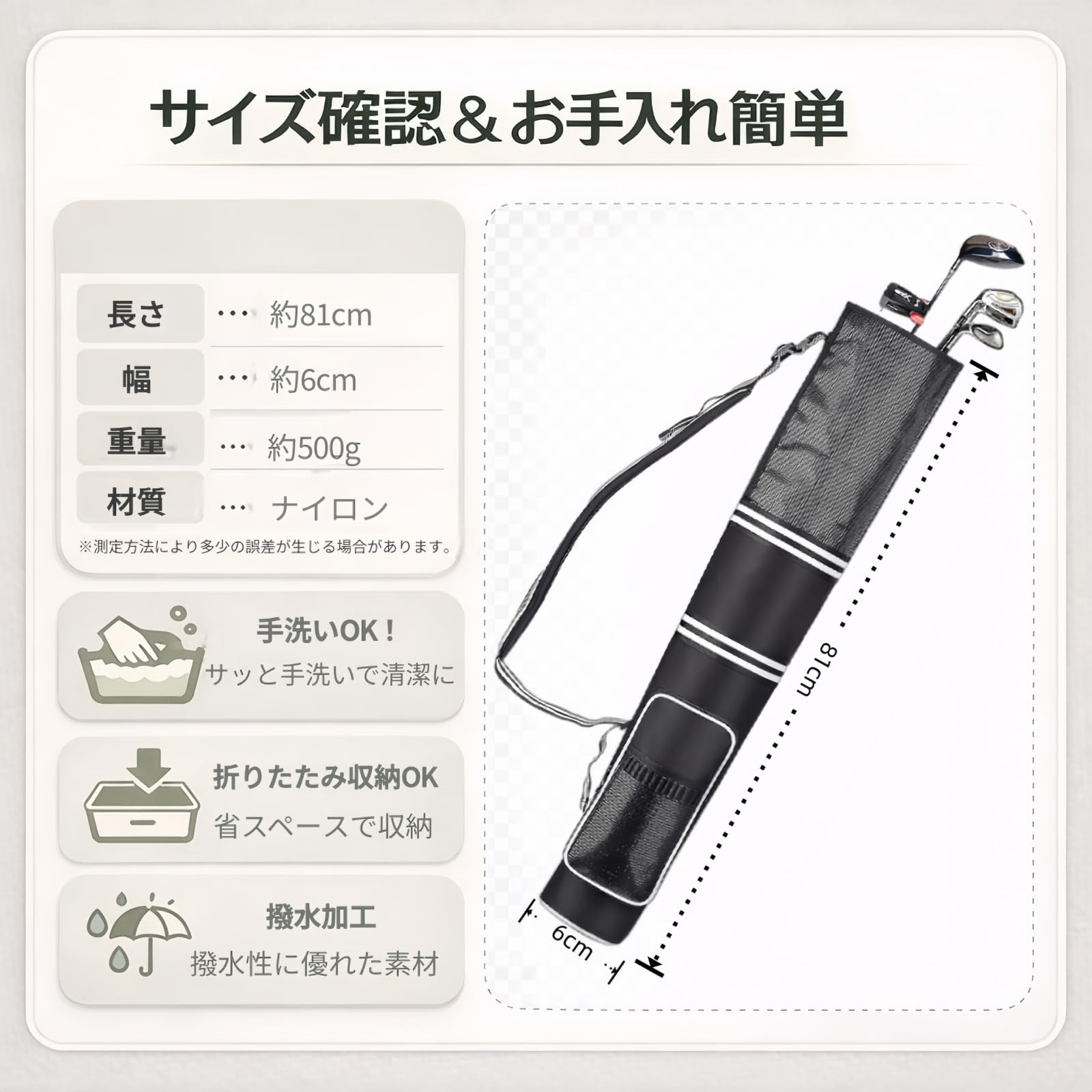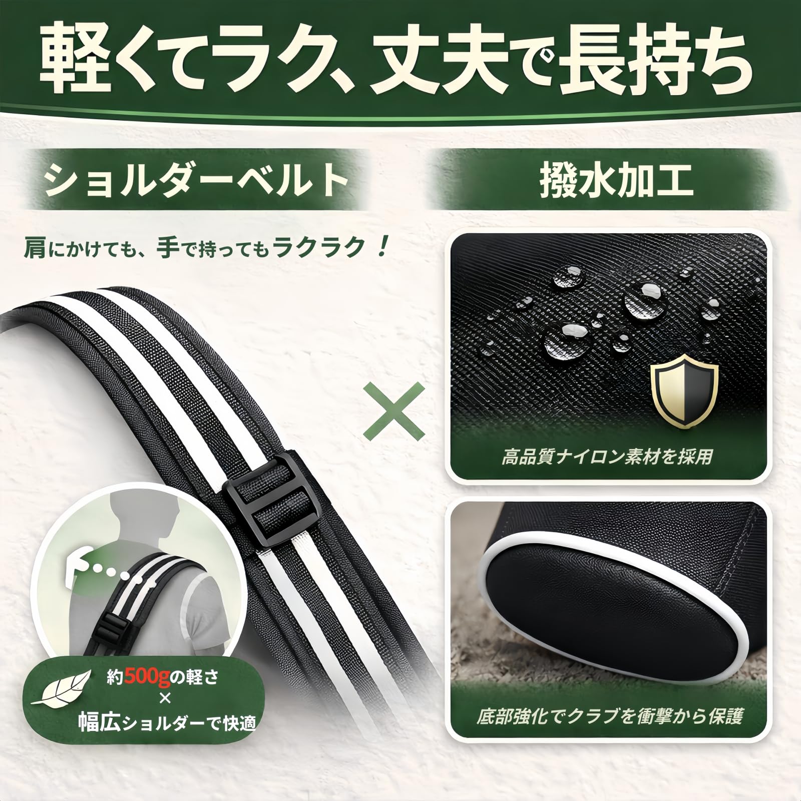 超コンパクト設計で、折りたたむとA4サイズ・厚さ約3cm。車のトランクやロッカー、キャディバッグにもすっきり収納できます。 No.1ウッドを含む3~7本のクラブを収納可能。上部オープンタイプで、クラブの出し入れもスムーズです。 収納ポケットとメッシュポケットを備え、ゴルフボールやタオル、小物類を分けて整理できます。 手持ち・肩掛けの2WAY仕様で、練習場への持ち運びも快適。クッション入りショルダーストラップと幅広ハンドルにより、肩や手への負担を軽減します。