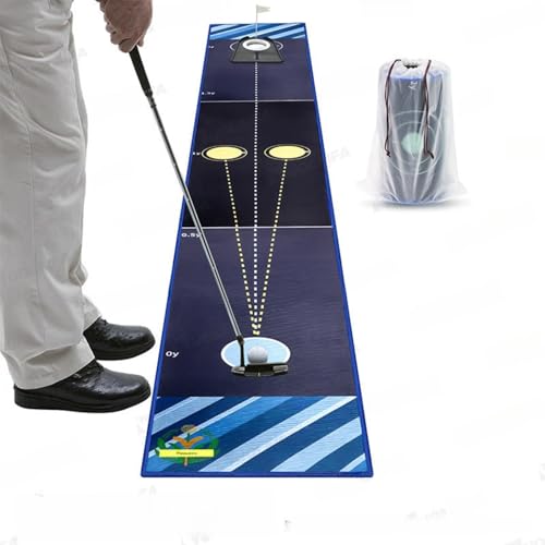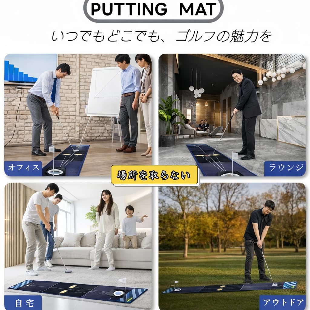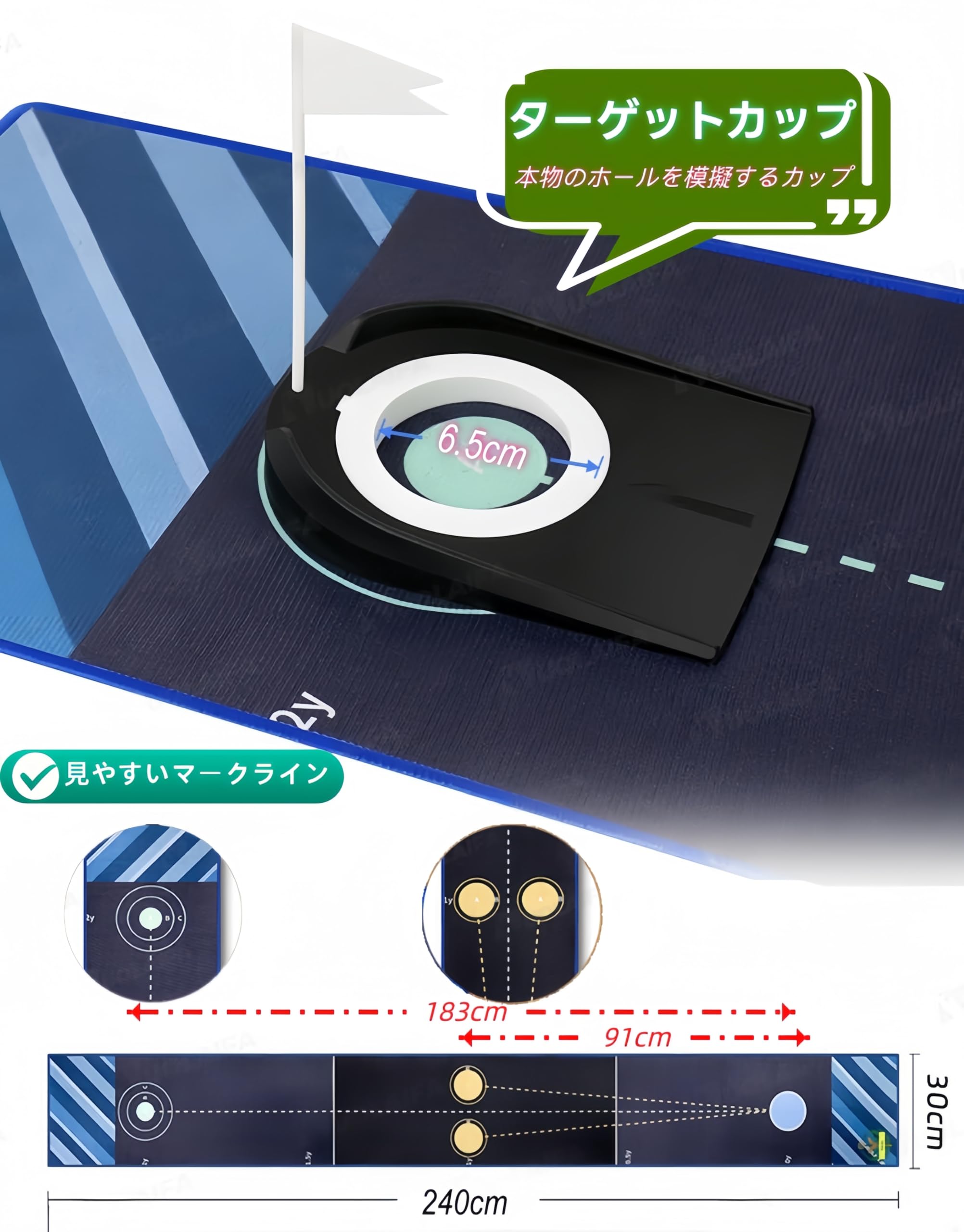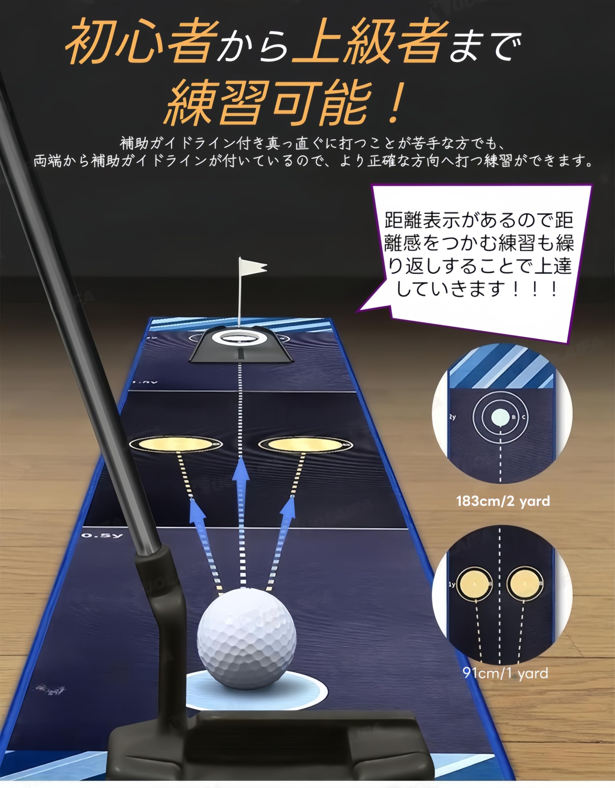 商品説明 自宅で手軽にパター練習ができる、コンパクトサイズのパター練習マットです。 サイズは240×30cmで、省スペース設計のため、限られたスペースでも設置しやすく、日常的な練習に適しています。 マットの両端から打つことで、異なる転がりスピードを体感できるダブルスピード仕様です。 さまざまなグリーンスピードを想定した練習ができ、距離感やタッチの向上に役立ちます。 表面には距離表示のプリントが施されており、右利き・左利きどちらにも対応しています。 距離ごとの練習を行うことで、パッティング精度の調整が可能です。 ターゲットカップ付きで、実際のグリーンを想定したカップイン練習が行えます。 ボールスピードのコントロール力を養い、安定したパッティングを目指せます。