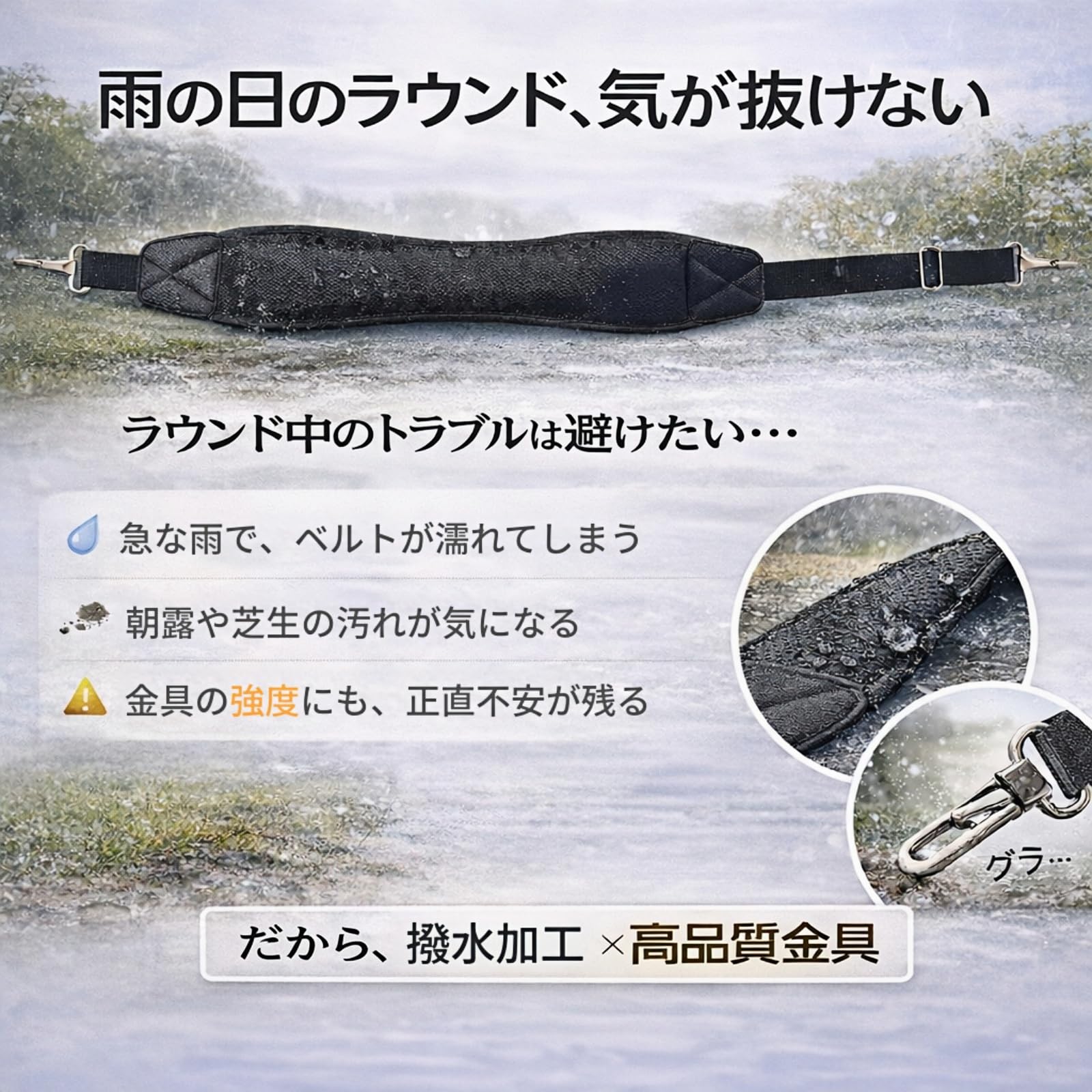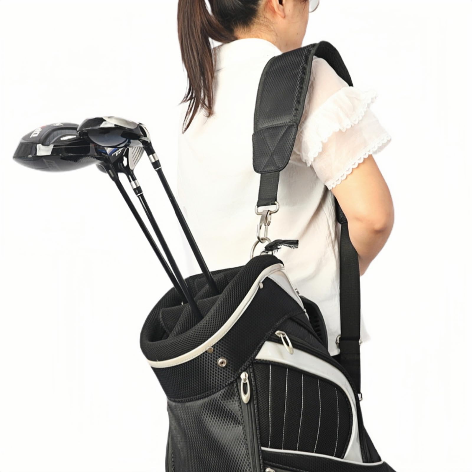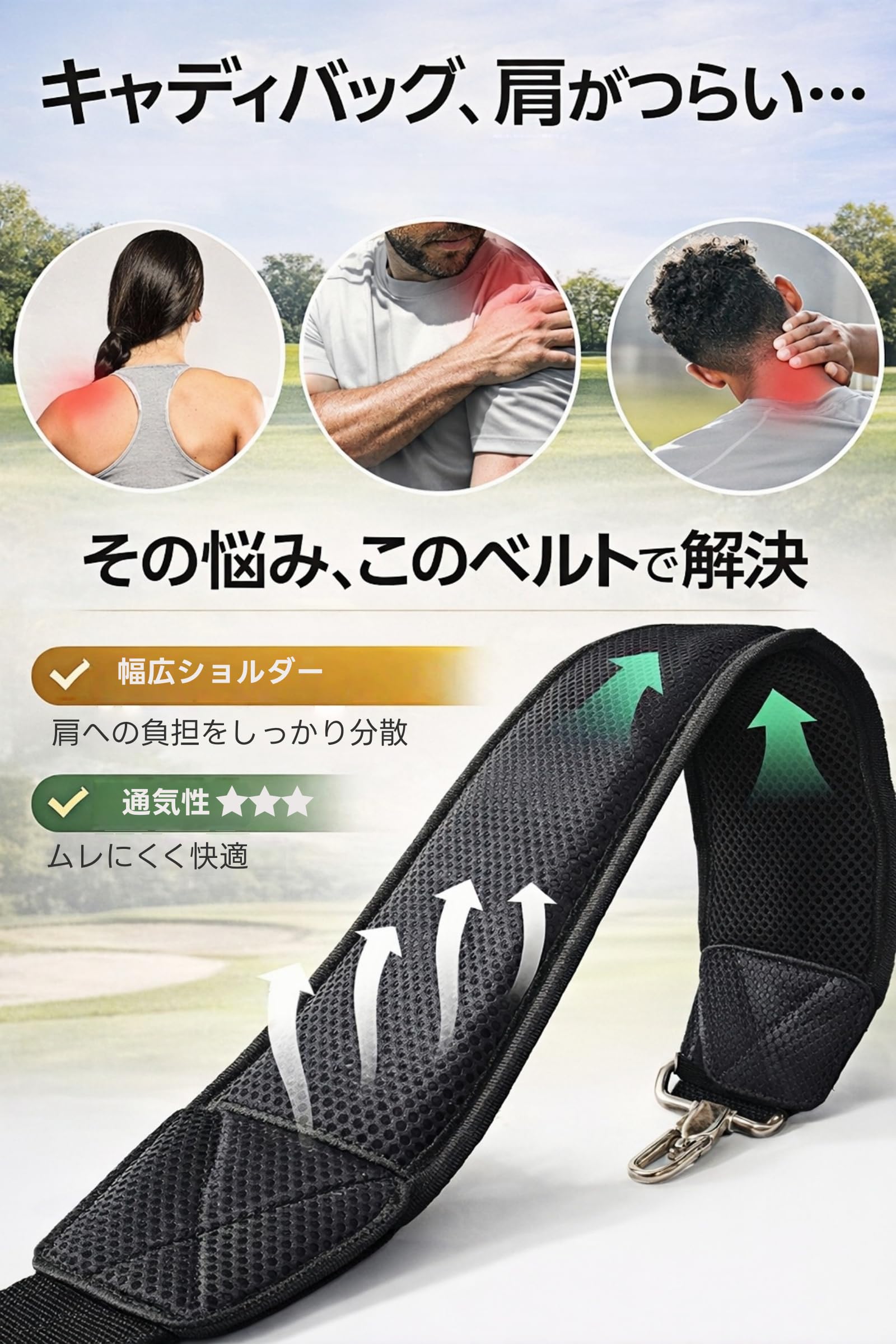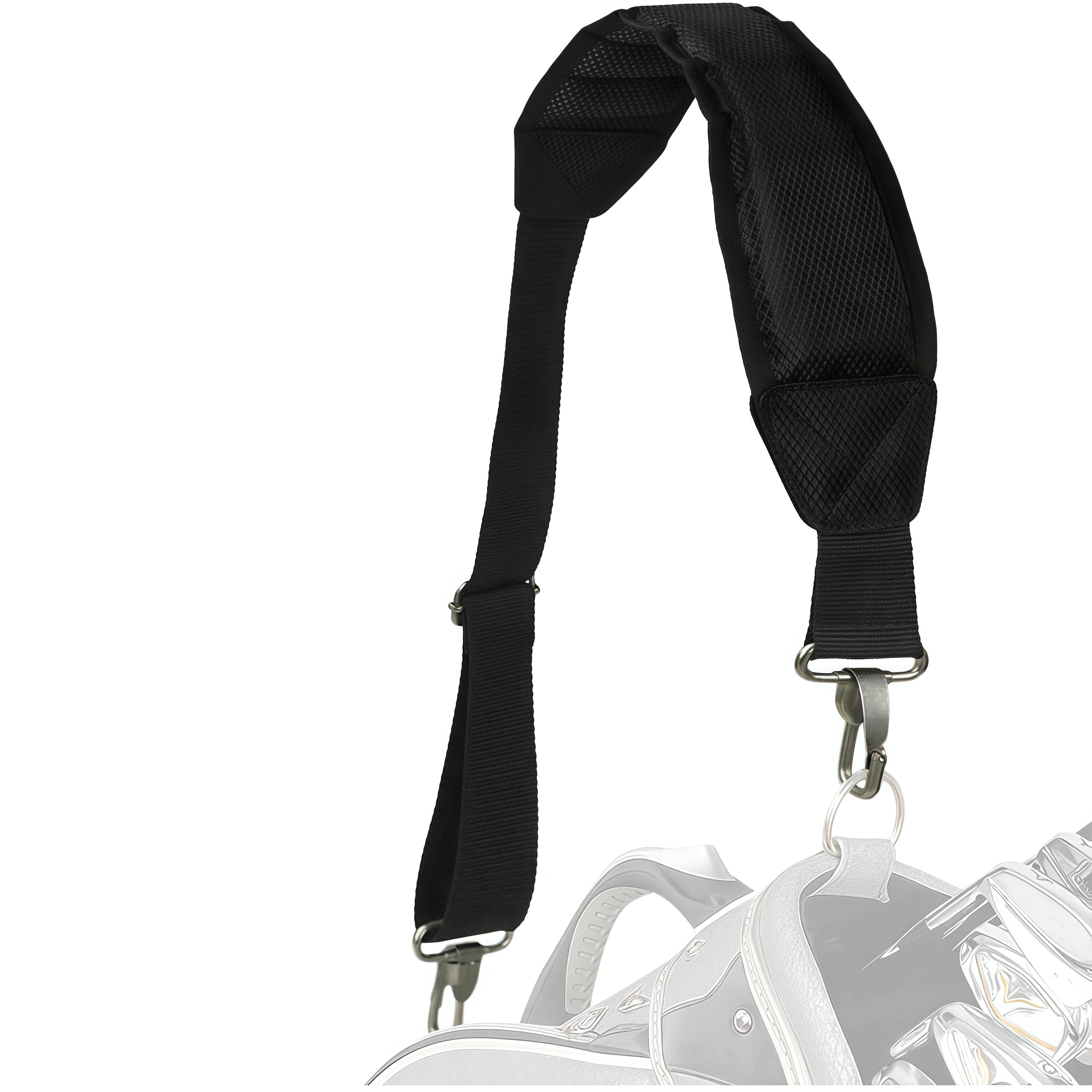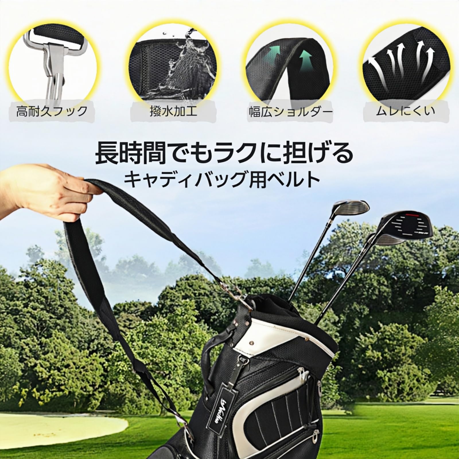 キャディバッグ用ショルダーベルト 耐久性のあるナイロン素材を使用し、撥水性にも配慮したショルダーベルトです。 金属製の調整金具で長さ調節ができ、しっかり固定できます。 幅広のショルダーパッドはクッション性と通気性があり、肩への負担を軽減。 長時間のラウンドでも快適に使用できます。