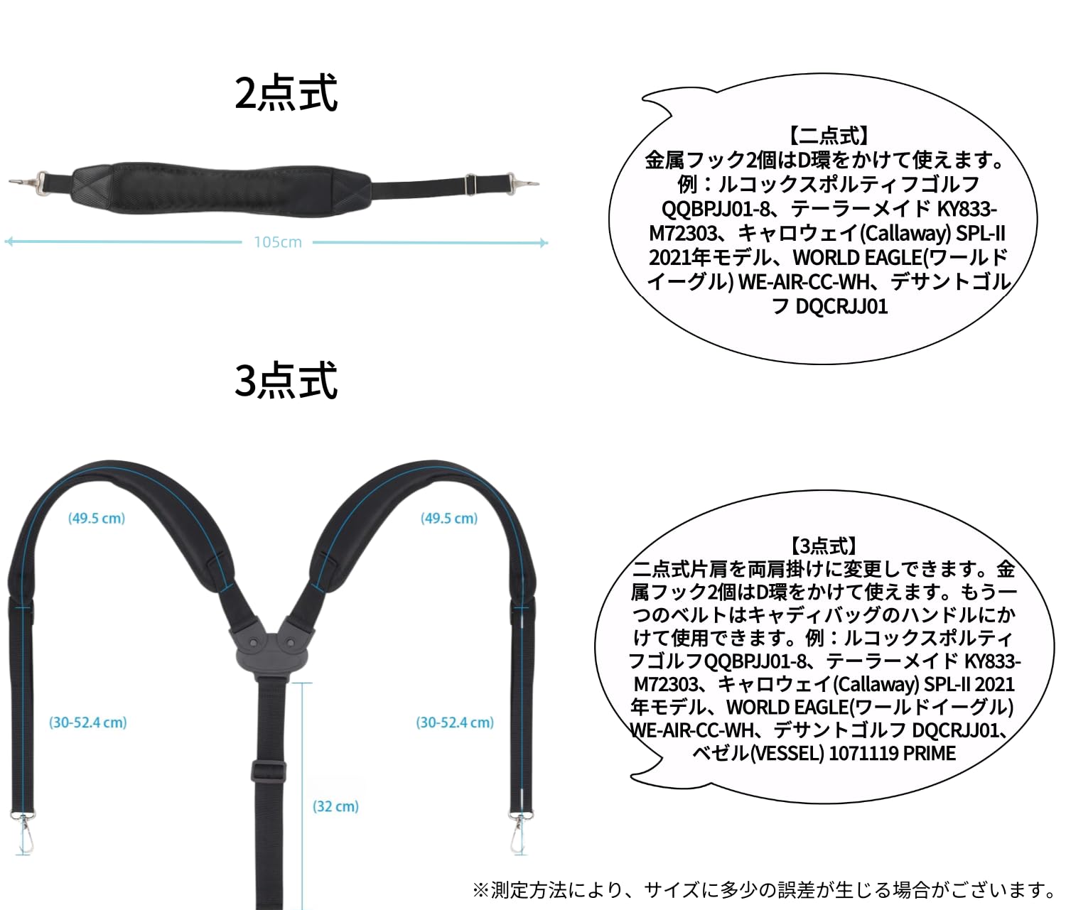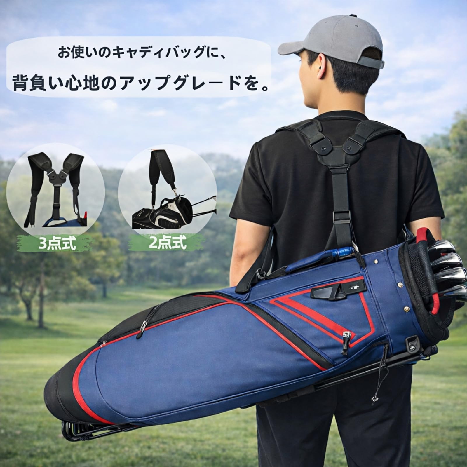 fona ショルダーストラップ ゴルフショルダーベルト キャディバッグ専用 2点式/3点式単品 ストラップ 肩掛けベルト 交換用 調節可能 クッション性 ナイロン製 負担を軽減 メタルフック 買い替え